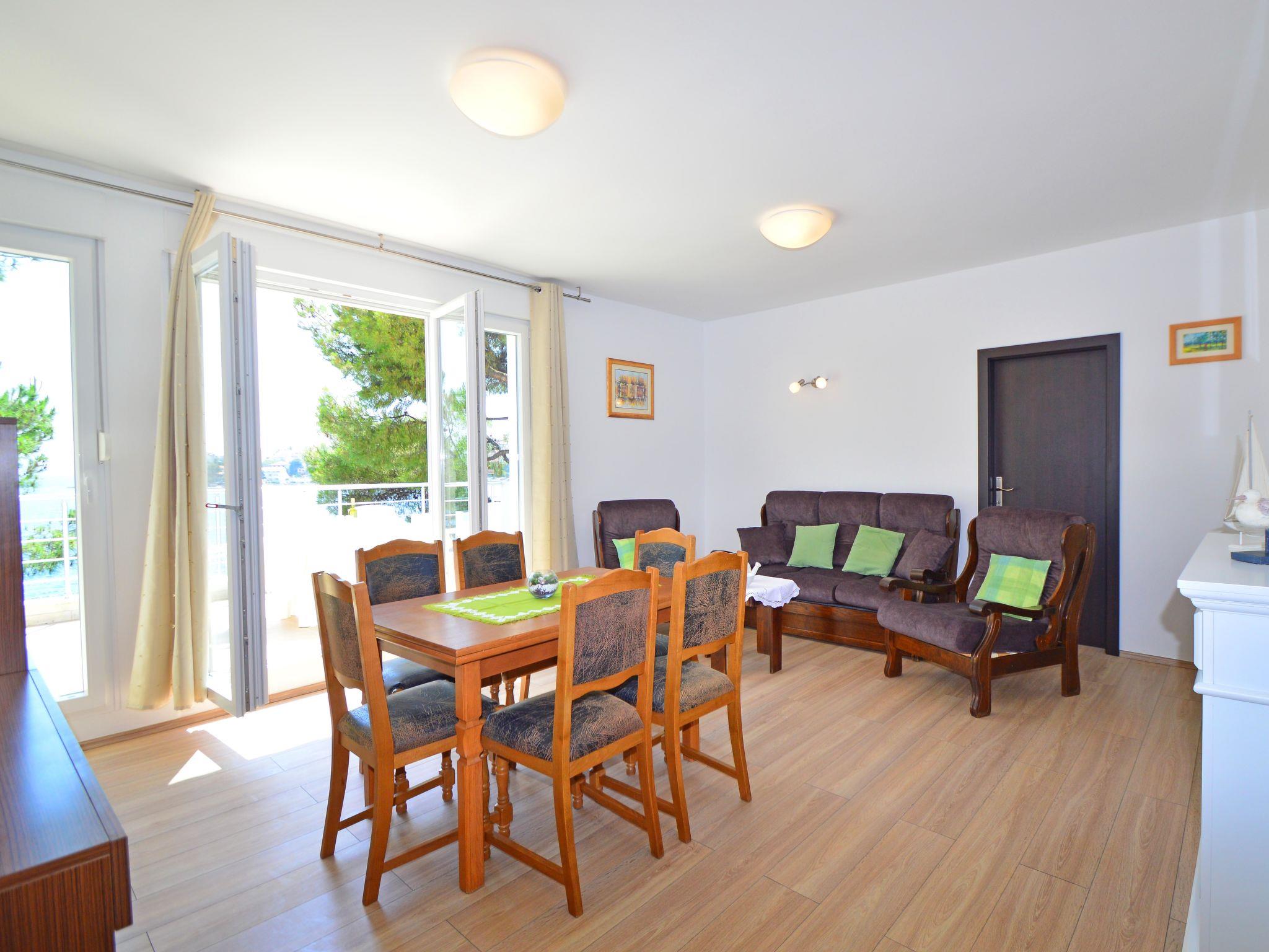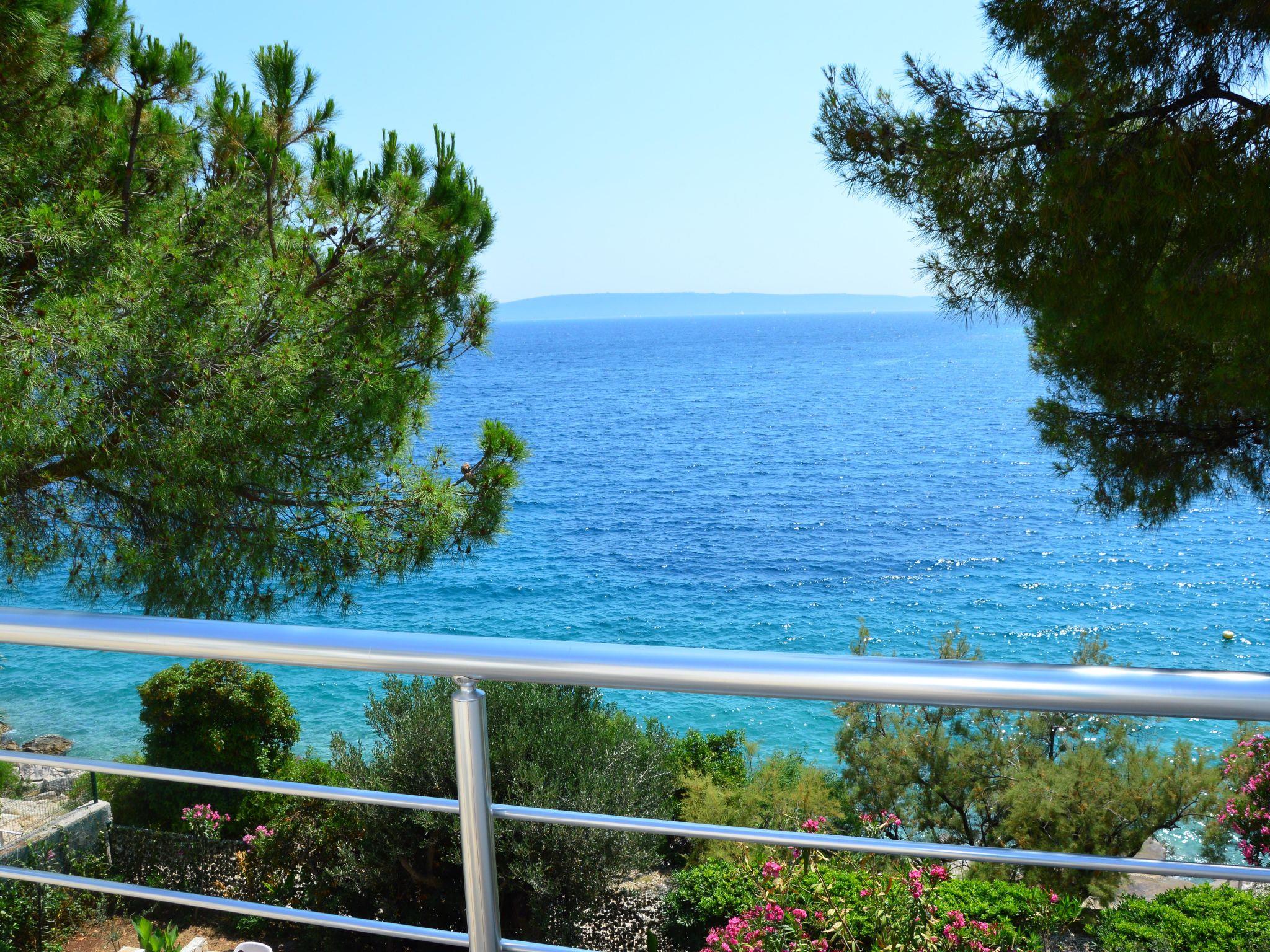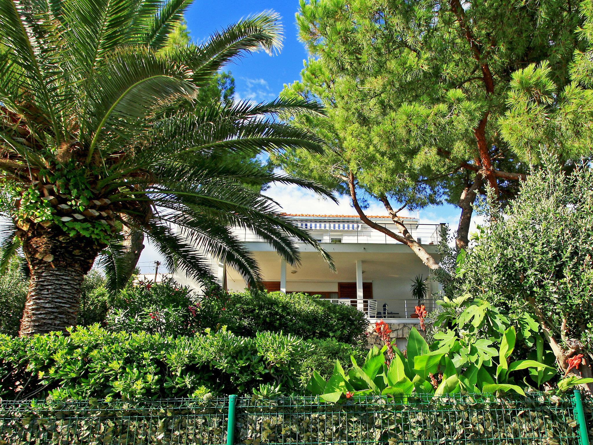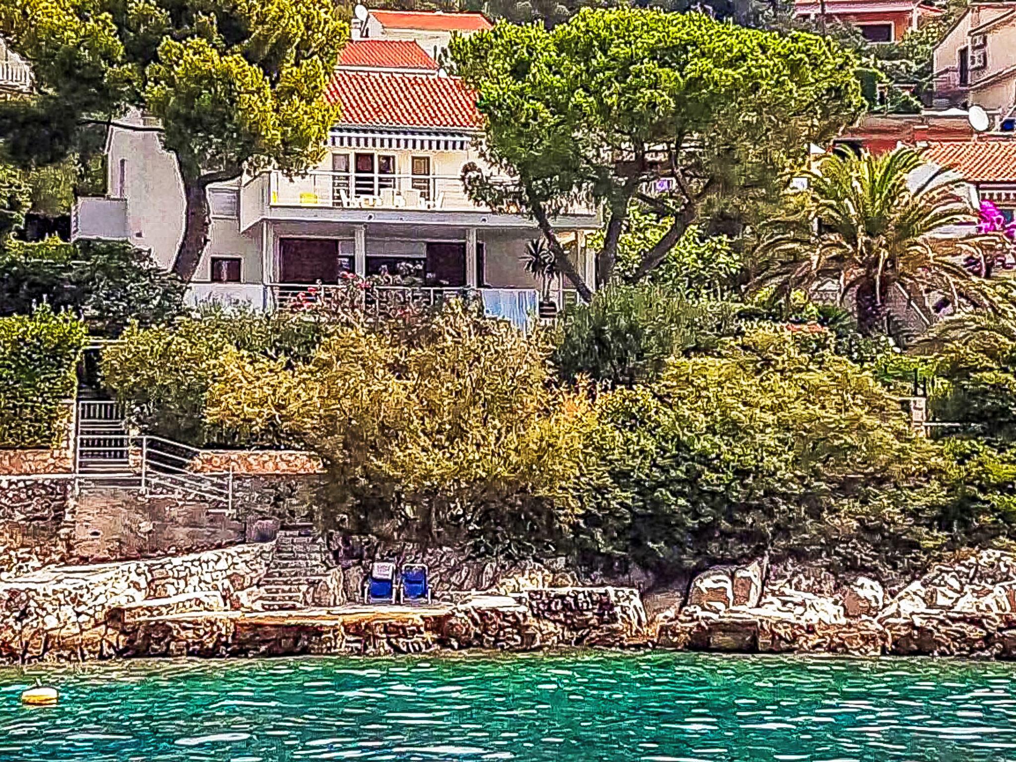 Okrug Gornji (Ciovo) 7 km from Trogir: 2-family house "Amiela", surrounded by trees. In the district of Mavarstica 1.5 km from the centre of Okrug Gornji, in a quiet, sunny position, 15 m from the sea, 15 m from the beach, in the countryside. For shared use: terraced garden (fenced) with flowers and trees. Outdoor shower, barbecue. In the house: internet access. Footpath (20 steps) to the house. Roofed, parking at 60 m on the premises. Shop 1.5 km, restaurant 1.5 km, bus stop 1.7 km, pebble beach 250 m, rocky beach 20 m, diving center 600 m, concrete beach 15 m.