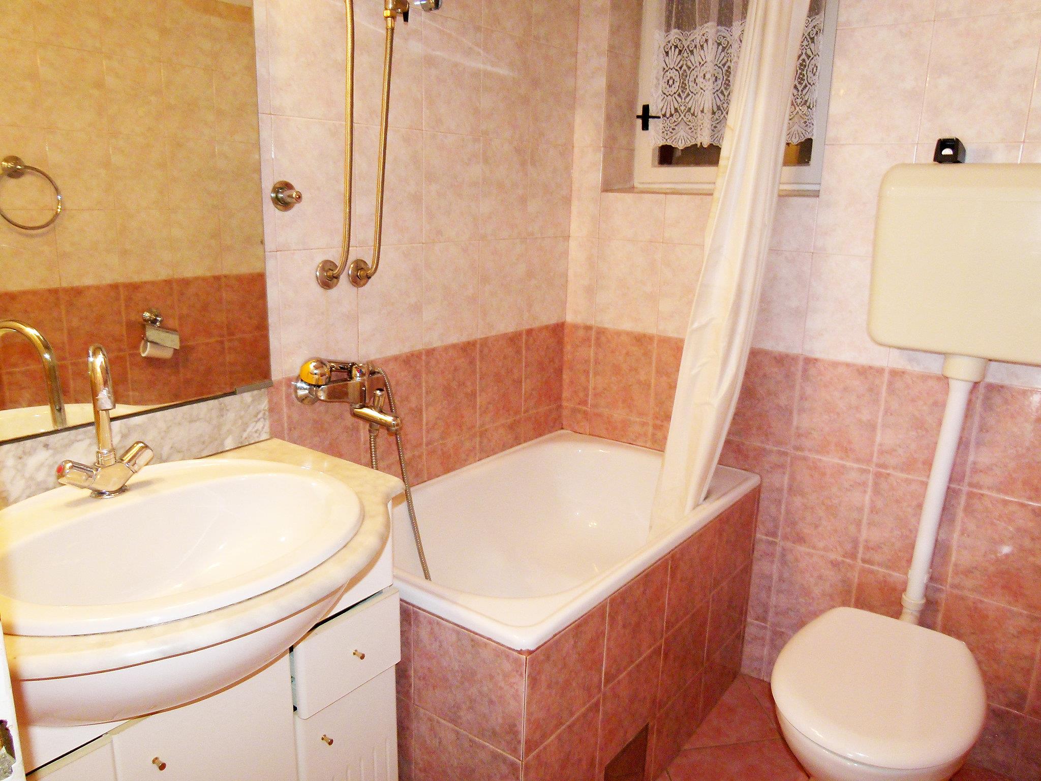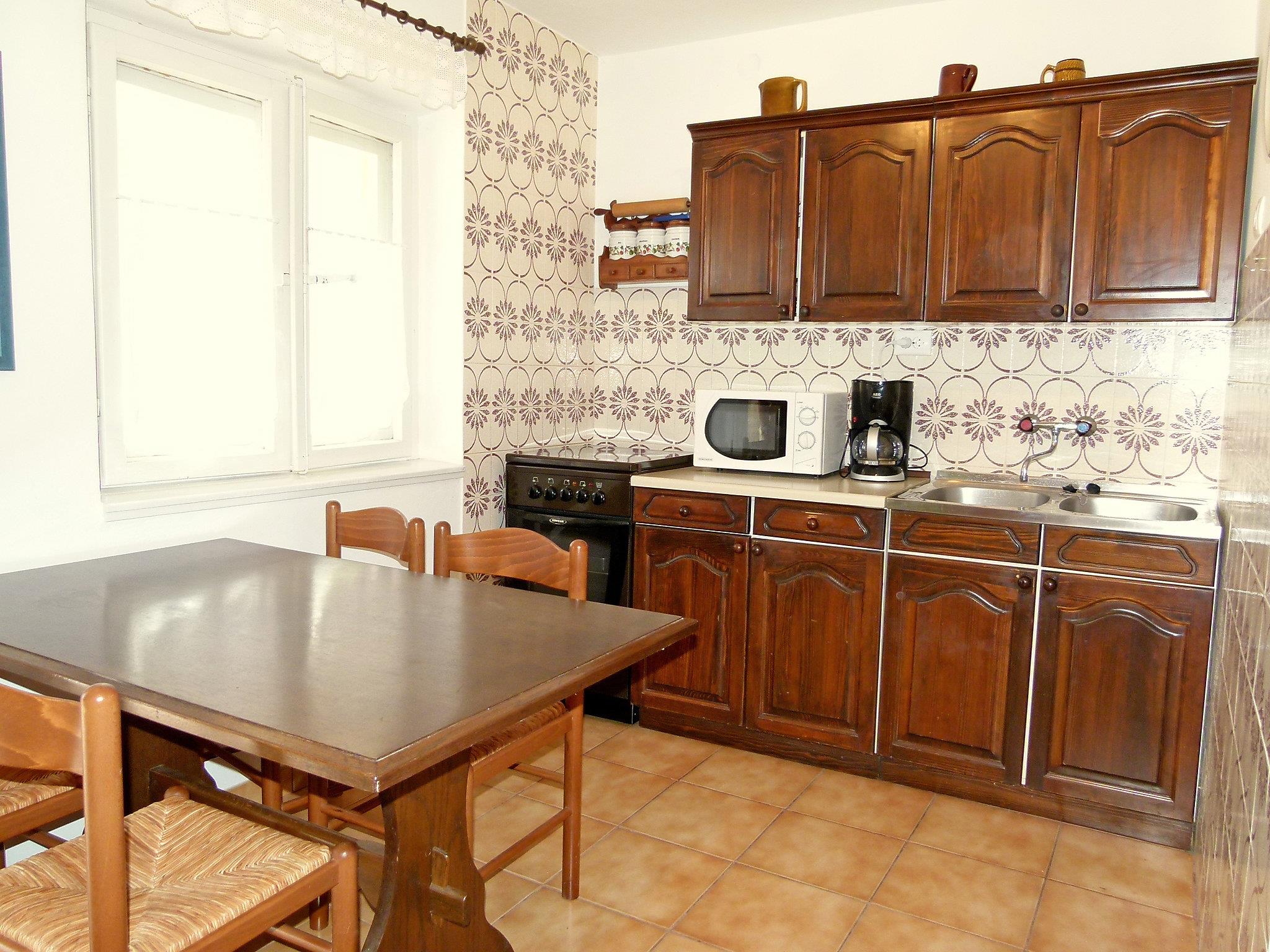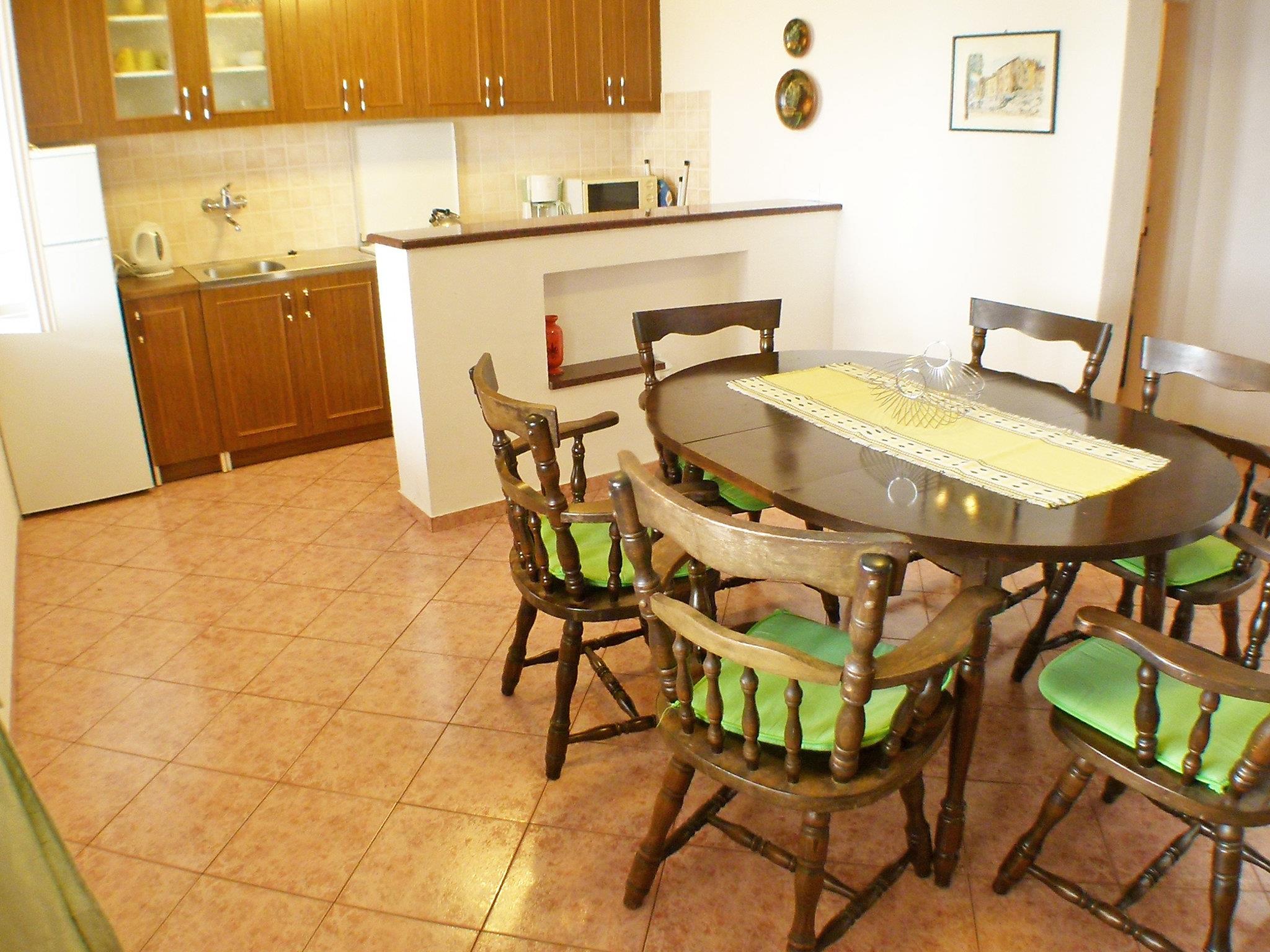6-room apartment 120 m2 on 2 levels, on the ground floor, south facing position. Comfortable furnishings: living/dining room with 1 sofabed (120 cm, length 200 cm), satellite TV (flat screen), air conditioning. Exit to the terrace. 1 room with 1 double bed (2 x 90 cm, length 200 cm), fan. Open kitchen (4 hot plates, oven, microwave, freezer, electric coffee machine). Bath/WC, shower/WC. Upper floor: (exterior staircase) living/dining room with satellite TV (flat screen), air conditioning. Exit to the terrace. 1 room with 1 double bed (2 x 90 cm, length 200 cm). Exit to the balcony. 1 room with 1 double bed (2 x 80 cm, length 190 cm). 1 room with 1 sofabed (160 cm, length 200 cm). Open kitchen (oven, dishwasher, 4 ceramic glass hob hotplates, microwave, freezer, electric coffee machine). Bath/WC. Balcony 2 m2, terrace 30 m2 partly roofed, south facing position terrace 26 m2, roofed. Terrace furniture, electric barbecue. Very beautiful view of the sea. Facilities: Internet (WiFi, free).