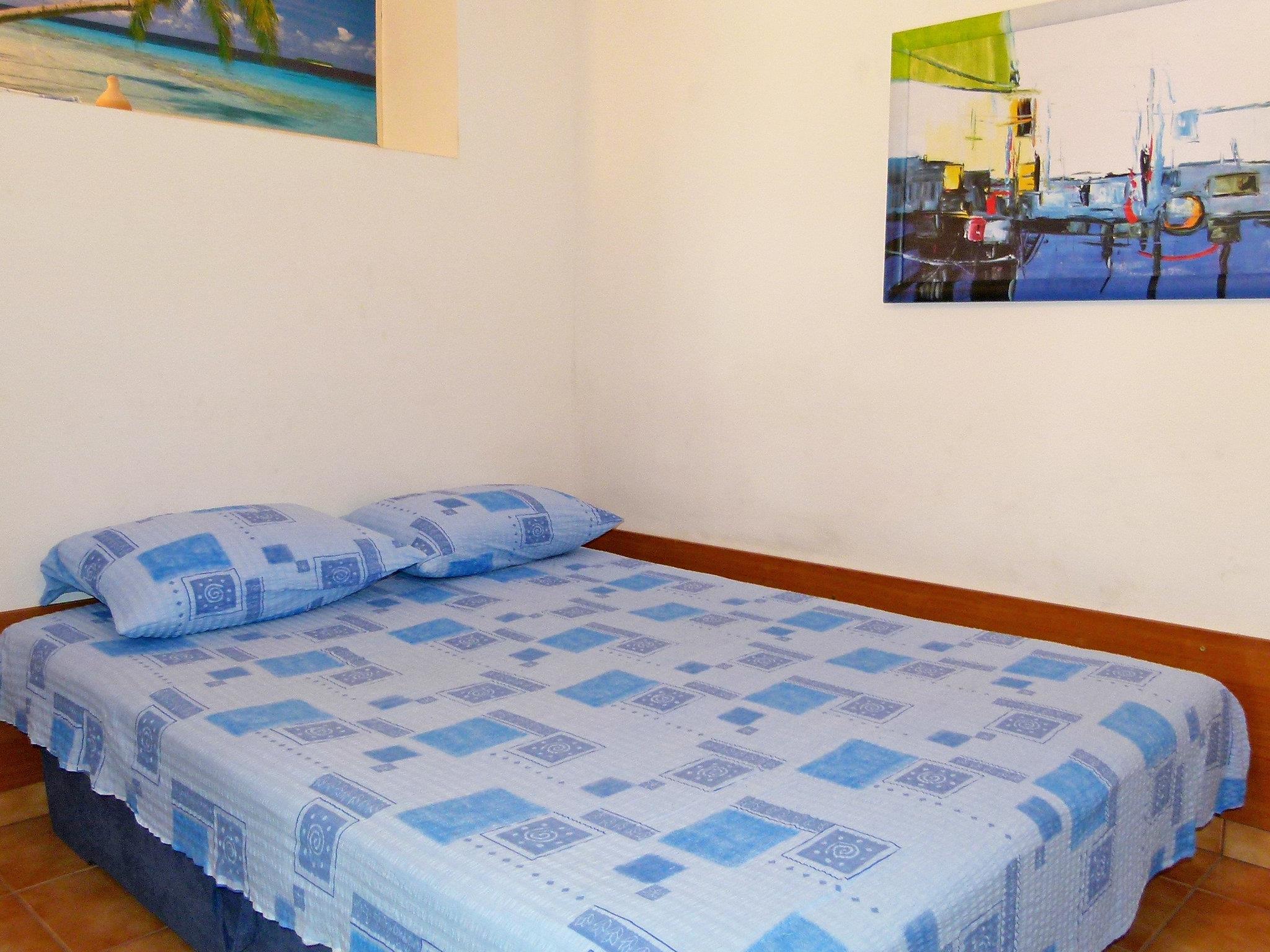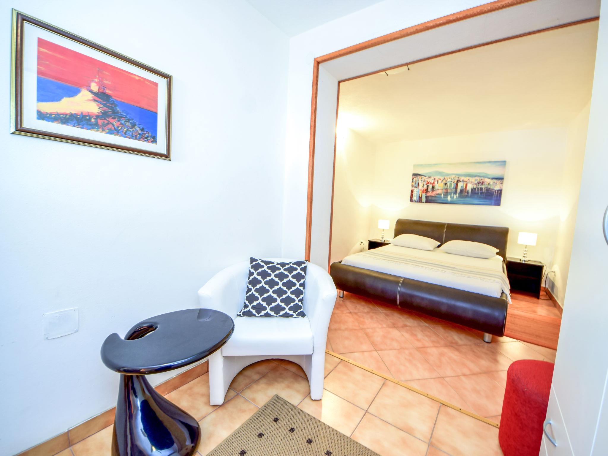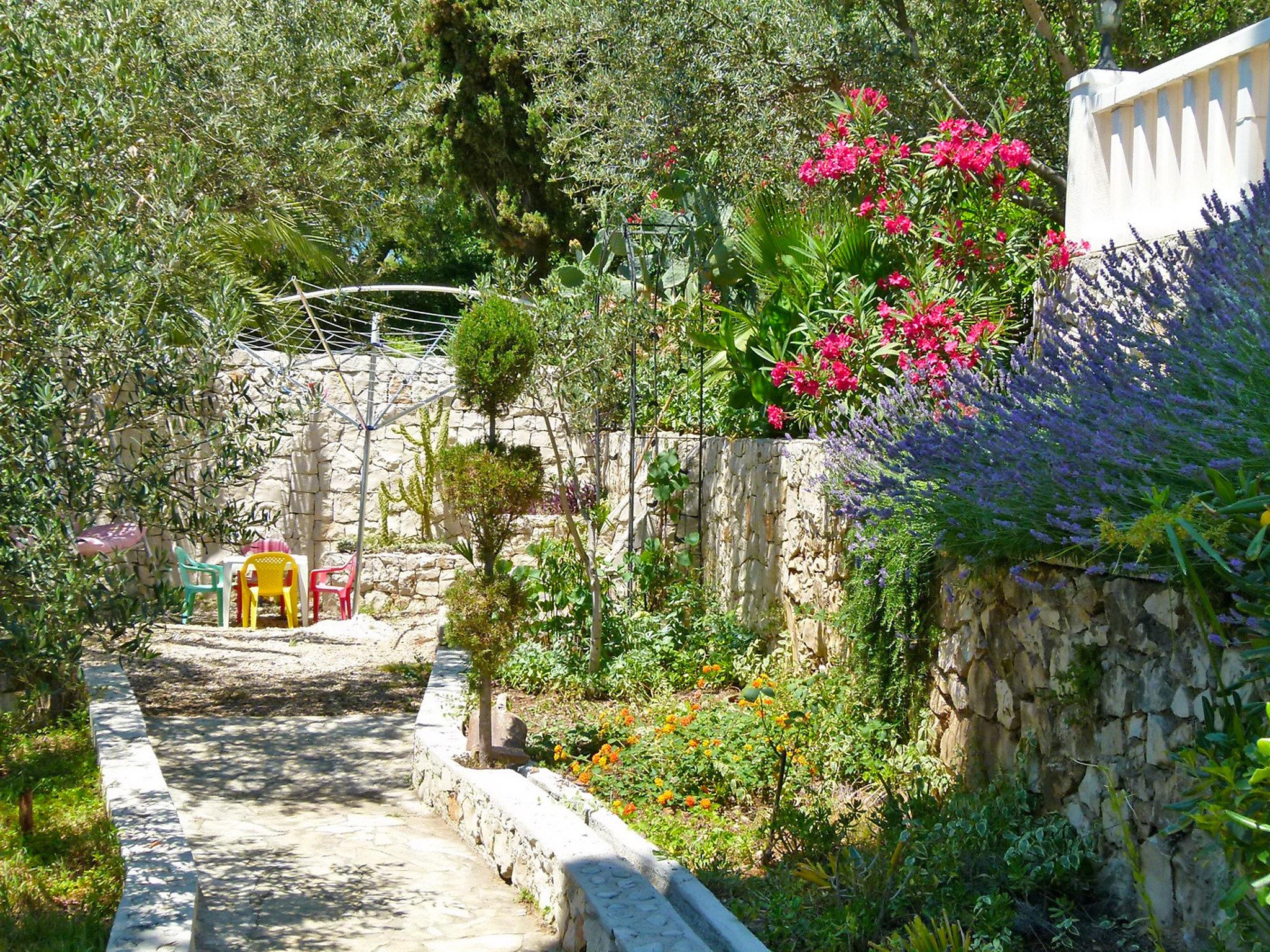 6-room apartment 120 m2 on 2 levels, on the ground floor, south facing position. Comfortable furnishings: living/dining room with 1 sofabed (120 cm, length 200 cm), satellite TV (flat screen), air conditioning. Exit to the terrace. 1 room with 1 double bed (2 x 90 cm, length 200 cm), fan. Open kitchen (4 hot plates, oven, microwave, freezer, electric coffee machine). Bath/WC, shower/WC. Upper floor: (exterior staircase) living/dining room with satellite TV (flat screen), air conditioning. Exit to the terrace. 1 room with 1 double bed (2 x 90 cm, length 200 cm). Exit to the balcony. 1 room with 1 double bed (2 x 80 cm, length 190 cm). 1 room with 1 sofabed (160 cm, length 200 cm). Open kitchen (oven, dishwasher, 4 ceramic glass hob hotplates, microwave, freezer, electric coffee machine). Bath/WC. Balcony 2 m2, terrace 30 m2 partly roofed, south facing position terrace 26 m2, roofed. Terrace furniture, electric barbecue. Very beautiful view of the sea. Facilities: Internet (WiFi, free).