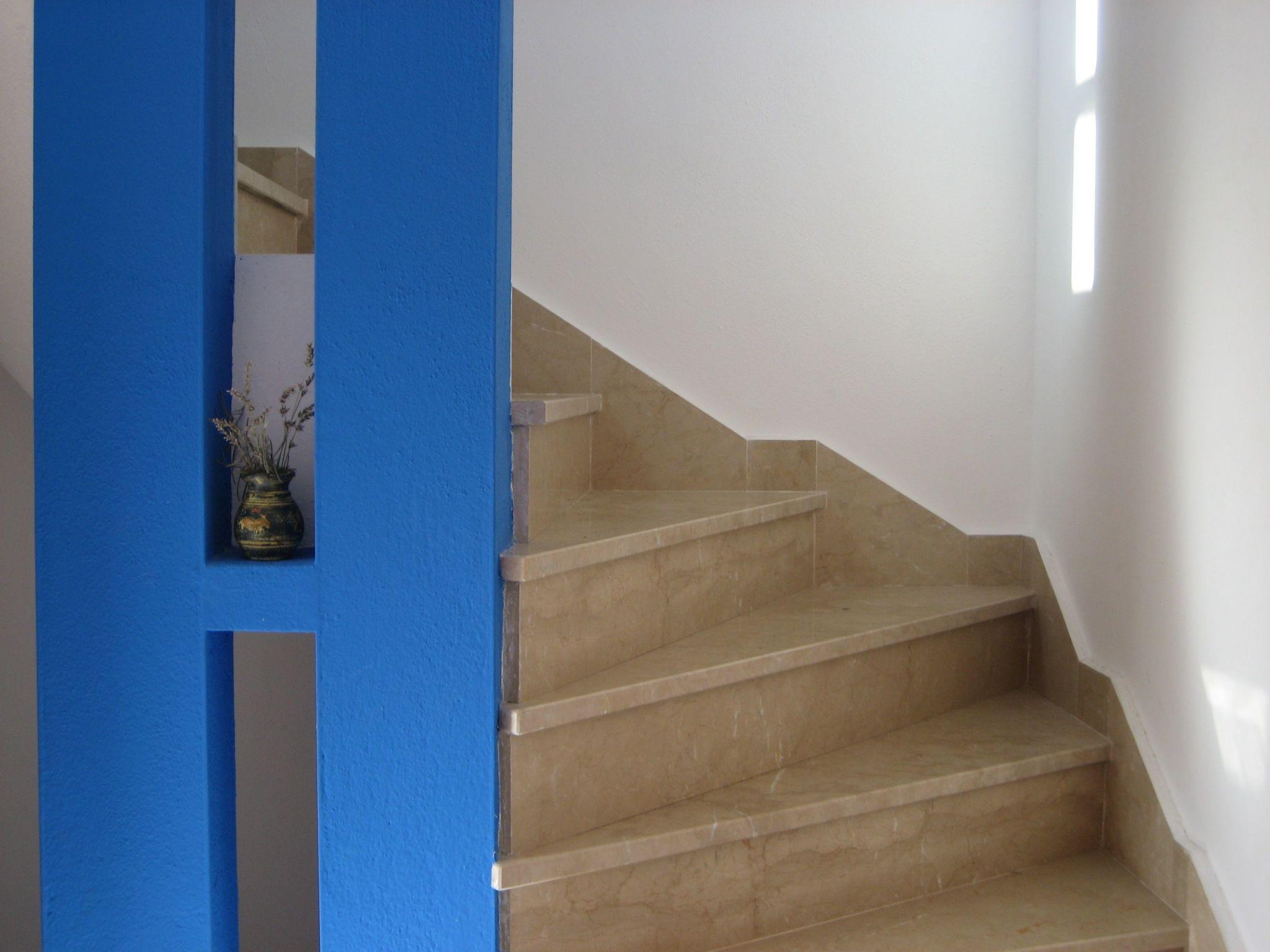 The private terrace on the ground floor has a dining table with six chairs. You can enjoy a beautiful view from the two furnished balconies on the first floor and two terraces on the second floor.