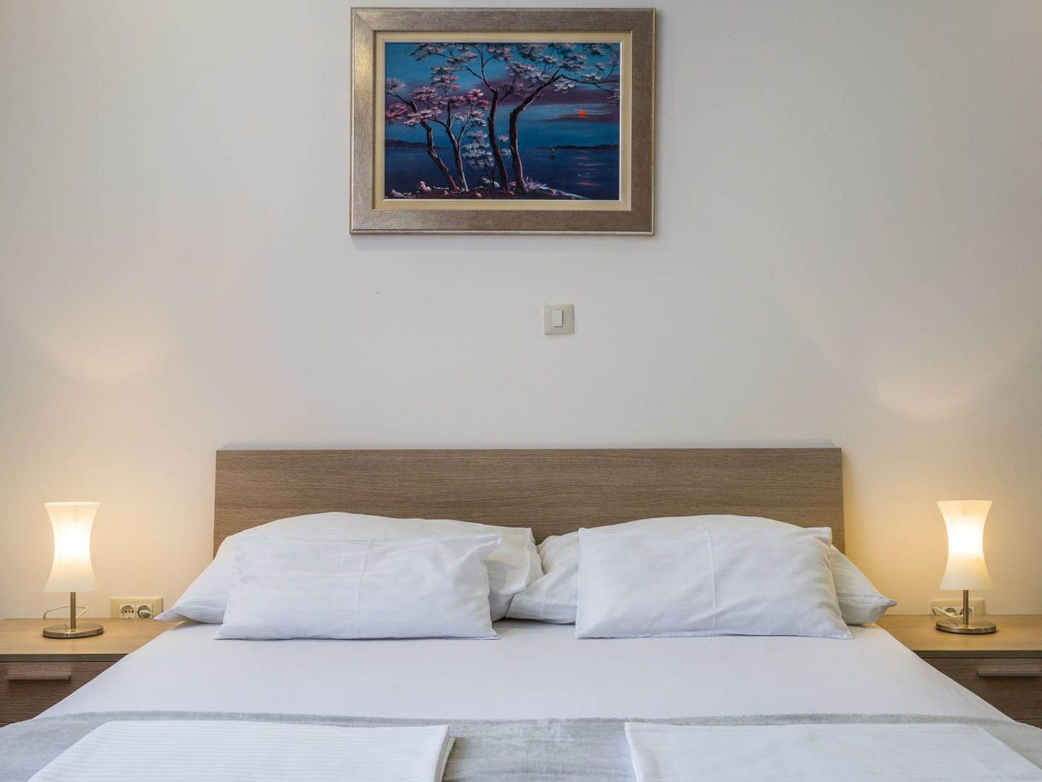 Apartment Golden C1 is a duplex apartment covering the ground floor and the first floor of the building. Carefully designed interior with clean lines creates an ambience of elegance and luxury which combined with the wondrous surroundings leaves no one indifferent. Luxurious apartment Golden C1 consists of 3 double bedrooms with en suite bathrooms, contemporary living room with dining area and well equipped open concept kitchen. Sliding glass door leads from the living room to a beautiful covered seaview terrace equipped with outdoor furniture and outdoor electric grill. The apartment is suitable accommodation for 6 persons. Apartment Golden C1 is fully air conditioned and equipped with SAT-TV, Wi-fi, safe, iron and ironing board, washing machine, electric outdoor barbecue, hair dryer, stove, oven, hood, refrigerator with freezer, dish washer, electric kettle and coffee maker. Baby cot and high chair, as well as berth for boats, are available on request. Guests are provided with free parking. Guests are provided with welcome drinks on their arrival.