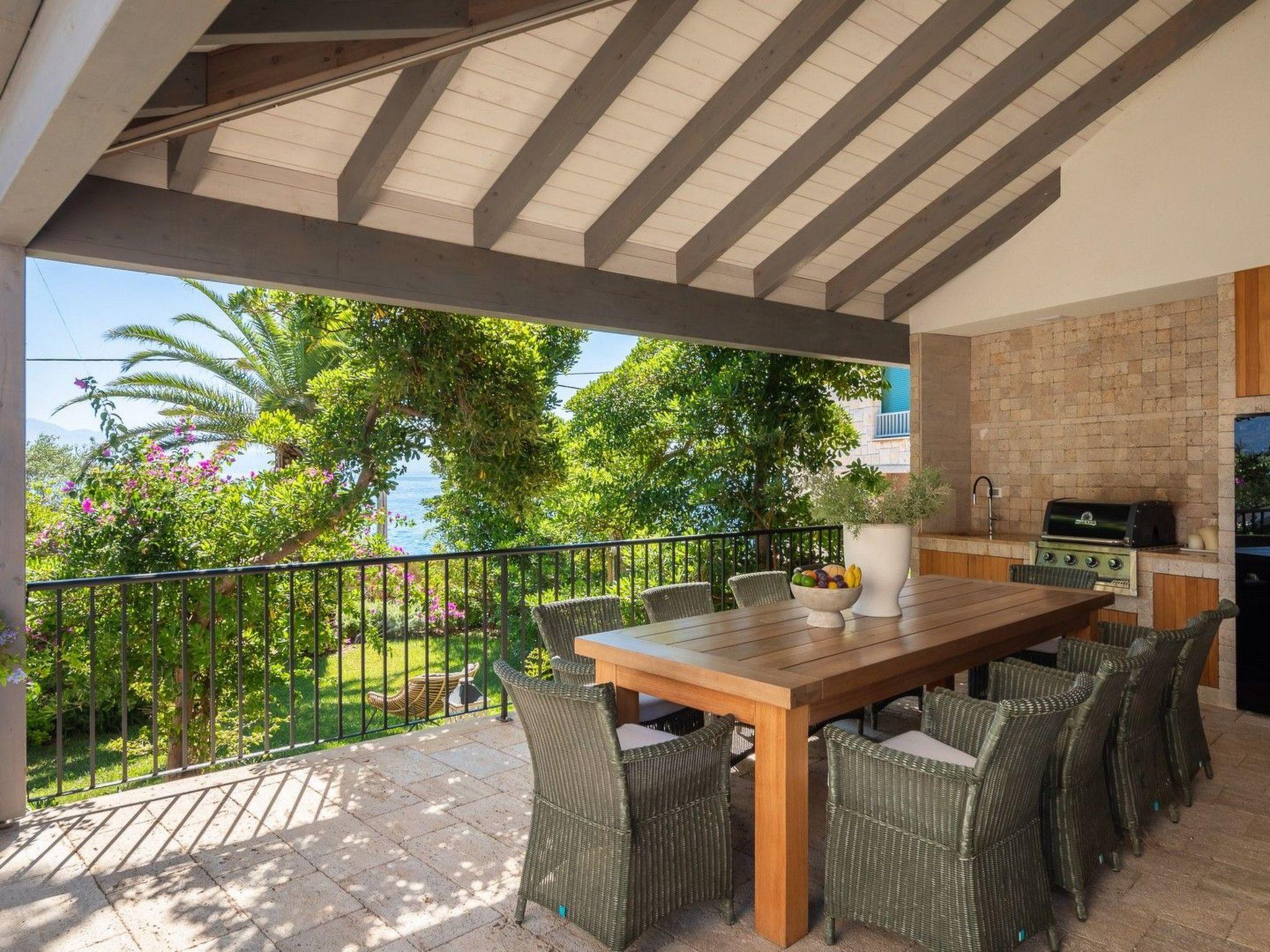On the ground floor there is a living room, well equipped kitchen and dining area with a table for 5 people and one bathroom with a shower. The doors from the living room and kitchen lead to the covered terrace. This inviting space is furnished with outdoor furniture providing beautiful views of the sea and the garden.