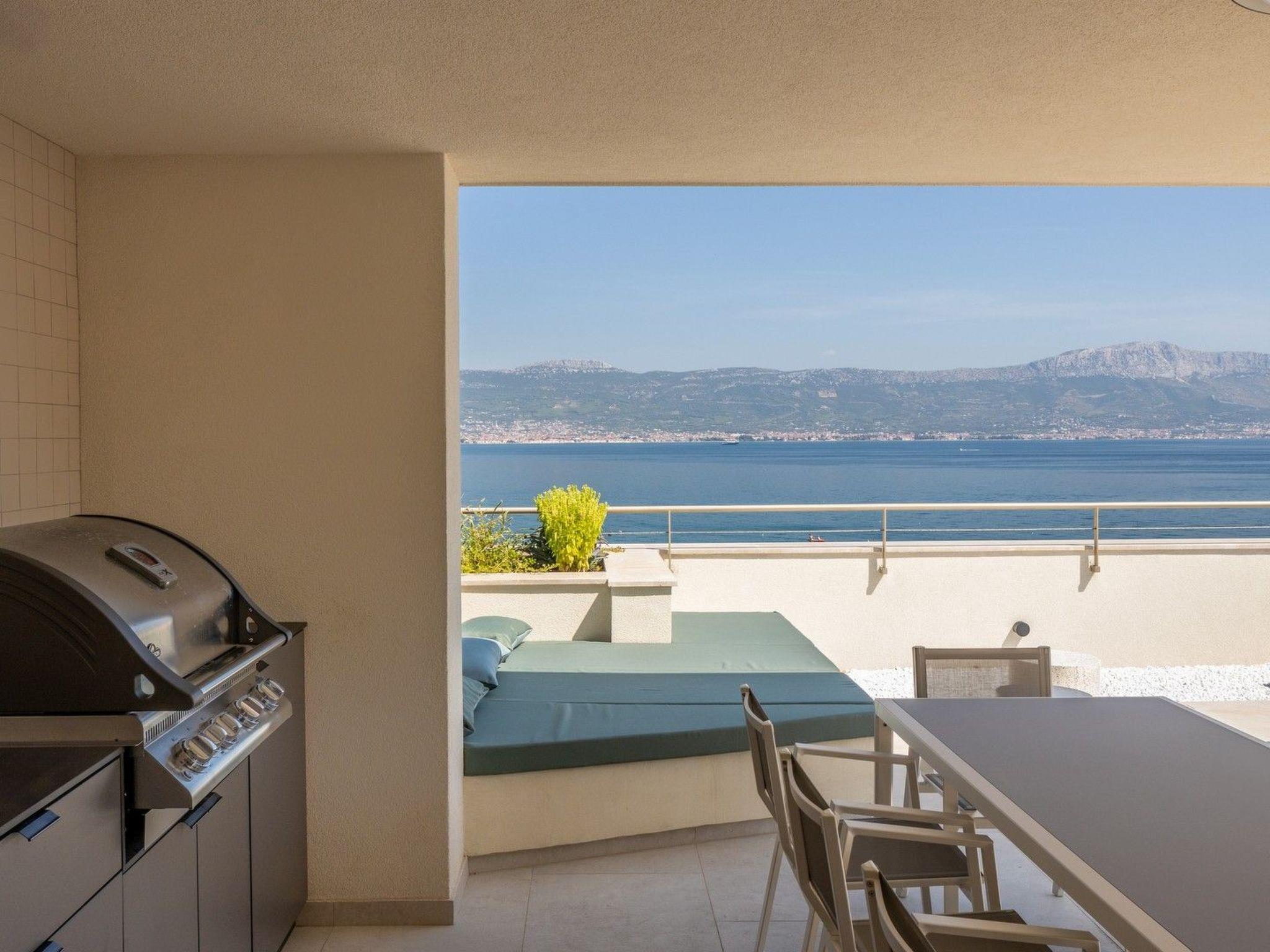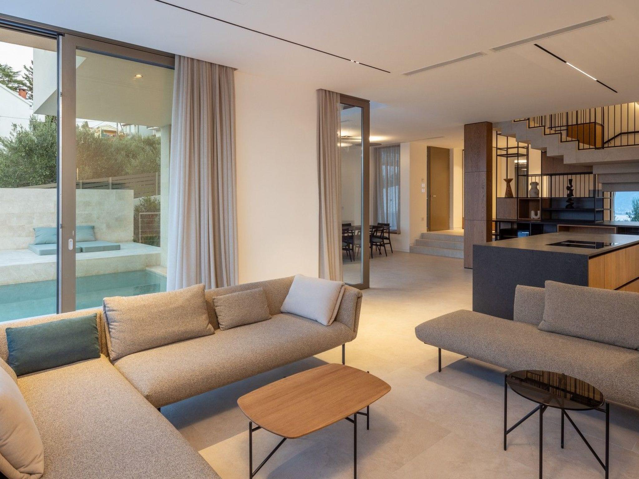 This superbly furnished villa is part of the beachfront complex, Golden. It blends elegance, luxury, and functionality. Situated just 30 meters from a stunning pebble beach and crystal-clear sea, the villa offers an awe-inspiring panoramic view of the coast, mountains, and the city of Split.