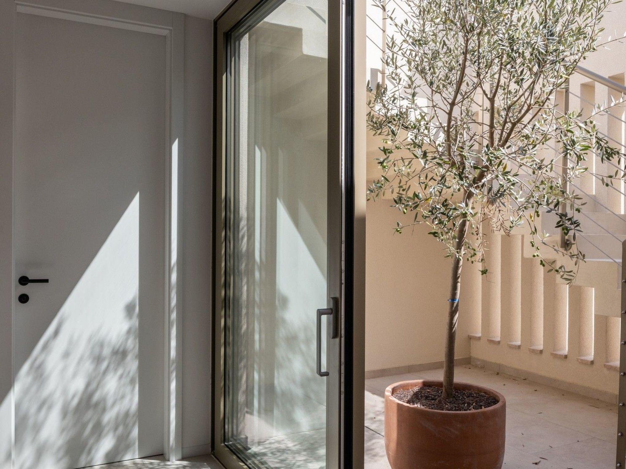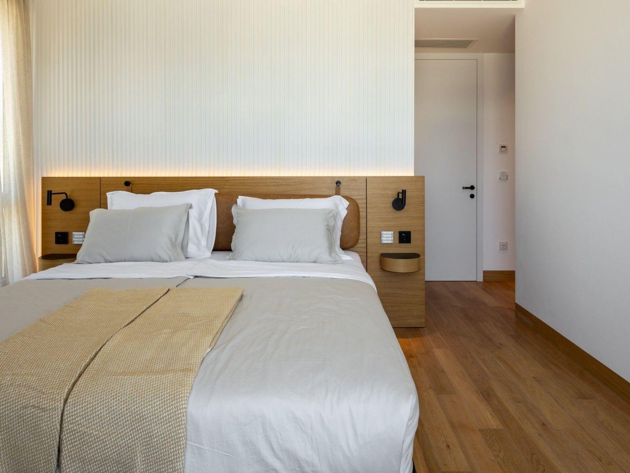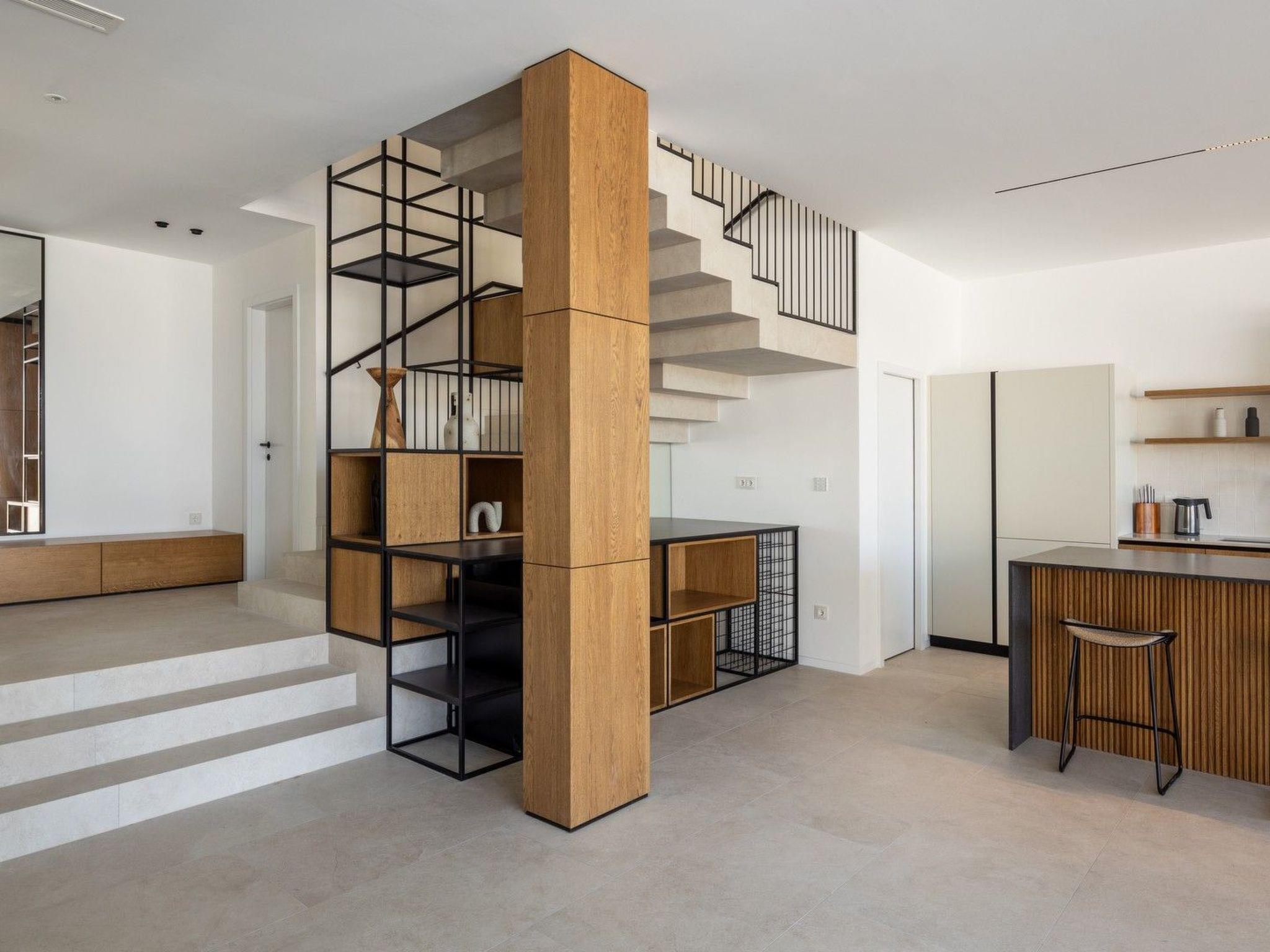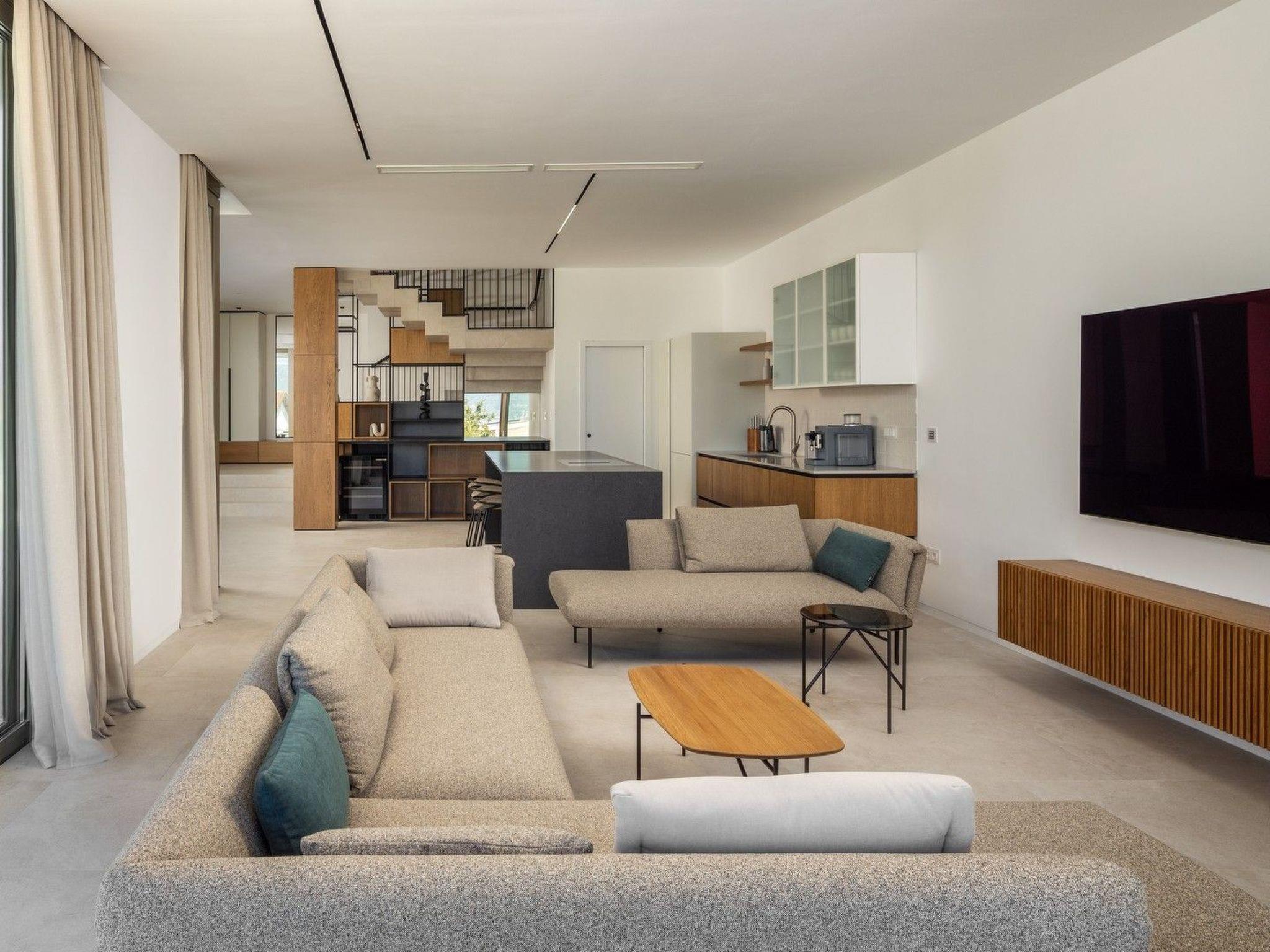 In the basement, you can find a laundry room, a small gym, a Turkish sauna and half bath. On the ground floor, you’ll find a spacious living room adorned with high-quality furniture, a dining area boasting a large table and chairs for 8 persons, complemented by a well-equipped, luxurious open-concept kitchen. Large sliding glass doors lead from the living room and kitchen to the terrace. This inviting space is furnished with outdoor furniture providing views of the sea and the garden.