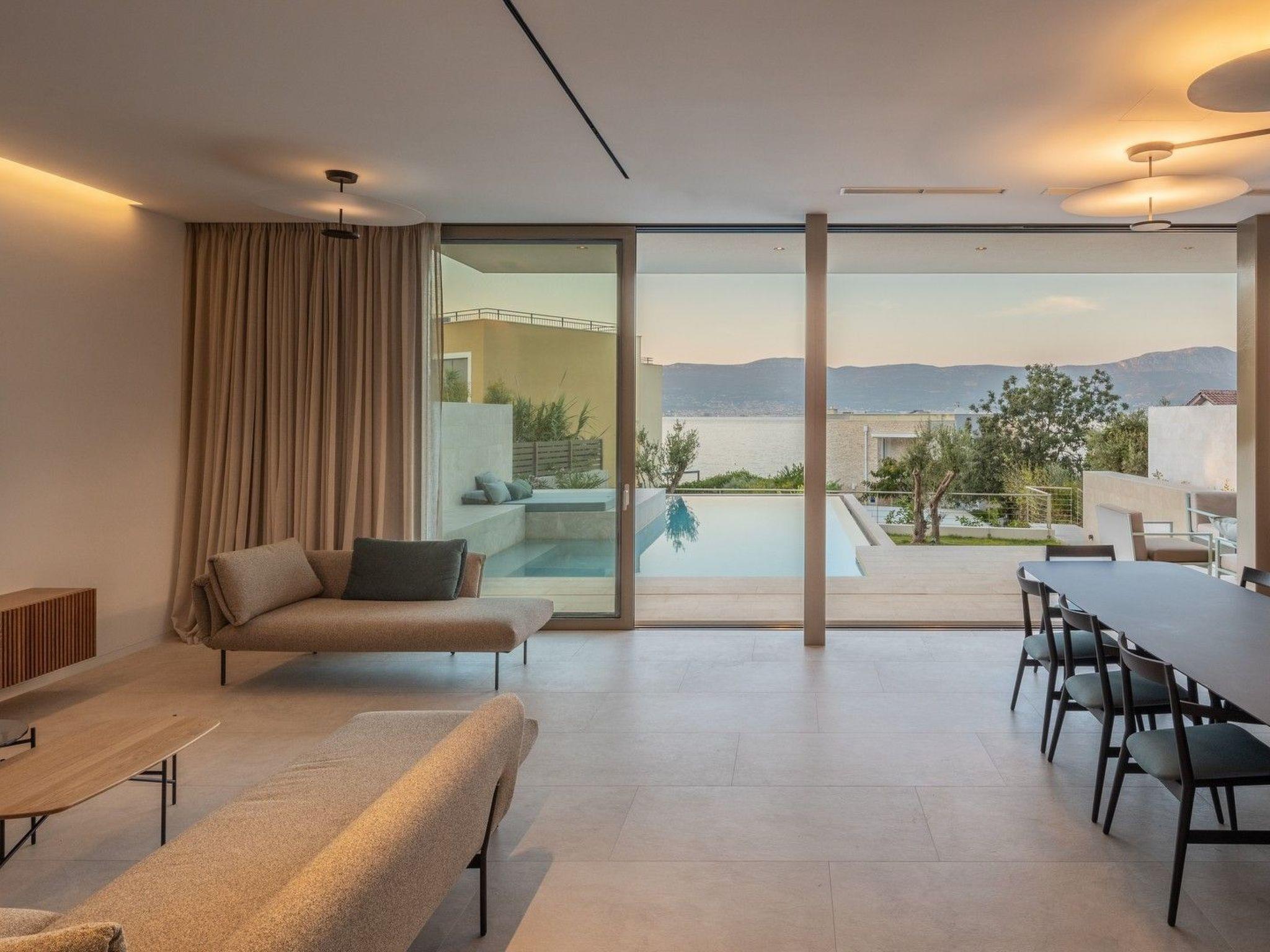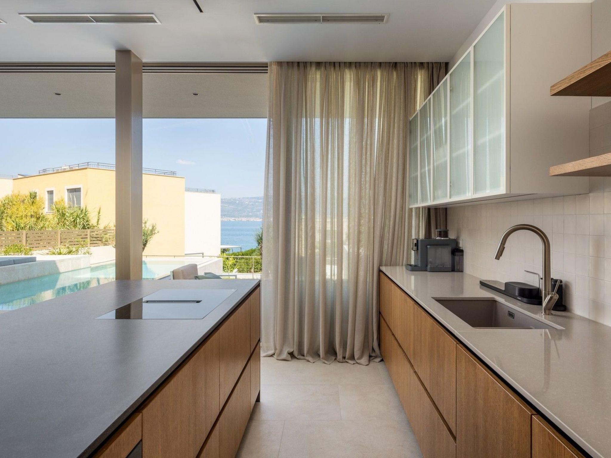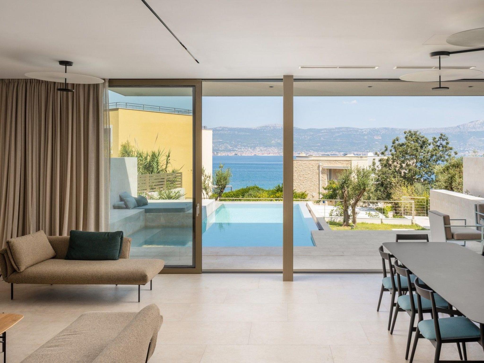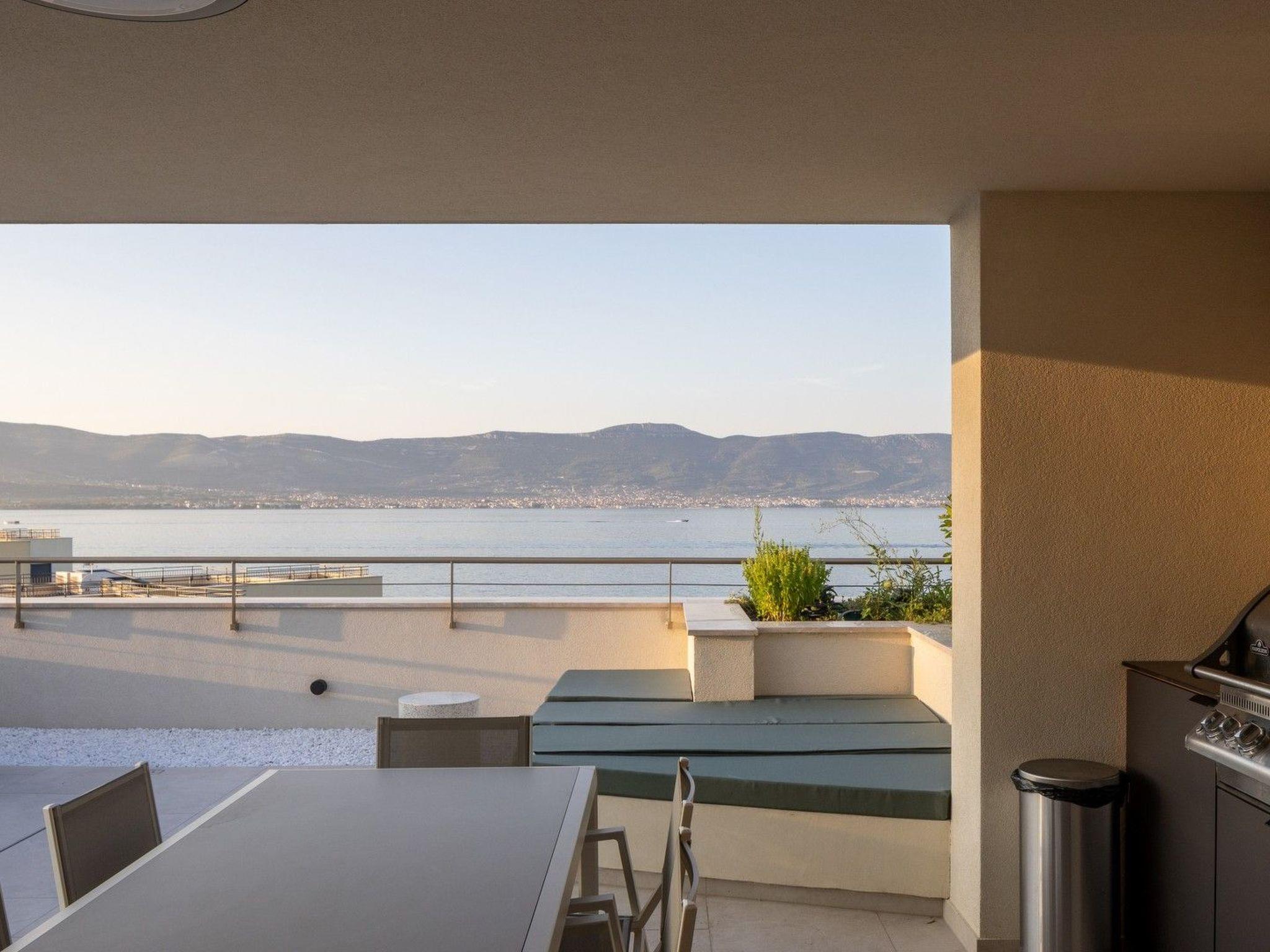 This superbly furnished villa is part of the beachfront complex, Golden. It blends elegance, luxury, and functionality. Situated just 30 meters from a stunning pebble beach and crystal-clear sea, the villa offers an awe-inspiring panoramic view of the coast, mountains, and Split.