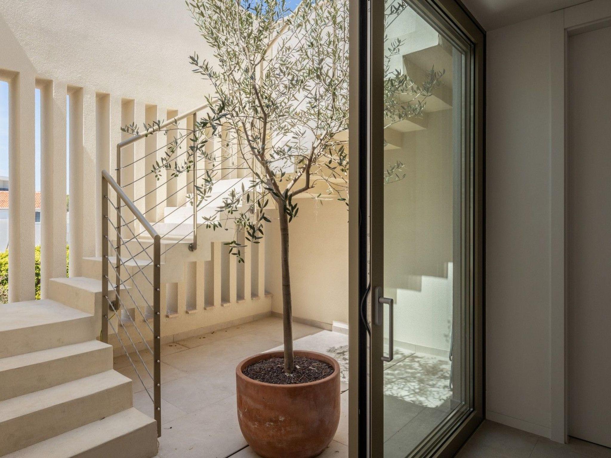 In the basement, you can find a laundry room, a small gym, a Turkish sauna, and half bath. On the ground floor, you’ll find a spacious living room adorned with high-quality furniture, a dining area boasting a large table and chairs for 8 persons, complemented by a well-equipped, luxurious open-concept kitchen. Large sliding glass doors lead from the living room and kitchen to the terrace. This inviting space is furnished with outdoor furniture providing views of the sea and the garden.