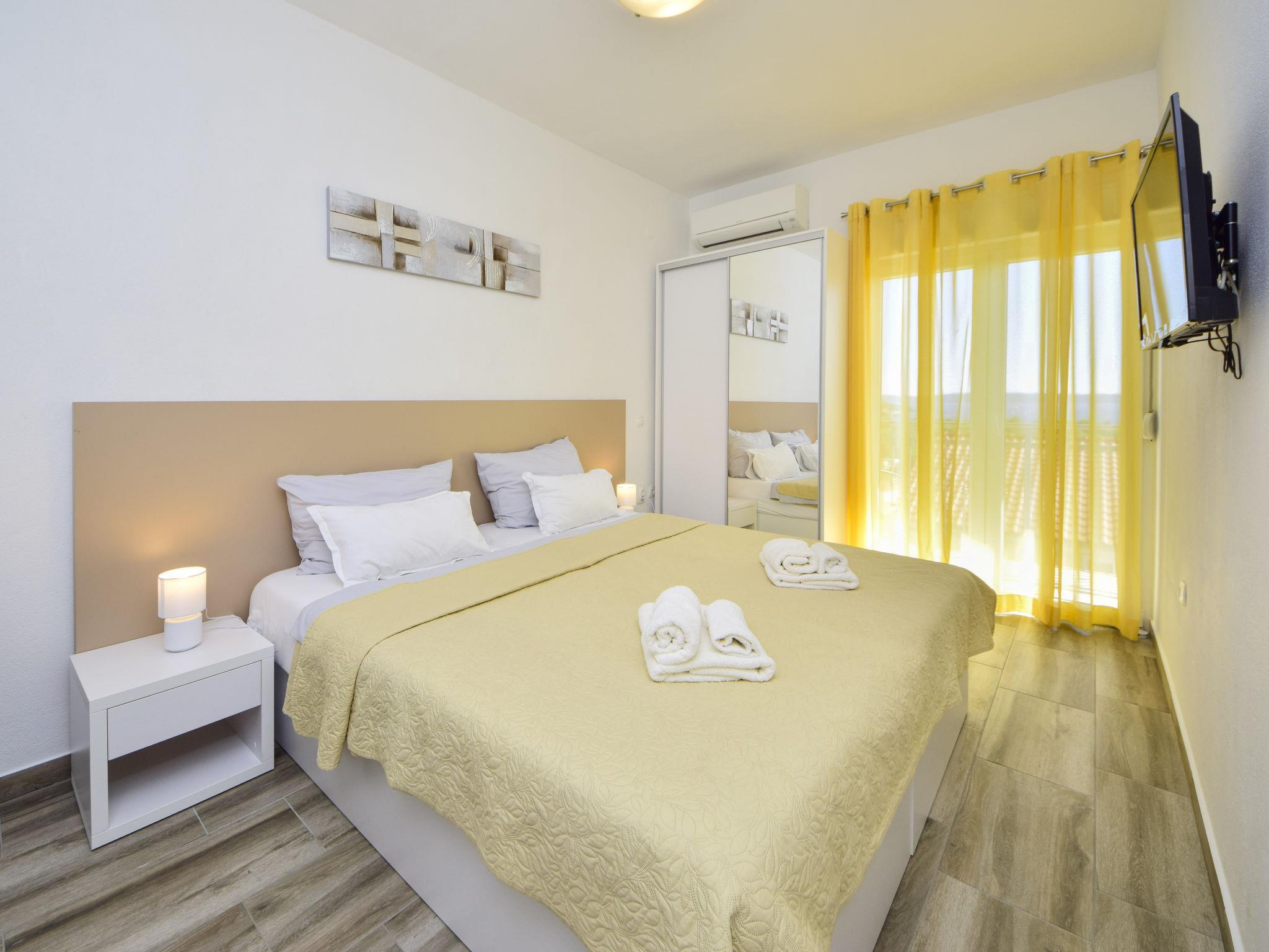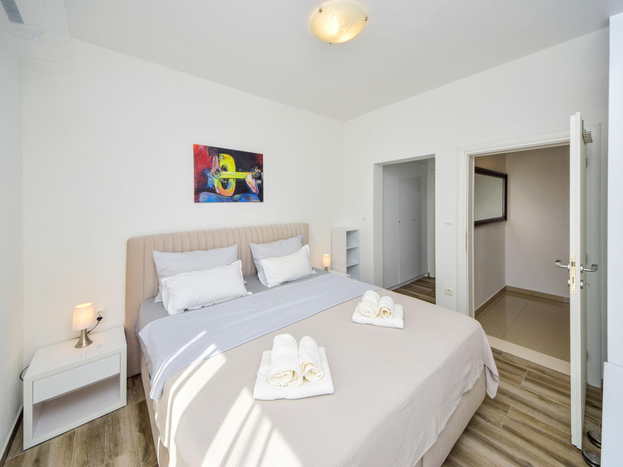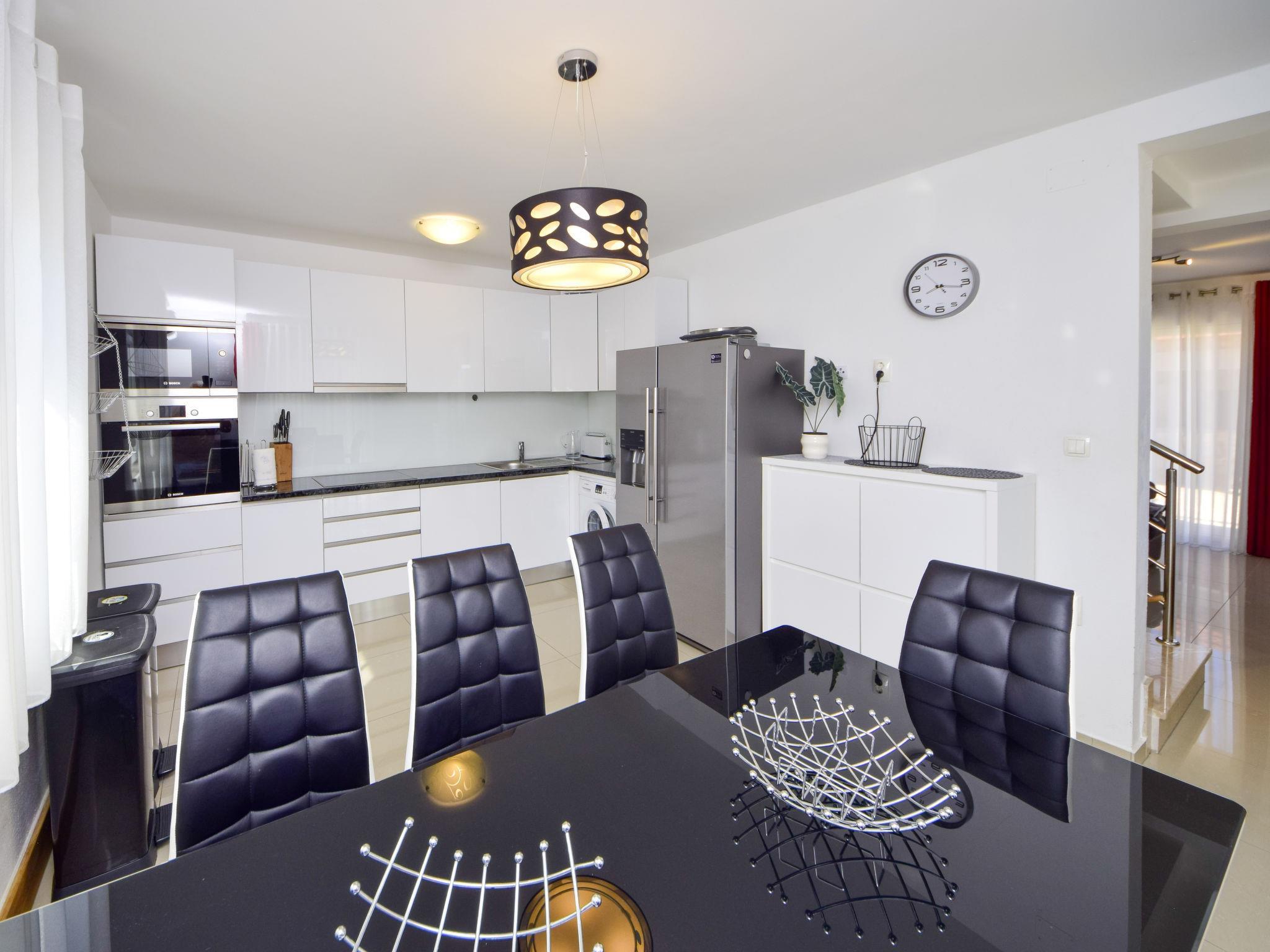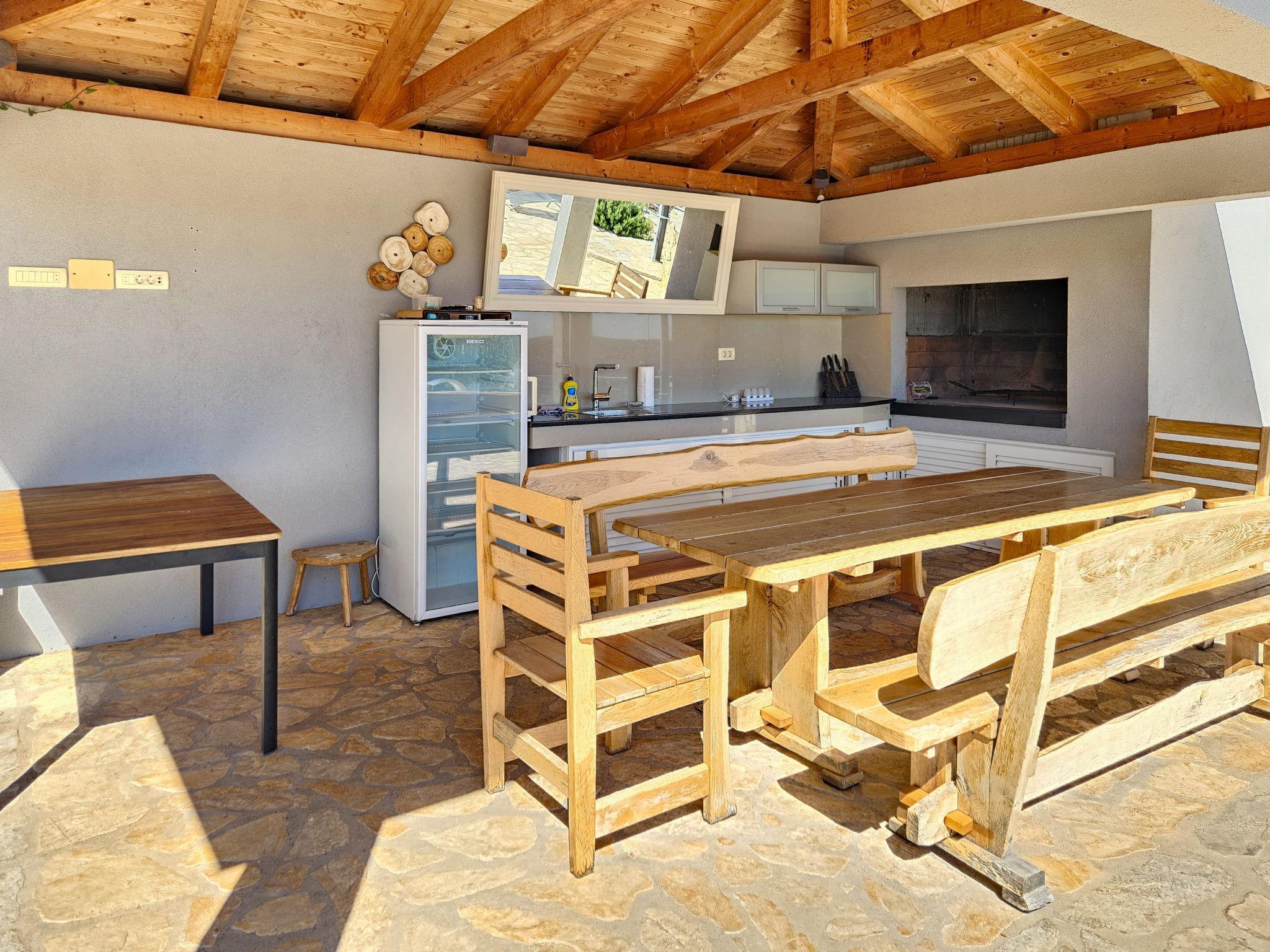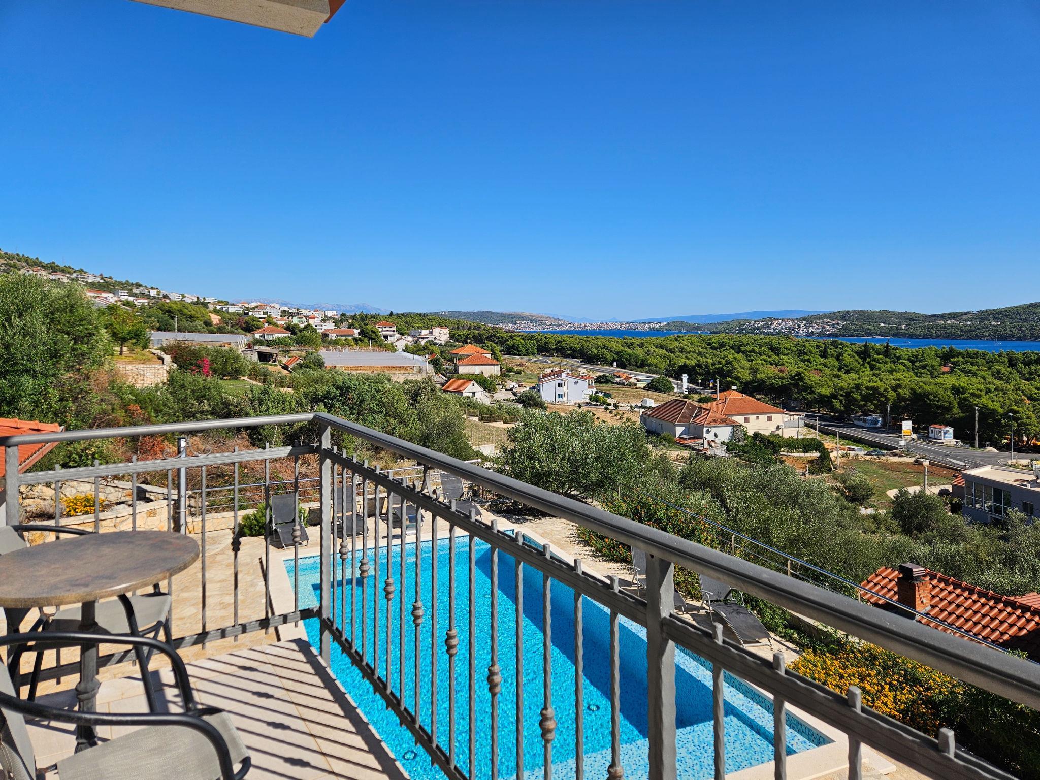 Seget Vranjica: Very beautiful villa "Maris", 3 storeys. 5.2 km from the centre of Trogir, in a quiet, sunny position on a slope, 1.1 km from the sea, 1.1 km from the beach, in a cul-de-sac. Private: property 400 m2 (fenced), swimming pool angular (32 m2, seasonal availability: 01.May. - 31.Oct.) with internal staircase. Outdoor shower, hot tub, pool house with fridge, barbecue, pool maintenance by the owner/gardener. In the house: internet access, fitness room, washing machine. 50 m long steep motor access to the house. Parking (for 4 cars) at the house on the premises. Shop 400 m, shopping centre 4.6 km, restaurant 1.1 km, bus stop 260 m, pebble beach 1.1 km. Please note: airfield 11 km from the property.