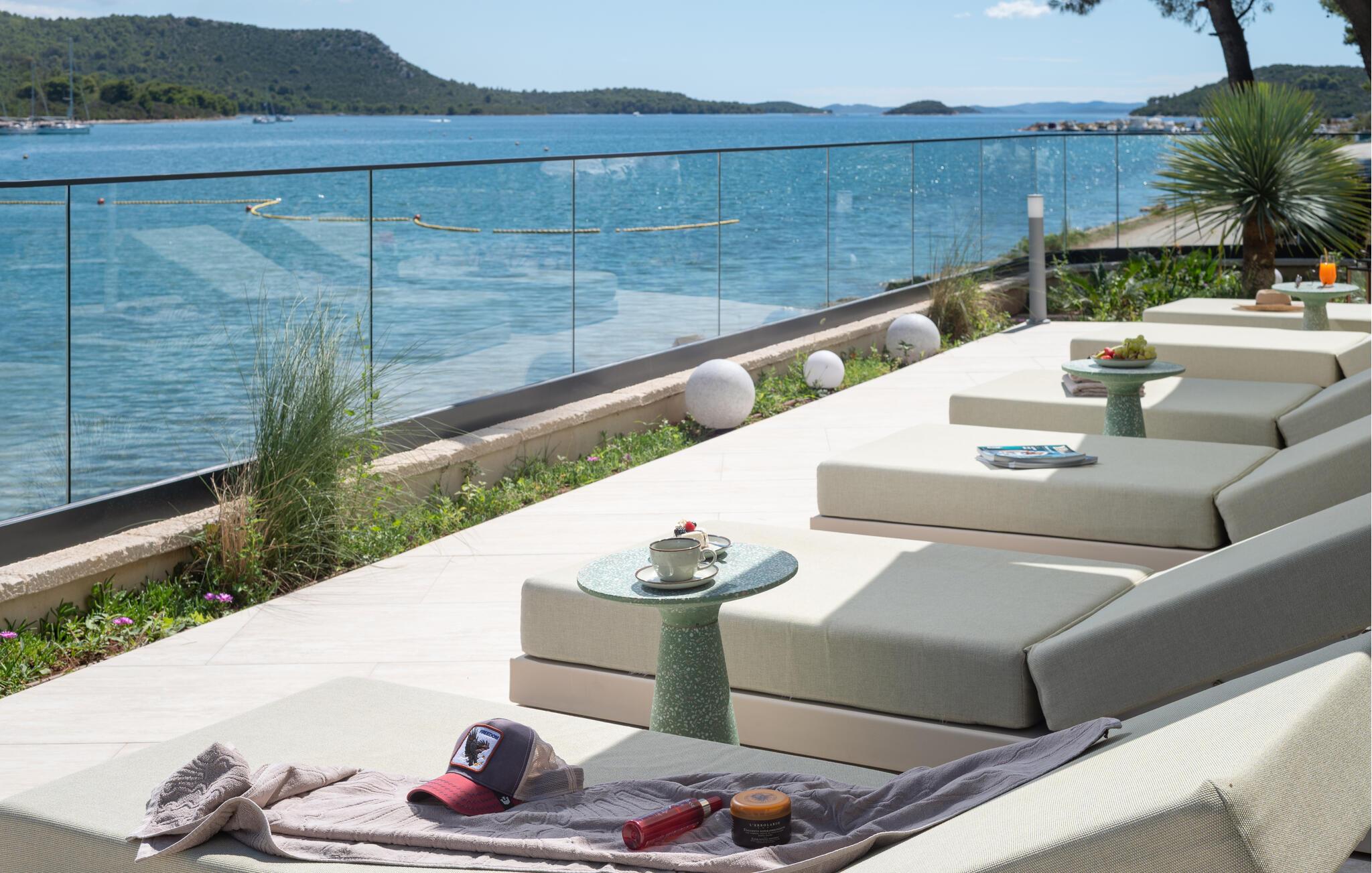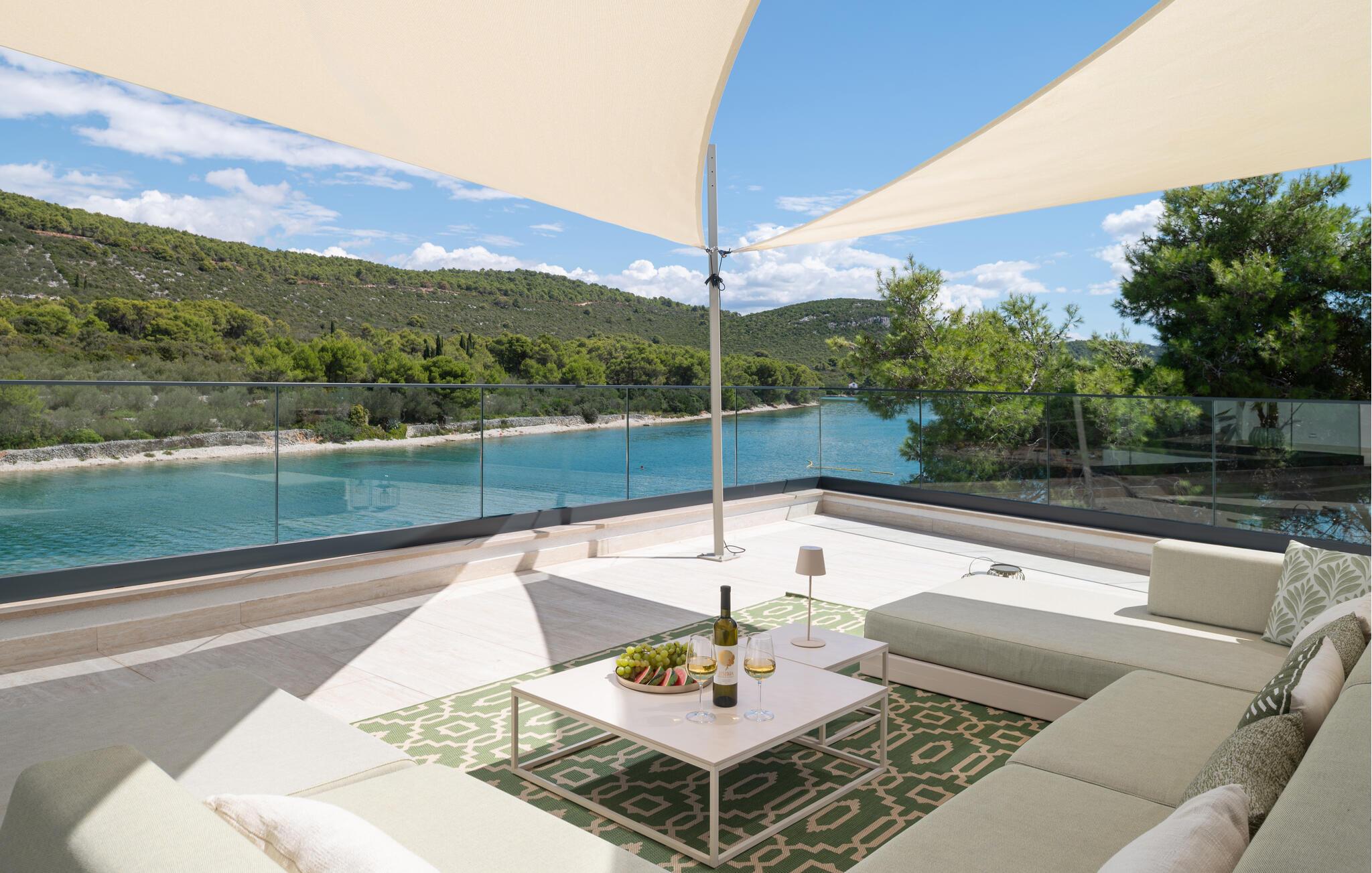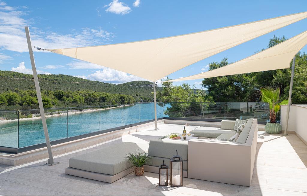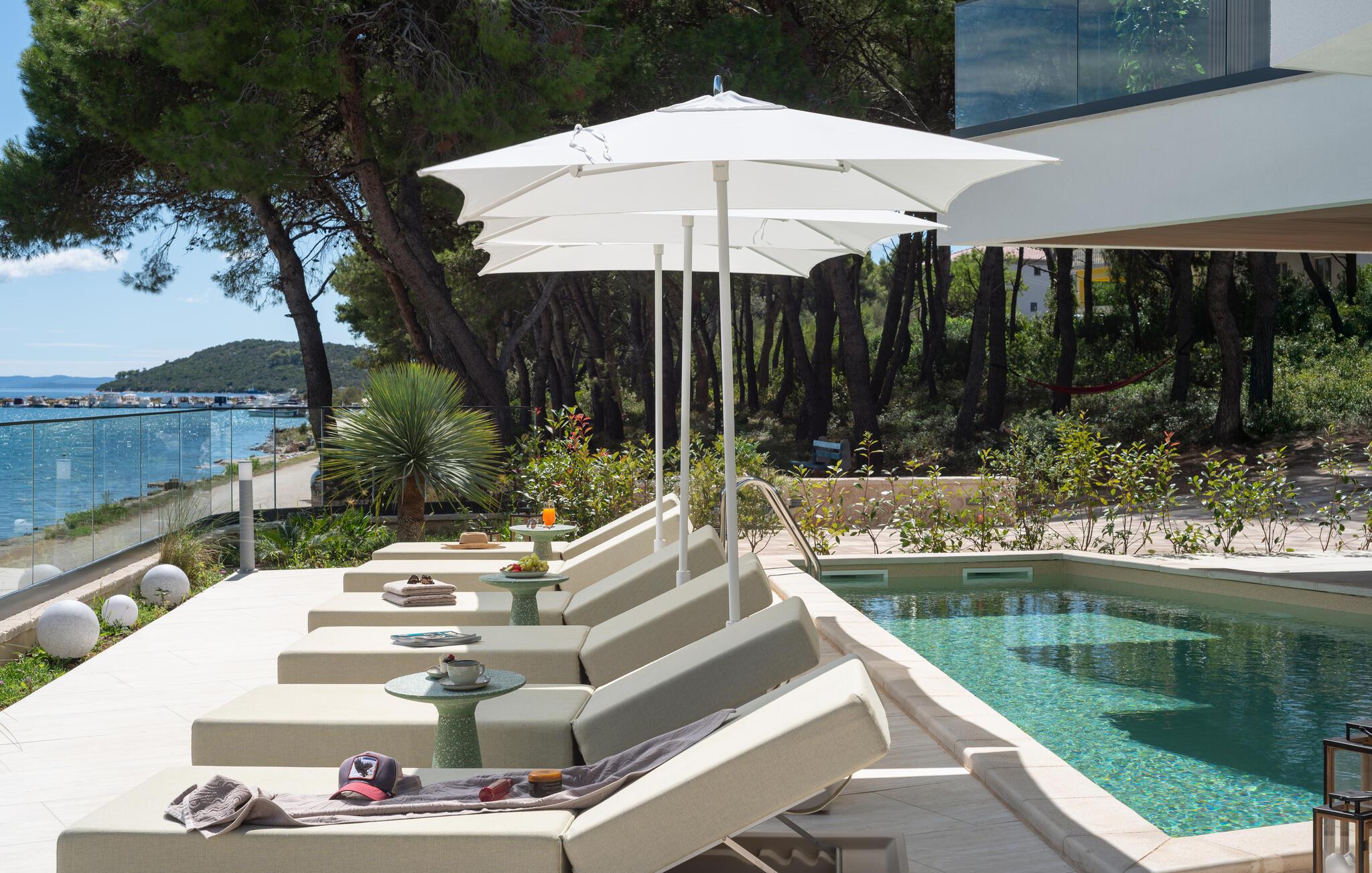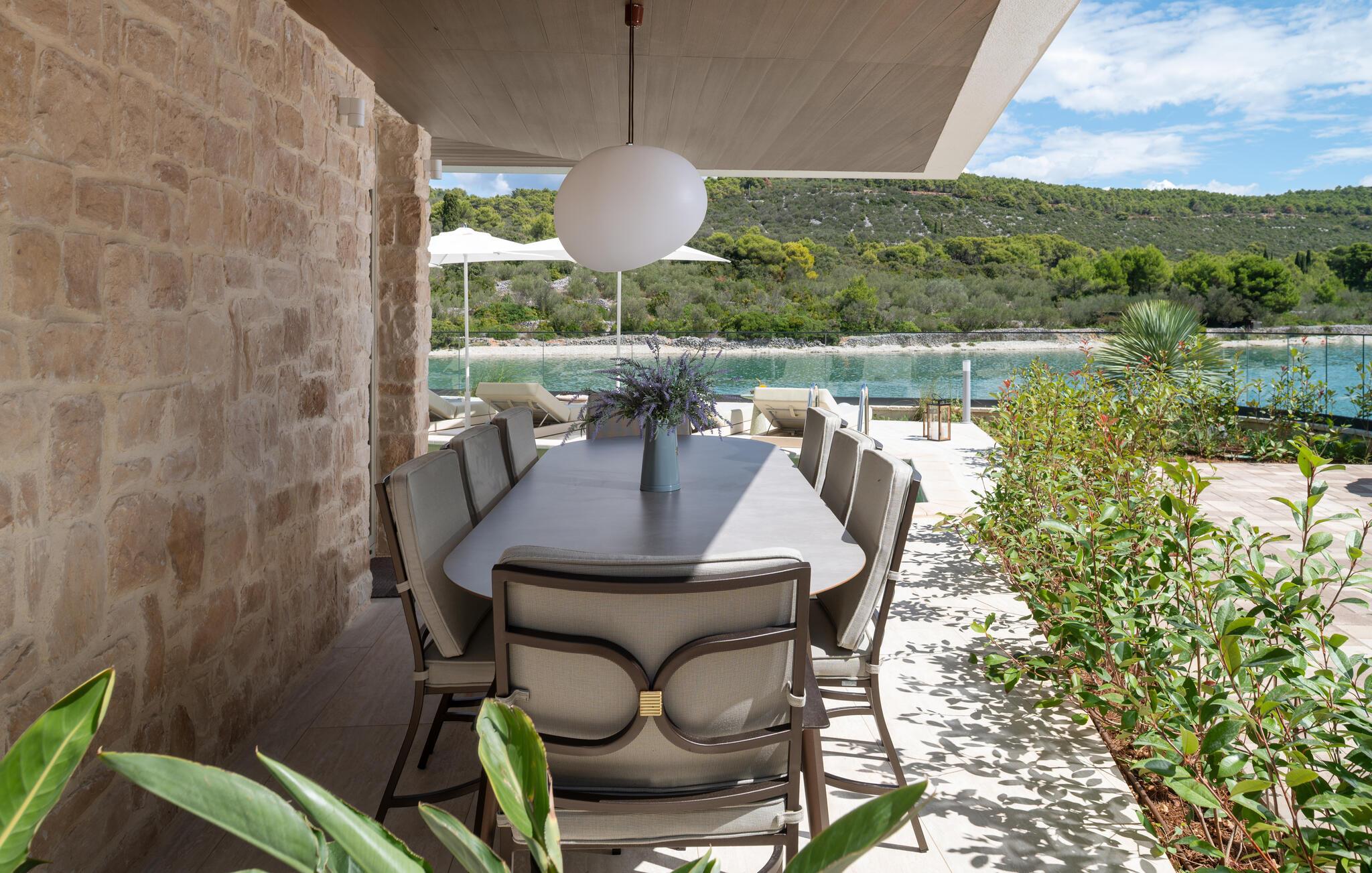 Det elegante udendørsområde er perfekt til at nyde det vidunderlige klima fuldt ud. Uanset om I køler jer ned i poolen, nyder morgenmaden i skyggen eller solbader, har I altid den rolige bugt i udsigt.