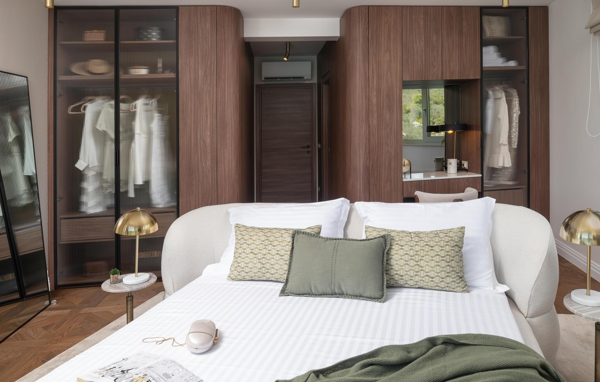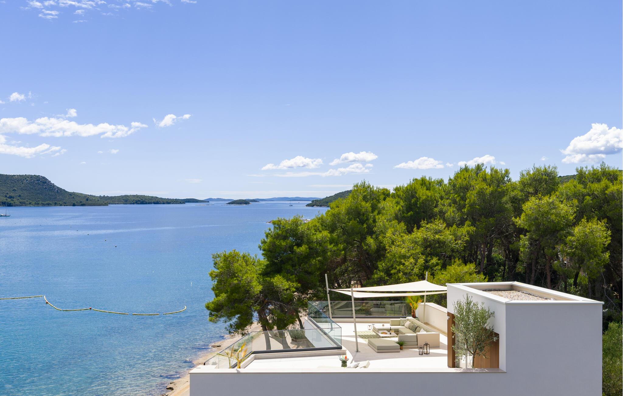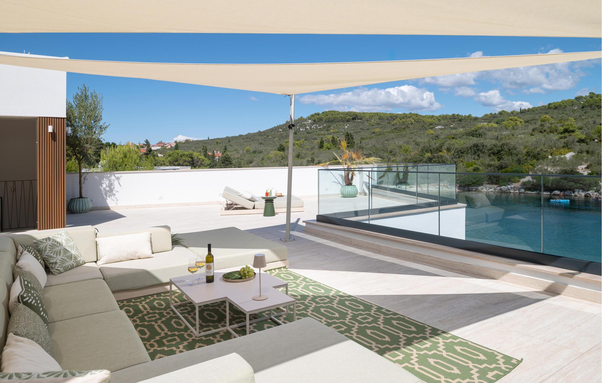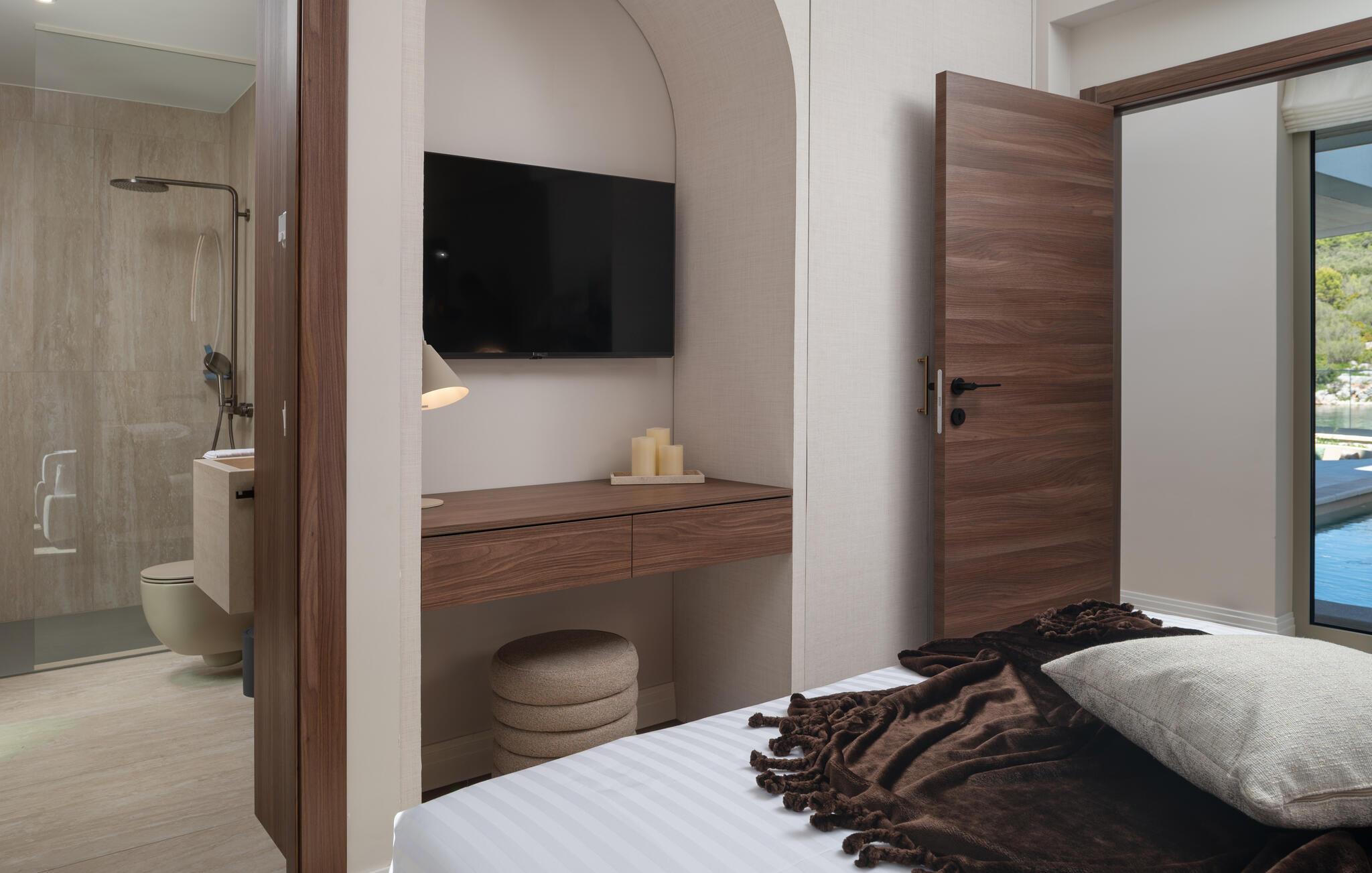 Det elegante udendørsområde er perfekt til at nyde det vidunderlige klima fuldt ud. Uanset om I køler jer ned i poolen, nyder morgenmaden i skyggen eller solbader, har I altid den rolige bugt i udsigt.