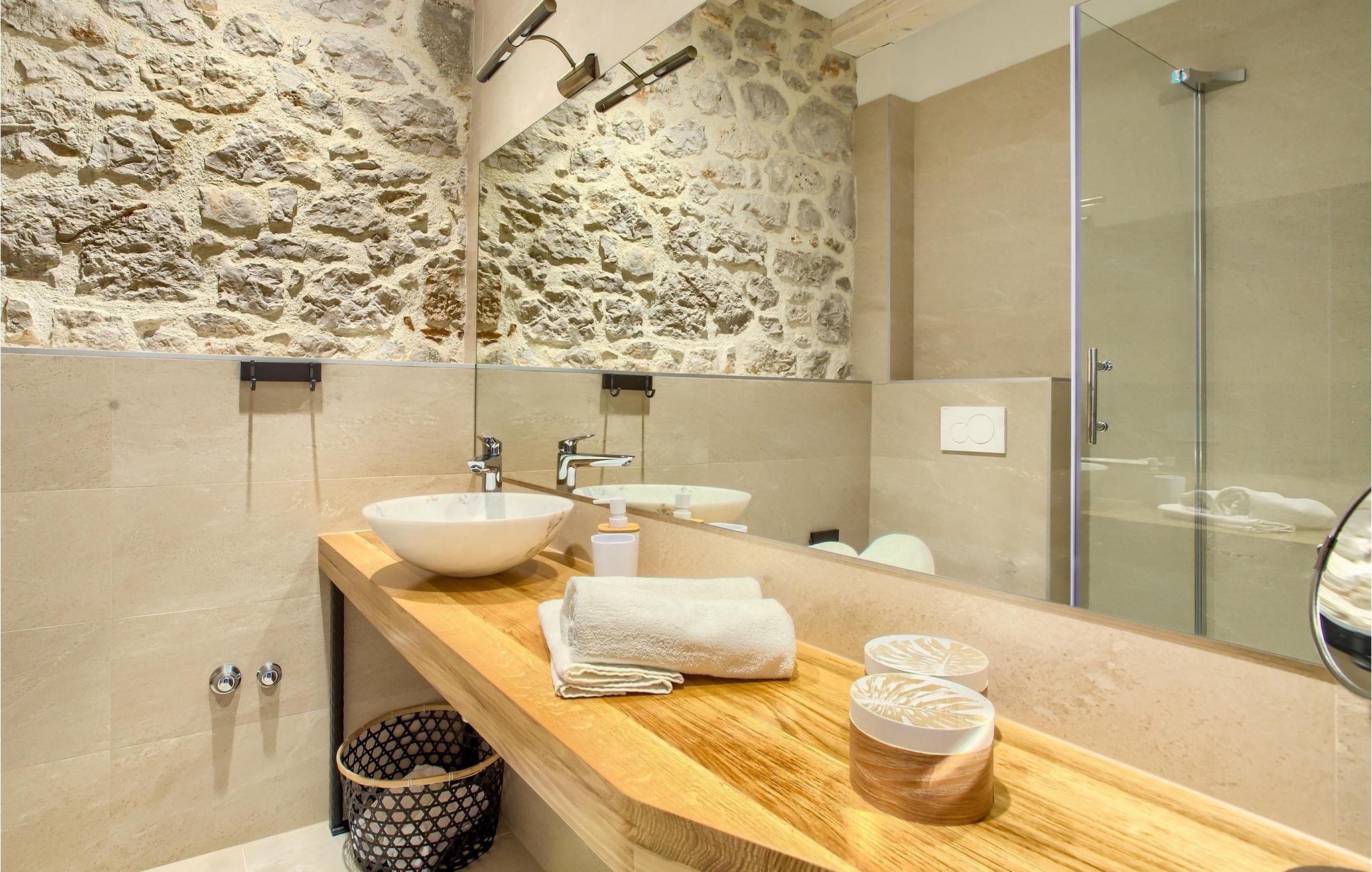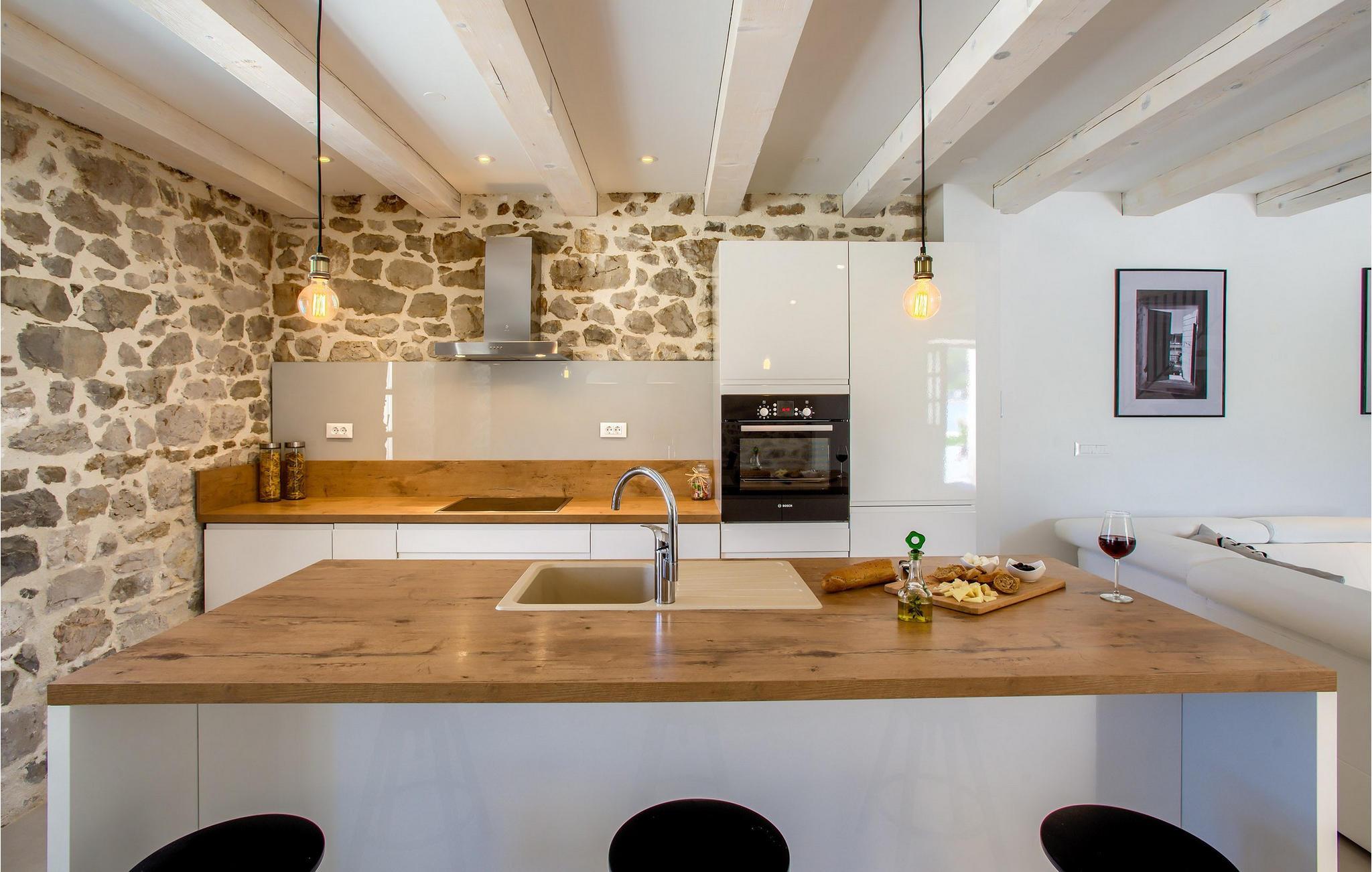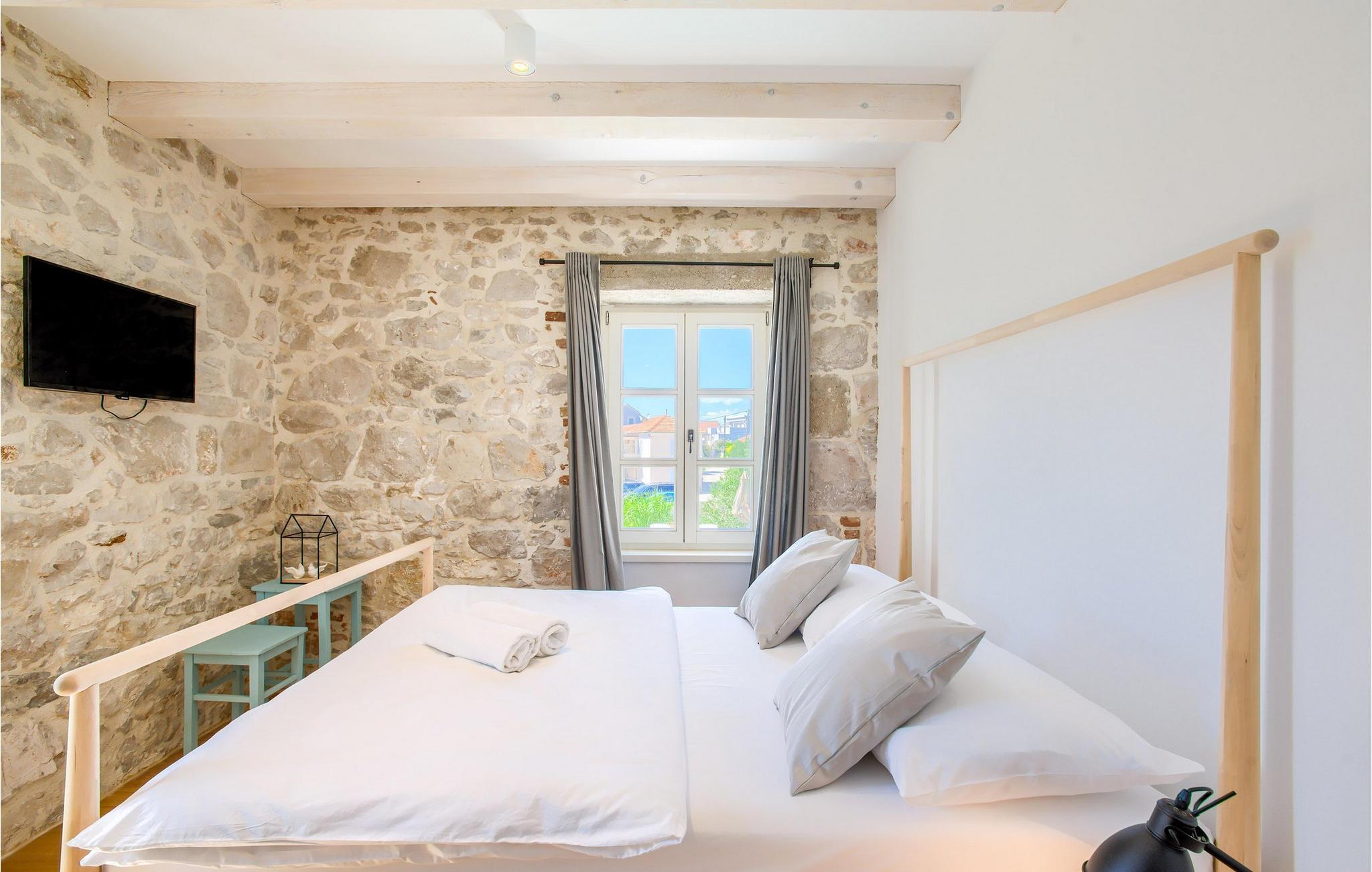 Mit insgesamt 4 Schlafzimmern kann die Villa bis zu 8+2 Personen beherbergen. Das stilvolle Interieur der Villa ist von modernen Möbeln, Holzbalken und rustikalem Hauch eines Steinhauses geprägt. Im Erdgeschoss befinden sich ein offener Wohn- und Essbereich mit komplett ausgestatteter Küche, sowie ein Doppelzimmer mit ensuite Bad. Im Obergeschoss sind drei charmante Doppelschlafzimmer mit jeweils privatem Bad. Die Villa verfügt über 2 Balkons. Kochservice gegen Aufpreis auf Anfrage verfügbar.Die Villa befindet sich in Sutomišcica, einem kleinen Dorf auf der Insel Ugljan. Aus Zadar gibt es tägliche Fähreverbindungen zur Insel Ugljan bzw. zum Hafen im Dorf namens Preko. Zadar ist eine alte sehenswerte Stadt reich an Kulturerbe und historischen Attraktionen. Der berühmte Alfred Hitchcock sagte, in Zadar sei der schönste Sonnenuntergang- verpassen Sie ihn nicht! Die Altstadt bietet die Denkmäler aus der Antike, dem Mittelalter und der Renaissance. Heutzutage ist Zadar bekannt für die Meeresorgel und die Lichtinstallation "Pozdrav suncu" (Gruß an die Sonne). Auf der Insel gibt es Kiefernwälder, Sand- und Steinstrände sowie die kristallblaue Adria.n. Ugljan ist der perfekte Ausgangspunkt für Tagesausflüge zu den Nationalparks Telašcica und Kornati. Falls Sie sich eher für aktiven Urlaub interessieren, finden Sie hier Wander- und Radwege.