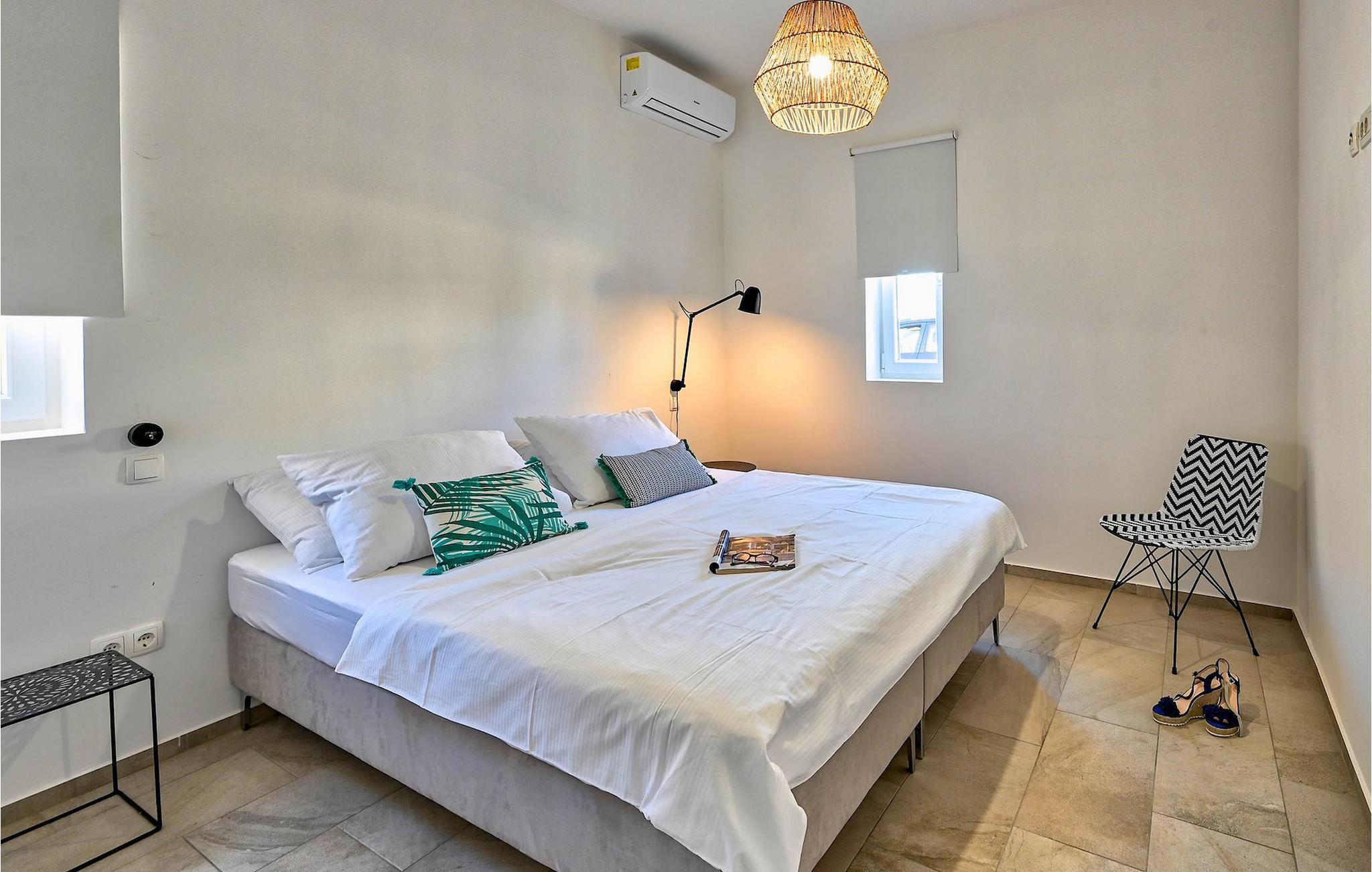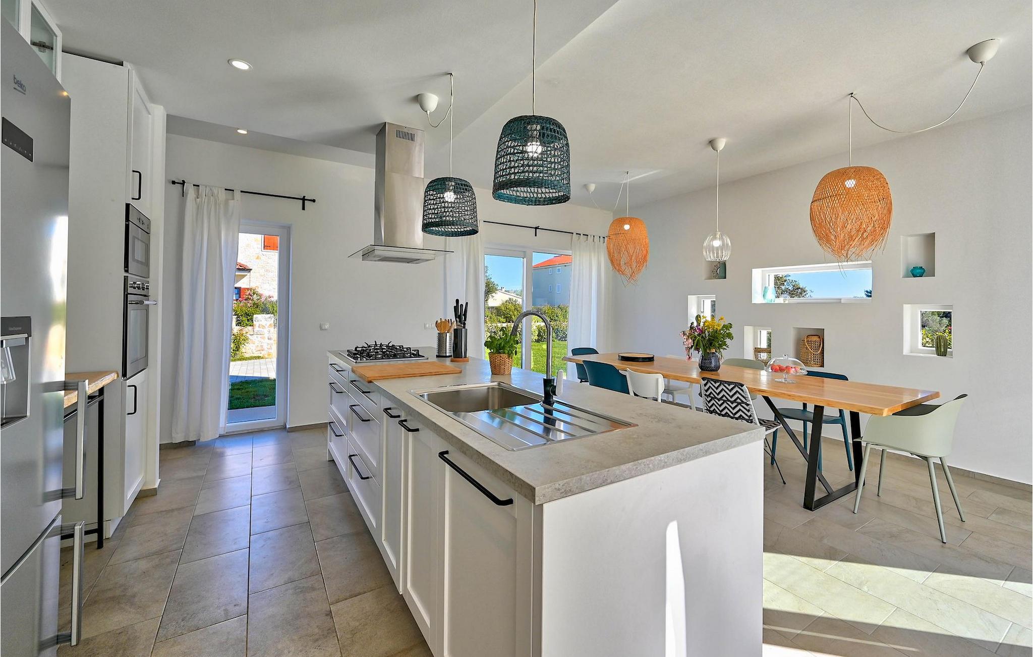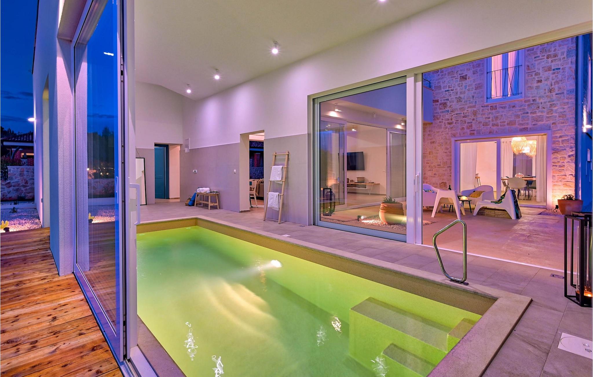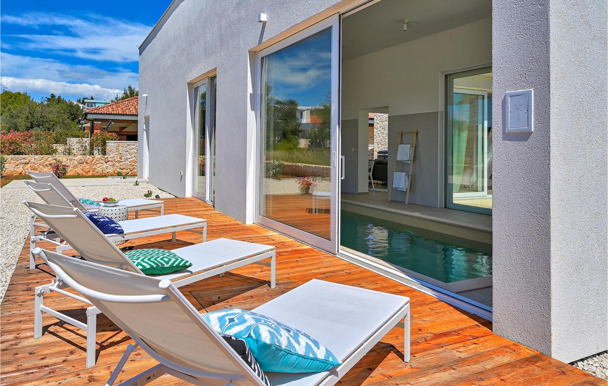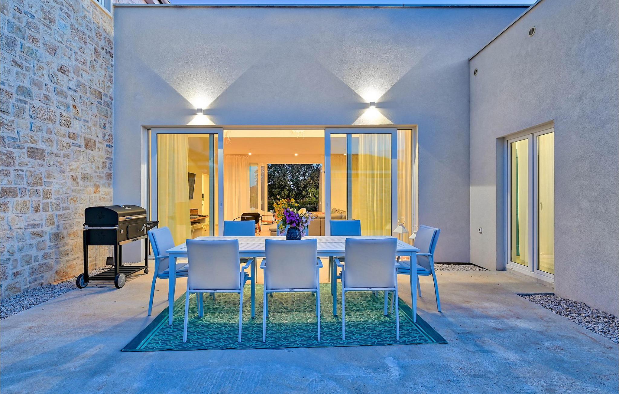 Villa Vela Muline er en smuk villa beliggende i idylliske omgivelser tæt på havet. Villa Vela Muline er virkelig speciel, da den har en opvarmet indendørs pool med store glasskydedøre, så selvom vejret er dårligt, kan du nyde at svømme. Villaen er ideel til en afslappende familieferie for op til 10 gæster. Den overordnede følelse af villaen er luftig med en masse naturligt lys. Villaen har en åbent koncept stue med et fuldt udstyret køkken og spisebord til 10 gæster i stueetagen. Den moderne indrettede stue er den centrale del af villaen, og på venstre fløj fortsætter den til wellness-zonen med indendørs pool. Mod højre fløj er den forbundet med køkkenet med spiseplads. Mellem stuen, køkkenet til højre og den indendørs pool til venstre er der et dejligt hjørne med en udendørs lounge. I venstre side af wellness er zonen et solterrasse med liggestole, så du kan arbejde på din brunfarve. I stueetagen er der også et soveværelse med eget badeværelse og et "spillerum", der fungerer som et multifunktionelt rum og kan omdannes enten til et legerum for børn, hjemmekontor eller ekstra soveværelse med sovesofa. På første sal er der yderligere 3 soveværelser med eget badeværelse, og der er en stor terrasse, der har en flot udsigt over havet og tilbyder fuldstændig privatliv. Villaen er delvist omgivet af en plejet græsplæne, som er perfekt for børn at løbe rundt eller kæledyr at lege med. Villa Vela Muline ligger i den lille landsby Muline på øen Ugljan. Ugljan er den nærmeste ø til Zadar, det kulturelle og økonomiske centrum i amtet. Det er forbundet med Zadar med mange færgelinjer og kan nås inden for 25 minutter.