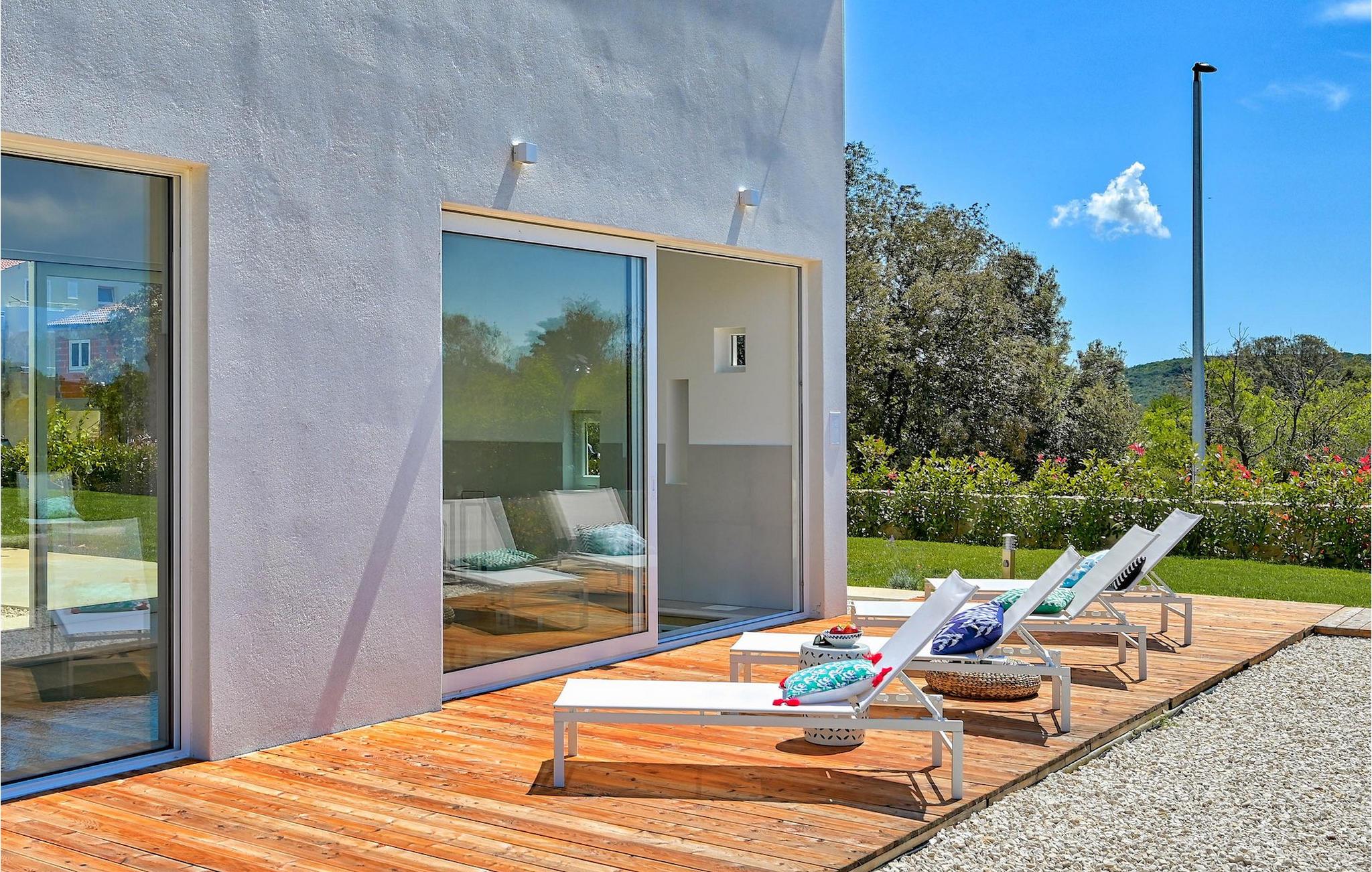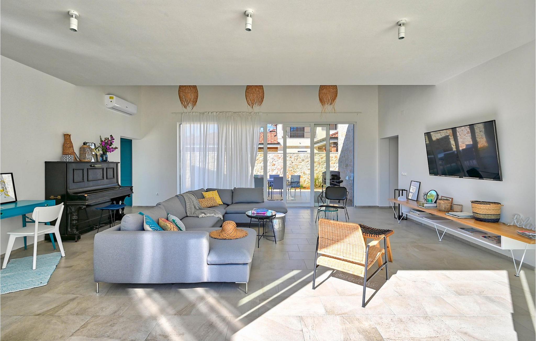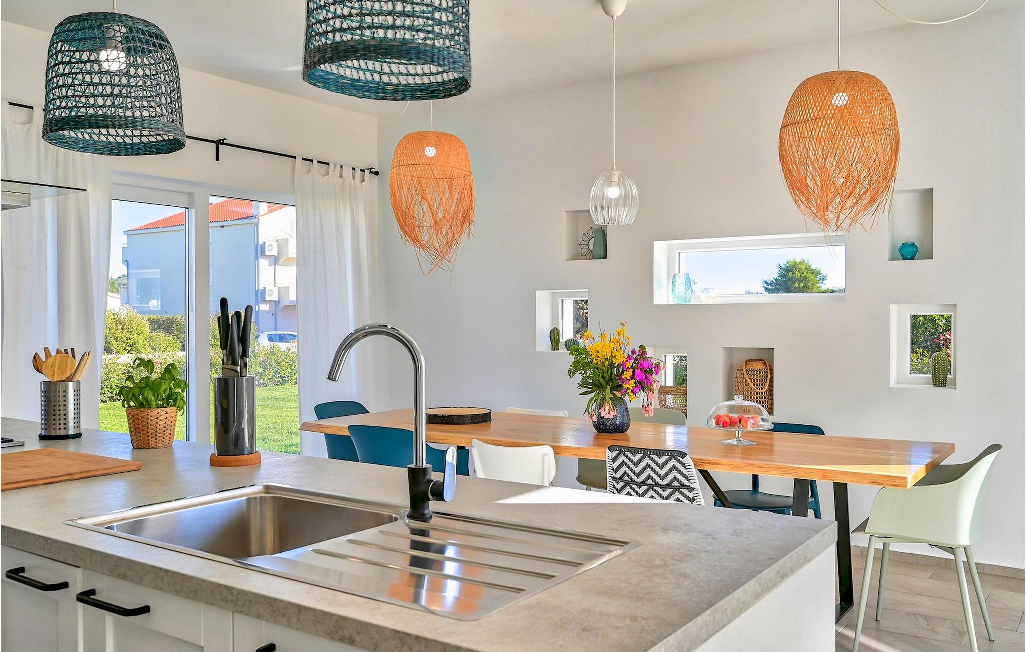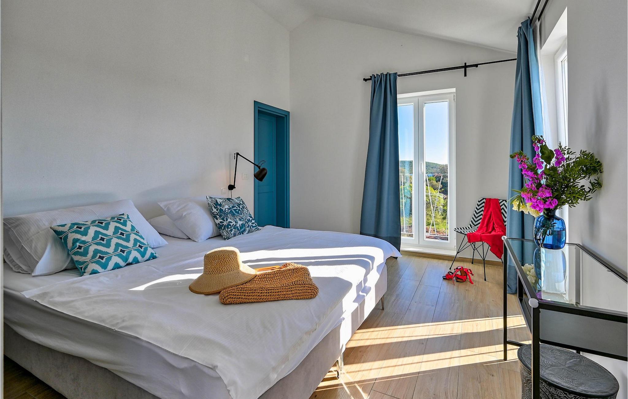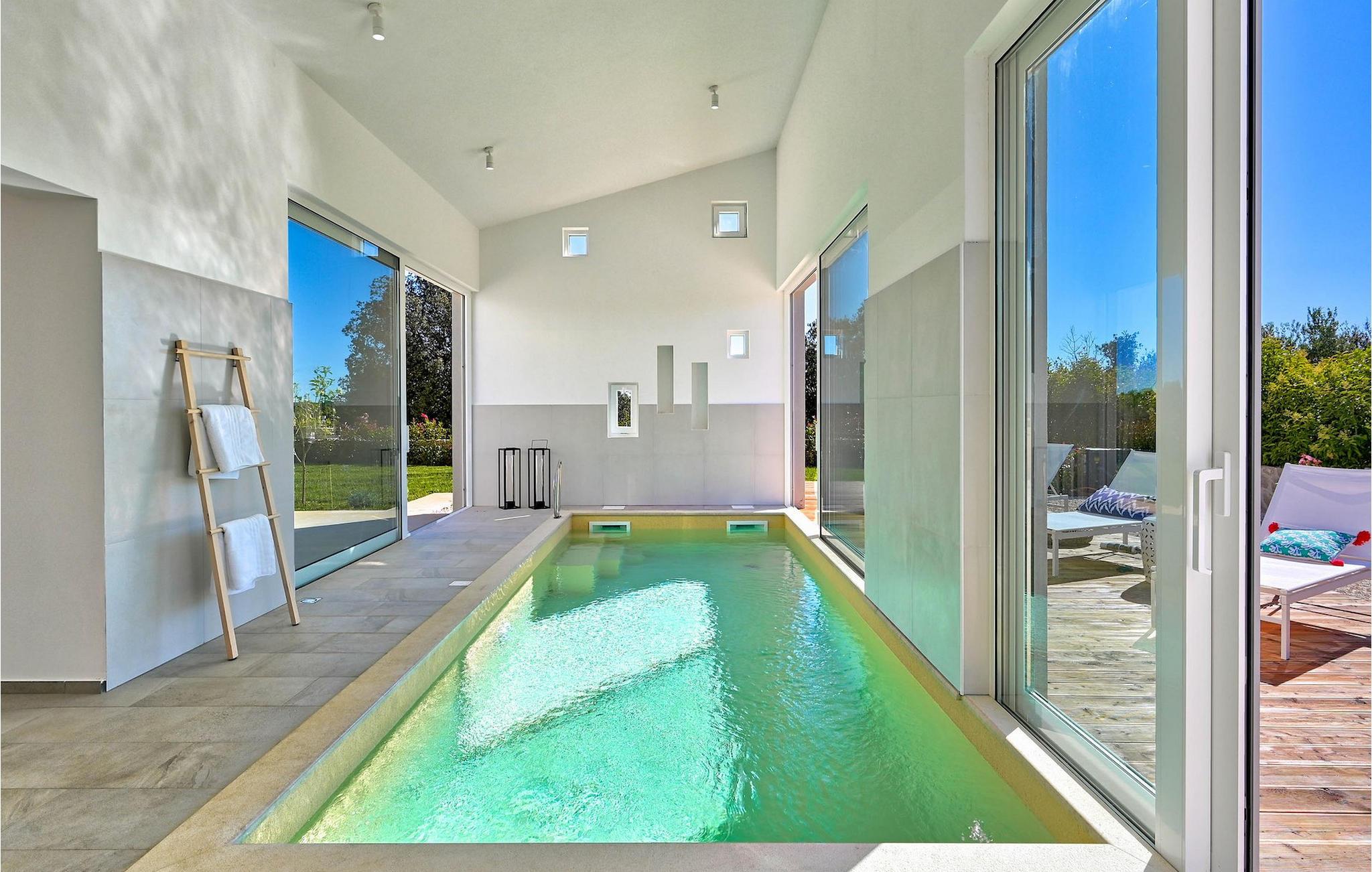 Villa Vela Muline er en smuk villa beliggende i idylliske omgivelser tæt på havet. Villa Vela Muline er virkelig speciel, da den har en opvarmet indendørs pool med store glasskydedøre, så selvom vejret er dårligt, kan du nyde at svømme. Villaen er ideel til en afslappende familieferie for op til 10 gæster. Den overordnede følelse af villaen er luftig med en masse naturligt lys. Villaen har en åbent koncept stue med et fuldt udstyret køkken og spisebord til 10 gæster i stueetagen. Den moderne indrettede stue er den centrale del af villaen, og på venstre fløj fortsætter den til wellness-zonen med indendørs pool. Mod højre fløj er den forbundet med køkkenet med spiseplads. Mellem stuen, køkkenet til højre og den indendørs pool til venstre er der et dejligt hjørne med en udendørs lounge. I venstre side af wellness er zonen et solterrasse med liggestole, så du kan arbejde på din brunfarve. I stueetagen er der også et soveværelse med eget badeværelse og et "spillerum", der fungerer som et multifunktionelt rum og kan omdannes enten til et legerum for børn, hjemmekontor eller ekstra soveværelse med sovesofa. På første sal er der yderligere 3 soveværelser med eget badeværelse, og der er en stor terrasse, der har en flot udsigt over havet og tilbyder fuldstændig privatliv. Villaen er delvist omgivet af en plejet græsplæne, som er perfekt for børn at løbe rundt eller kæledyr at lege med. Villa Vela Muline ligger i den lille landsby Muline på øen Ugljan. Ugljan er den nærmeste ø til Zadar, det kulturelle og økonomiske centrum i amtet. Det er forbundet med Zadar med mange færgelinjer og kan nås inden for 25 minutter.