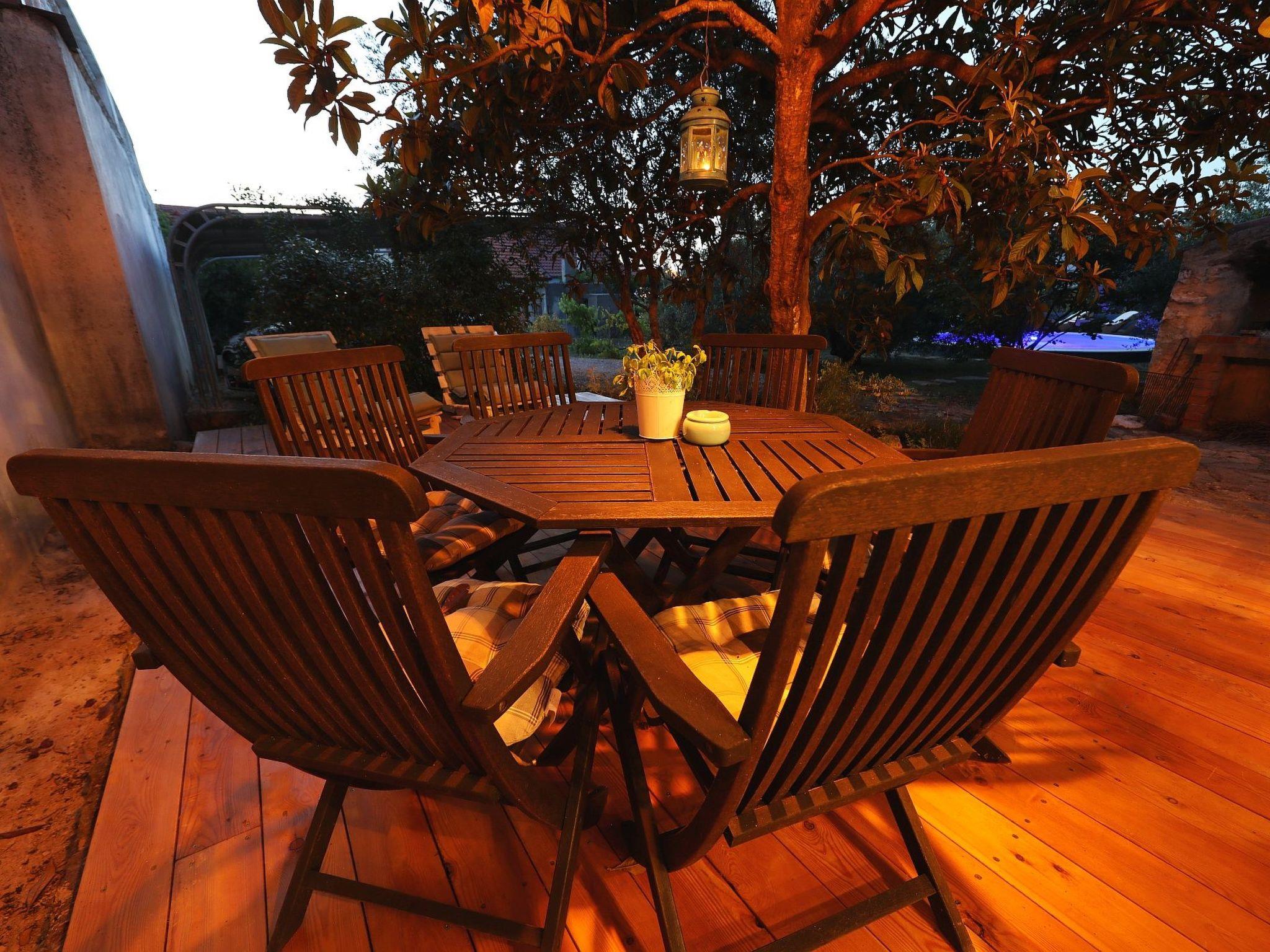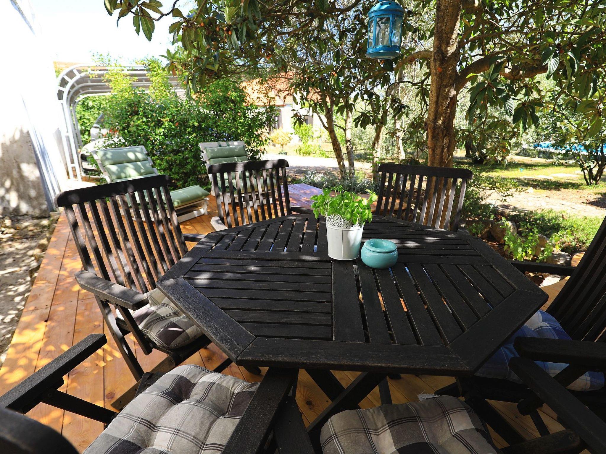 The large, shaded terrace in front of the house is furnished with a table and chair. It is a nice space to have meals or just relax after a long day at the beach. Hot tub an external shower and new bulit heated pool.