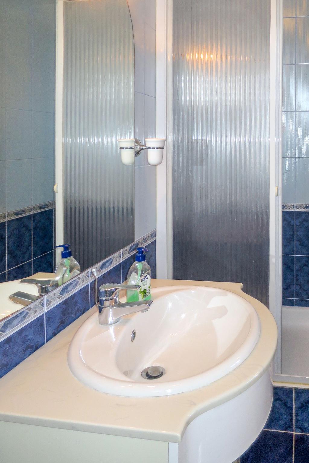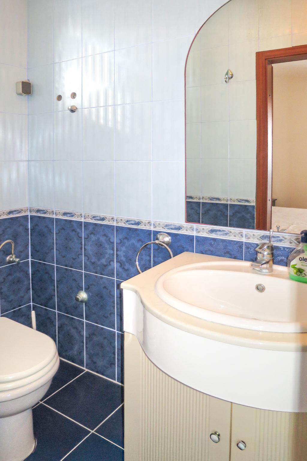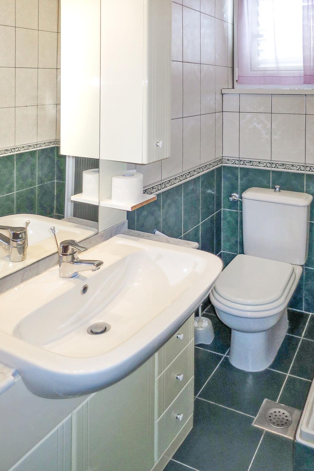 3-room apartment 95 m2 on 1st floor. Living/dining room with 1 double sofabed (150 cm), kitchen corner, shower/WC and satellite TV (flat screen), DVD. Exit to the balcony. Entrance hall with air conditioning. 1 room with 1 french bed, shower/WC and TV. Exit to the balcony. 1 room with 1 double bed and shower/WC. Exit to the balcony. Kitchen (1 hot plate, oven, dishwasher, 3 gas rings, toaster, kettle, microwave, freezer, electric coffee machine) with dining table. Exit to the balcony. No heating option. Balcony. Balcony furniture. View of the sea. Facilities: children's high chair. Internet (WiFi, free). Maximum 1 pet/ dog allowed.