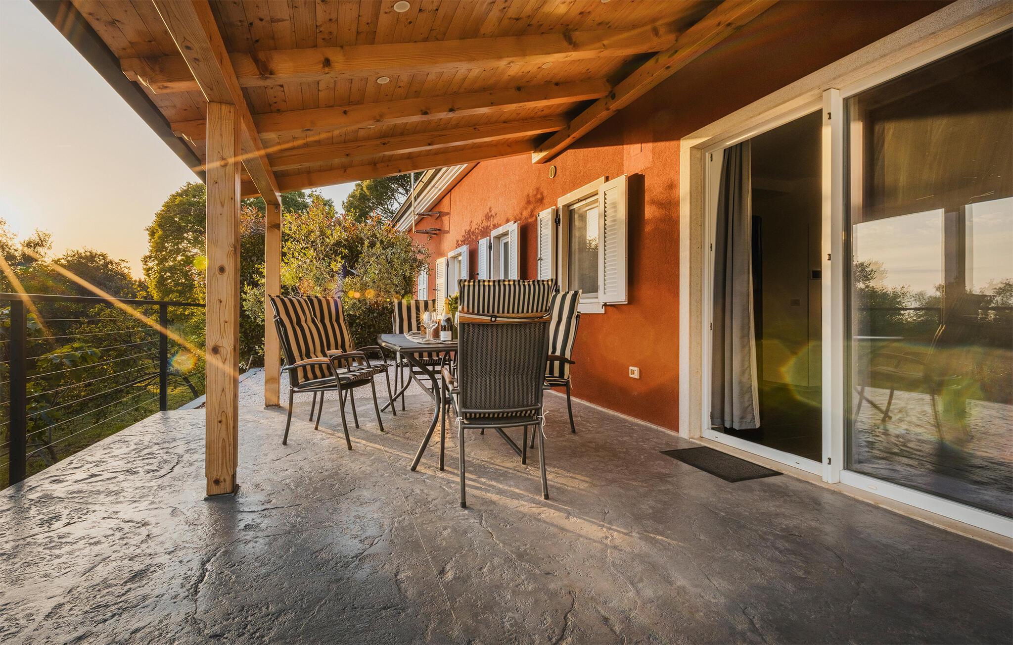 På terrssen kan I hoppe direkte i poolen. Når der skal lades op på energi, kan I slappe af i solen og nyde den smukke udsigt over landskabet. Den overdækkede terrasse er oplagt til hyggelige aftener udendørs efter solen er gået ned. Som ekstra underholdning til de mindste, ligger en sjov legeplads ved siden af huset.
