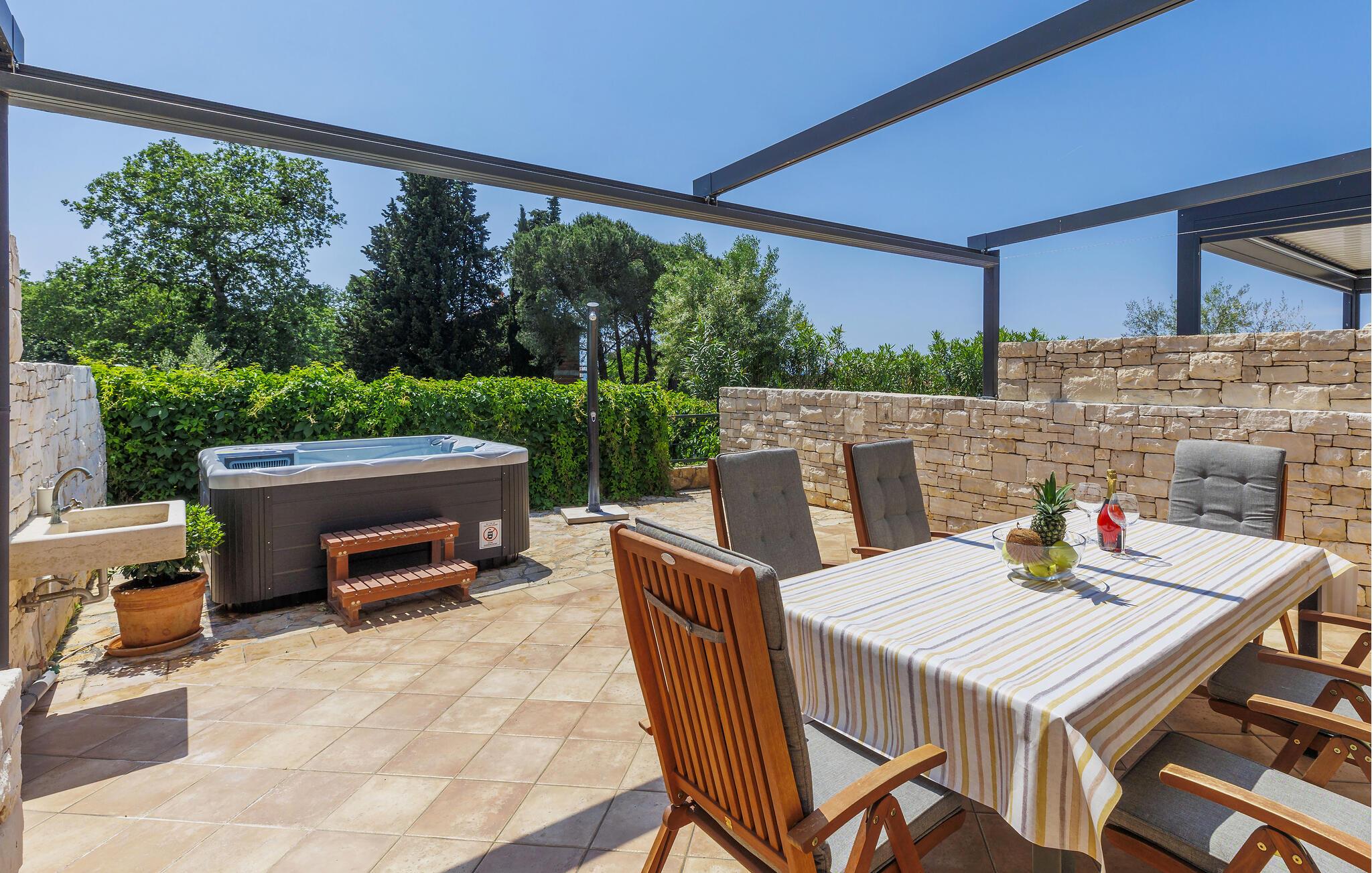 Forkæl jer selv med en afslappende ferie i dette moderne feriehus med spabad og panoramaudsigt over havet.