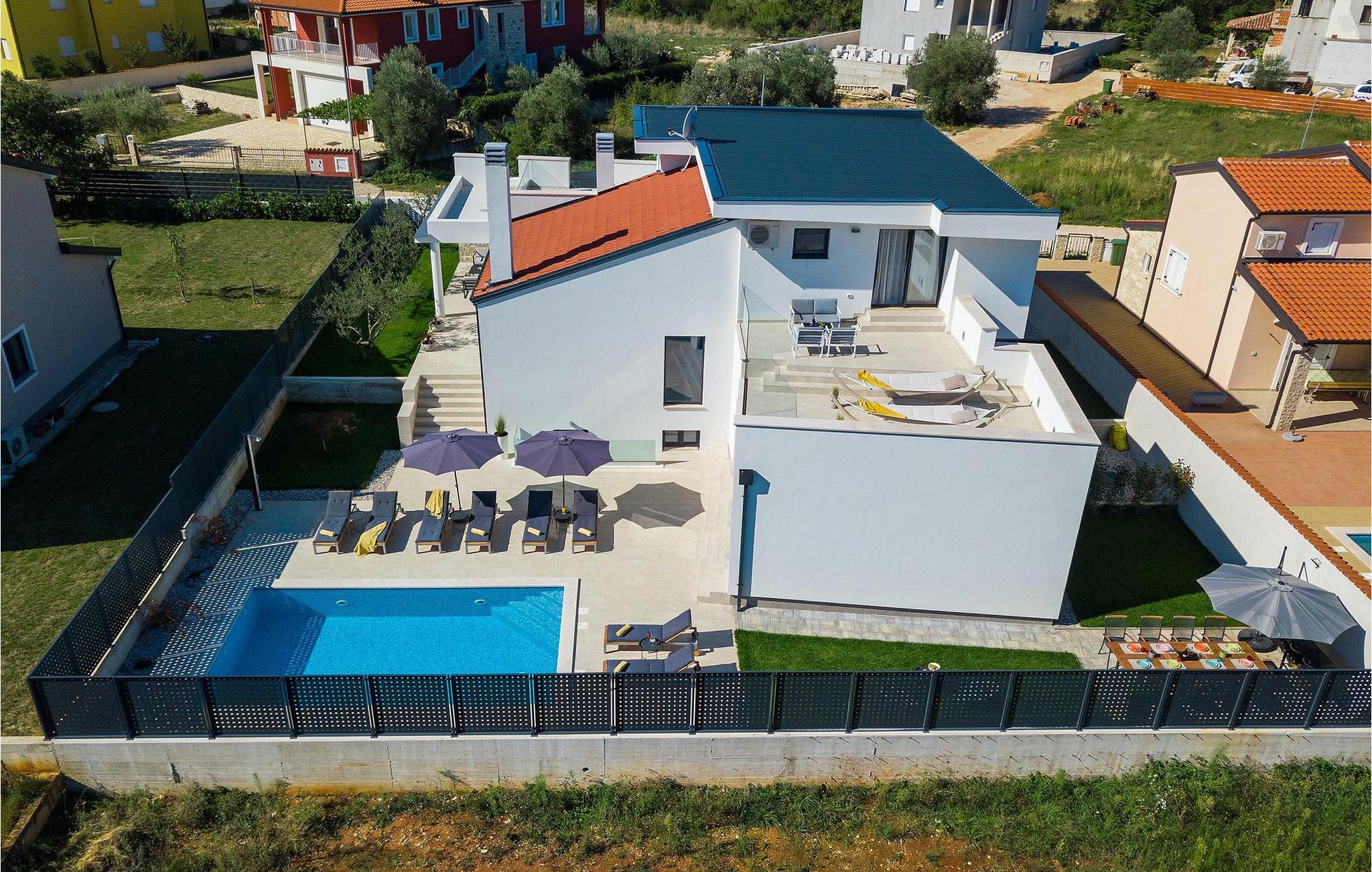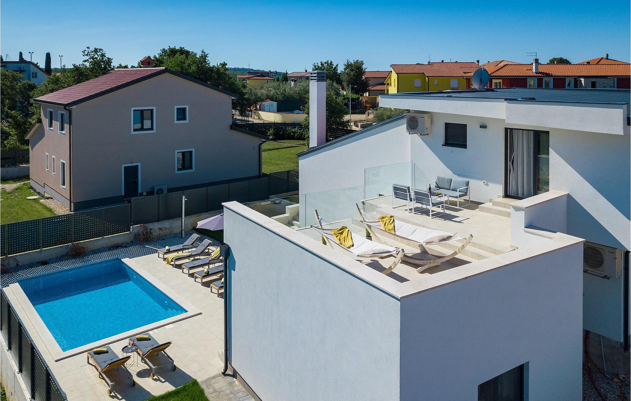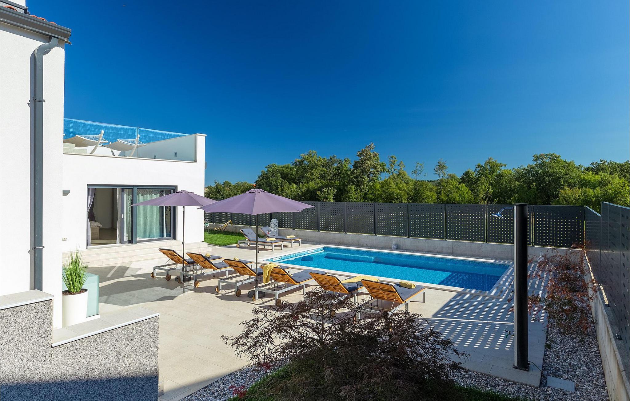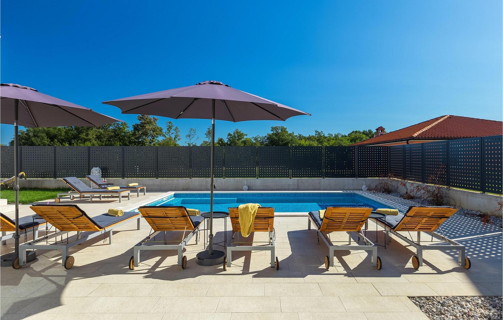 Den stilfulde villa Dolcea er en fire-værelses villa beliggende i den charmerende landsby Kastel cirka 8 km fra havet. Villaen er perfekt for alle, der ønsker at nyde en fredelig atmosfære og idyllisk natur. Kan du bare forestille dig at slappe af på de komfortable liggestole ved den private pool? Stueetagen består af en moderne indrettet stue, to hyggelige dobbeltværelser og et fuldt udstyret, rummeligt køkken og spisestue, begge fuld af lys. På første sal finder du de to andre soveværelser. Bortset fra ved poolen kan du nyde den istriske sol på den dejlige terrasse på første sal. Et ekstra køkken, hvor du kan tilberede lækre måltider til din familie og venner, er placeret under stueetagen, samt et underholdningsrum. De konkurrencedygtige, der ikke ønsker at slappe af ved poolen hele dagen, kan nyde at spille dart, pool på det professionelle billardbord eller bordfodbold. Villaen har aircondition, der er tv i hvert værelse, og hvert soveværelse har eget badeværelse. Som hendes navn siger, vil du tilbringe den sødeste ferie i Villa Dolcea. Vila Dolcea ligger i Kastel, en istrisk landsby tæt på kystbyen Umag. Umag tilbyder et stort udvalg af fritidsaktiviteter, turistfaciliteter samt en lille havn. Fremragende restauranter, barer og caféer kan findes i dens brostensbelagte gader. Gå ikke glip af din chance og prøv nogle trøfler, istrisk prosciutto, fisk og skaldyrsspecialiteter og lokal ost. I dag er Umag især kendt for sport: hver juli finder Croatia Open (en del af ATP World Tour 250-serien) sted der, med mange store navne fra mændenes tennisverden. Ikke langt væk fra Umag ligger også det prisvindende vandland Istralandia, ideelt til en sjov dag for hele familien. Kanegra-stranden, som er tættest på vilaen, er en lang stenstrand og en af de mest attraktive i Istrien.