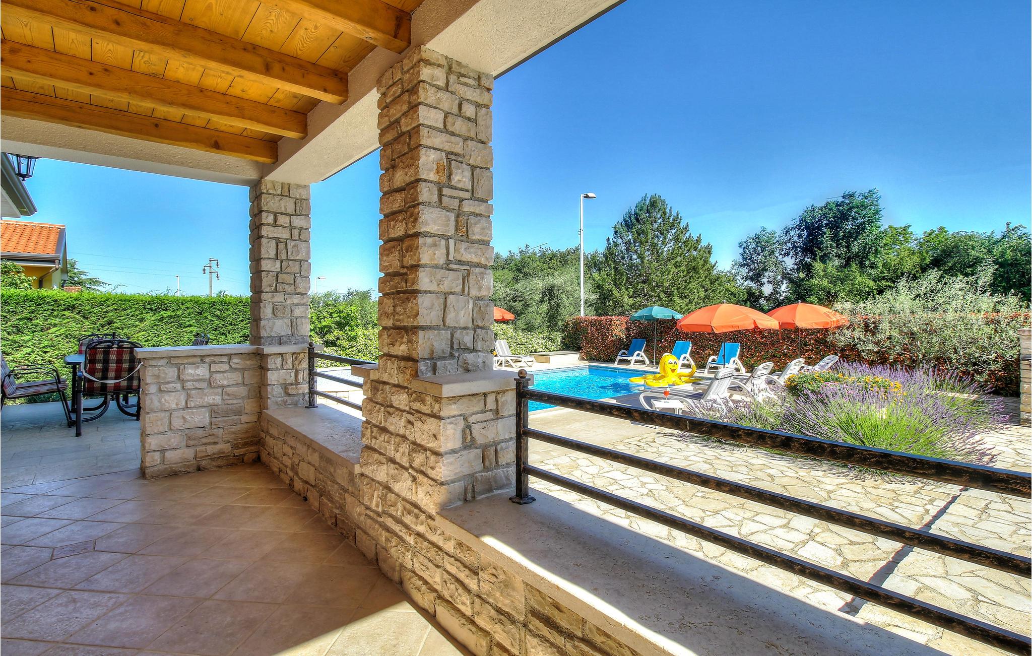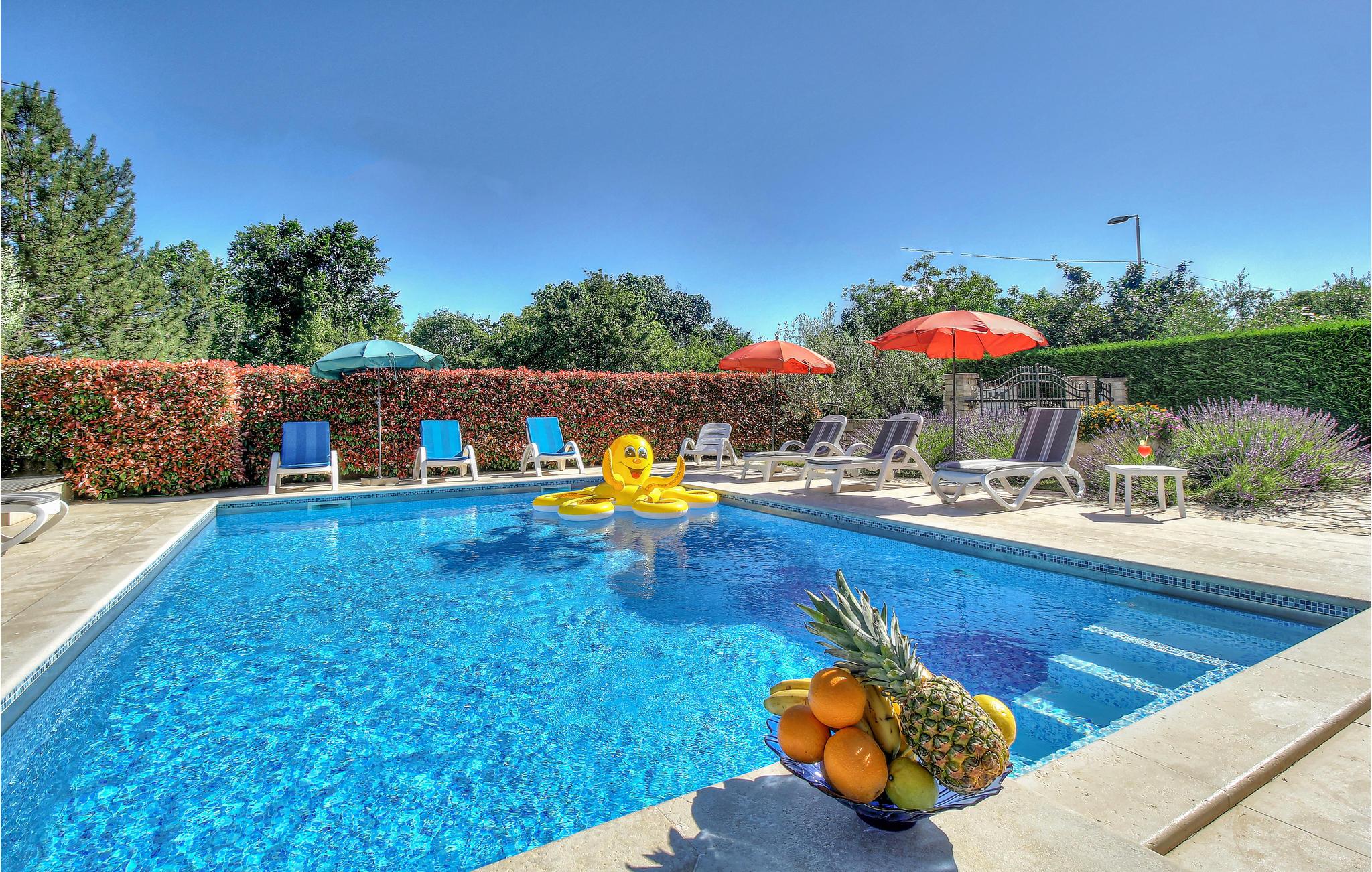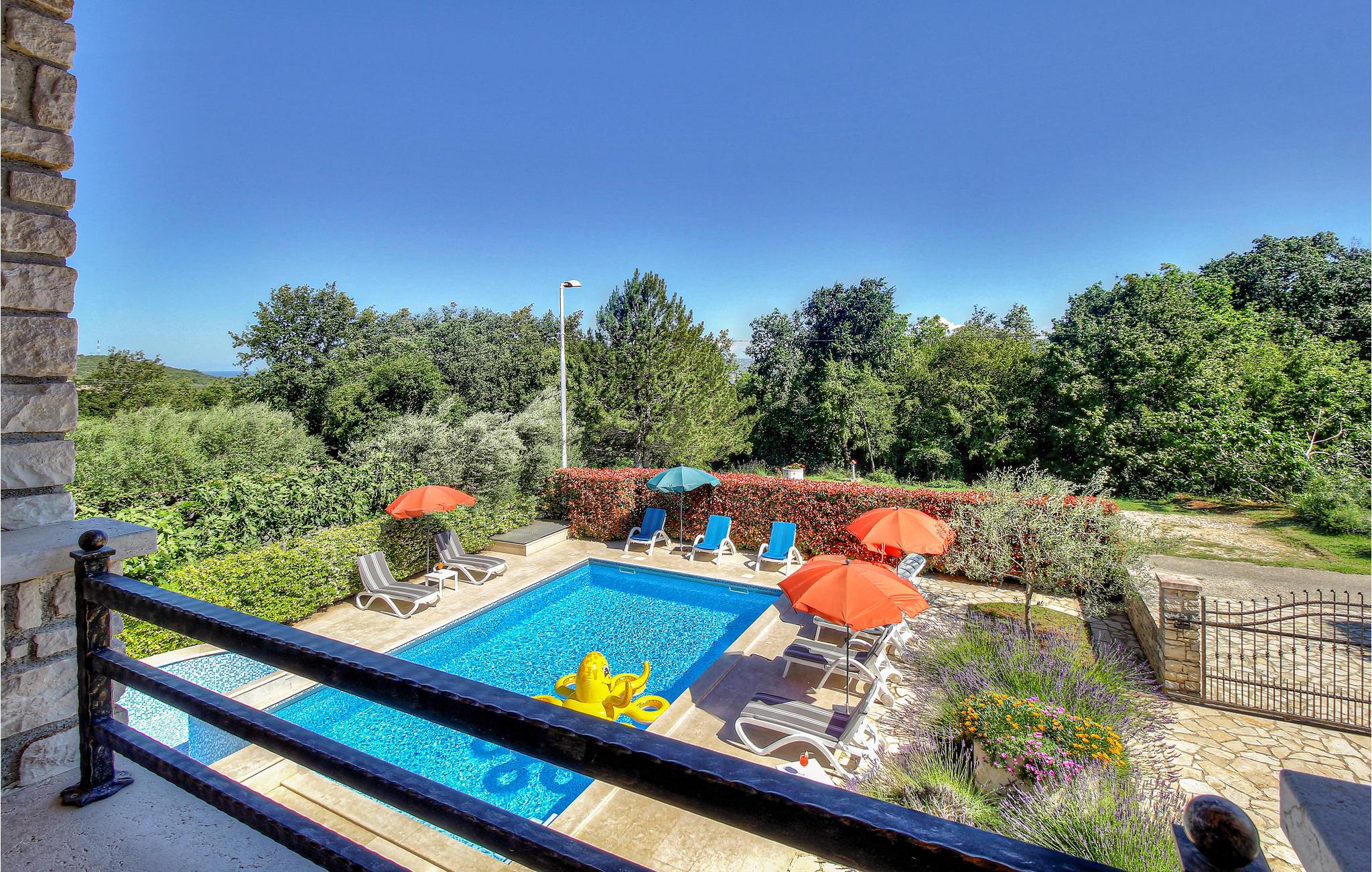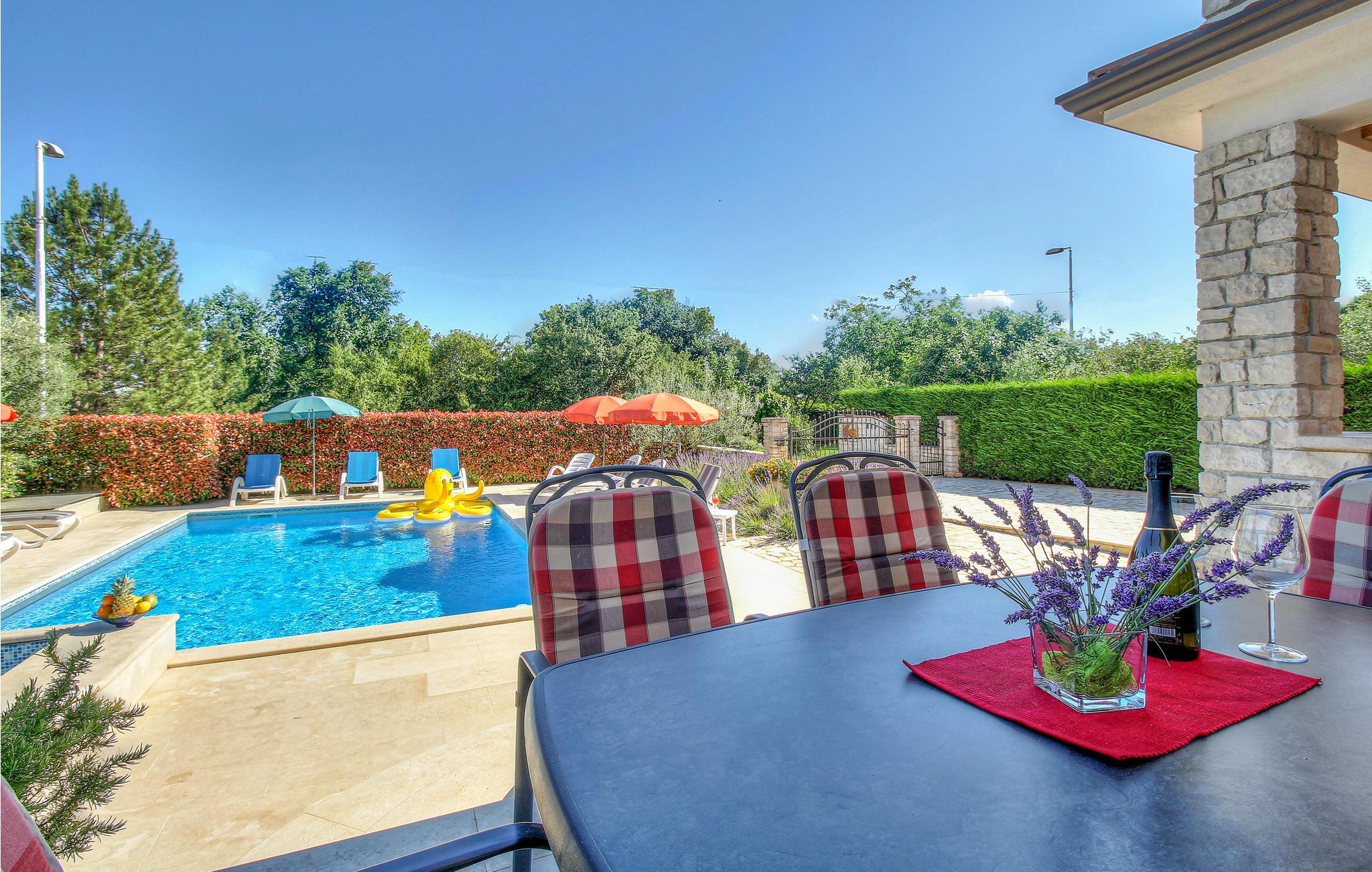 I den lille, rolige landsby Plovanija, tæt på grænsen mellem Slovenien og Kroatien, ligger dette smukke feriehus med swimmingpool, der består af tre lejligheder med separate indgange. Hver lejlighed har et køkken og en stue, soveværelser samt et badeværelse. De åbne, lyse og rummelige værelser skaber en hyggelig atmosfære. Fra stuen på første sal er der adgang til den indbydende terrasse og poolen. Her kan I tilbringe mange solrige timer med ferielæsning og tage en forfriskende dukkert i det kølige vand. I Plovanija findes et kasino. I den nærliggende by Umag, kun 10 minutters kørsel fra huset, afholdes hvert år ATP-tennisturneringen – et sandt højdepunkt for sportsentusiaster. Uanset om I planlægger en aktiv ferie eller blot ønsker at koble fra og slappe af, finder I her perfekte rammer for jeres ophold.
