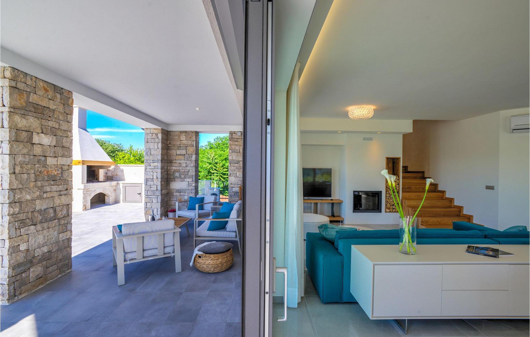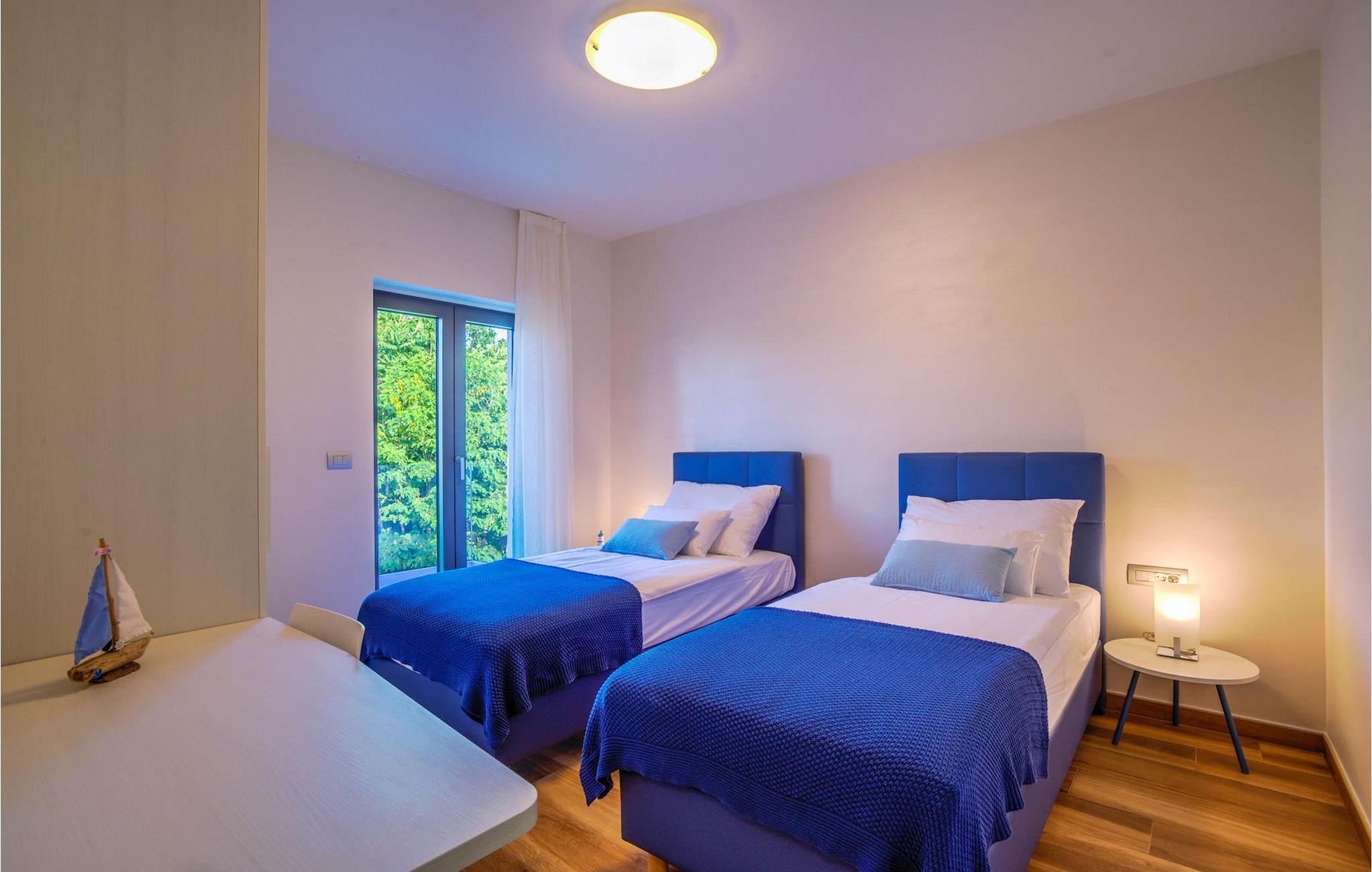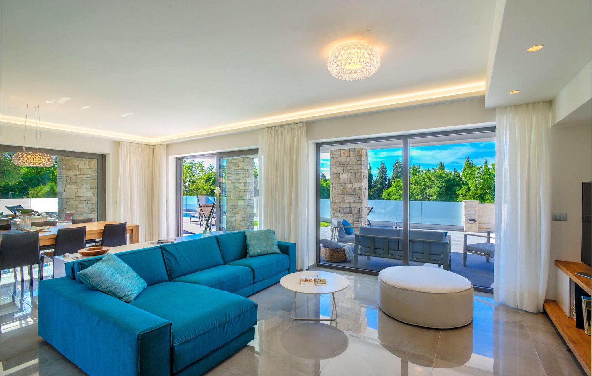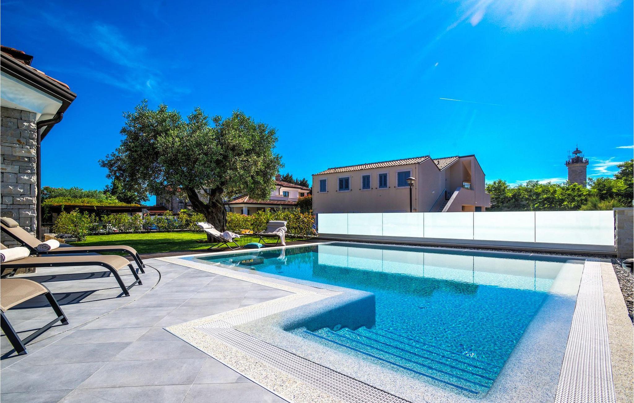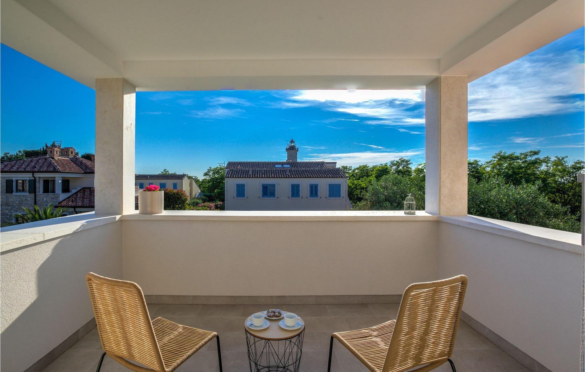 Fantastiske Villa Vista Savudrija er uden tvivl et fremragende valg til en afslappende ferie for familie og venner. Denne rummelige og moderne designet villa kan rumme i alt 8 gæster fordelt på 2 etager og 4 soveværelser. Det udendørs område vil helt sikkert opfylde alle dine ferieforventninger. En 33m2 privat pool med hydromassage vil ikke kun holde børnene beskæftiget i temmelig lang tid, men den vil tilbyde dig en tiltrængt forfriskning på de varme middelhavssommerdage. Slap af ved poolen på liggestolene, læs din yndlingsbog, eller nyd blot en forfriskende drink. Udendørsområdet har også et forbløffende gammelt oliventræ, hvorunder naturlig skygge kan du helt slippe hverdagens stress. Et dejligt overdækket loungeområde er også perfekt til f.eks. at nippe til din morgenkaffe. Herfra kan du komme ind i den rummelige indendørs opholdsstue bestående af stue, spiseplads og fuldt udstyret køkken. Dette rum er fuldt airconditioneret, fyldt med naturligt lys takket være gallerivinduerne og moderne designet med træ og blå detaljer. På denne etage vil gæsterne finde et soveværelse med en dobbeltseng og et badeværelse med bruser. På anden sal er 3 ekstra soveværelser, 2 med 2 enkeltsenge og 1 med en dobbeltseng, og 2 badeværelser hver med bruser. Så hvis du ønsker at udforske Istrien og blive indkvarteret i en pæn og moderne villa, er Vista Savudrija måske den perfekte pasform. Begynd at planlægge dit kroatiske eventyr i dag, og kom for at finde ud af, hvorfor gæsterne elsker det her!Villa Vista Savudrija er beliggende i hjertet af Savudrija, den nordvestlige top af Istriens kyst. Dette område er kendt for windsurfing og golf. Villaen er beliggende tæt på stranden, barer, restauranter. Savudrija, engang fiskerlandsby, ligger kun en kort køretur fra kystbyen Umag. Umag tilbyder et stort udvalg af fritidsaktiviteter, turistfaciliteter samt en lille havn. Fremragende restauranter, barer og caféer kan findes i dens brostensbelagte gader. Hver juli finder ATP Croatian Open sted på Stella Maris tenniscenter, hvor mange af de største navne deltager i mændene. Det magiske istriske landskab, der er berømt for sine fortryllende middelalderbyer på en bakketop samt gastronomiske fornøjelser, nås hurtigt ad fremragende veje.