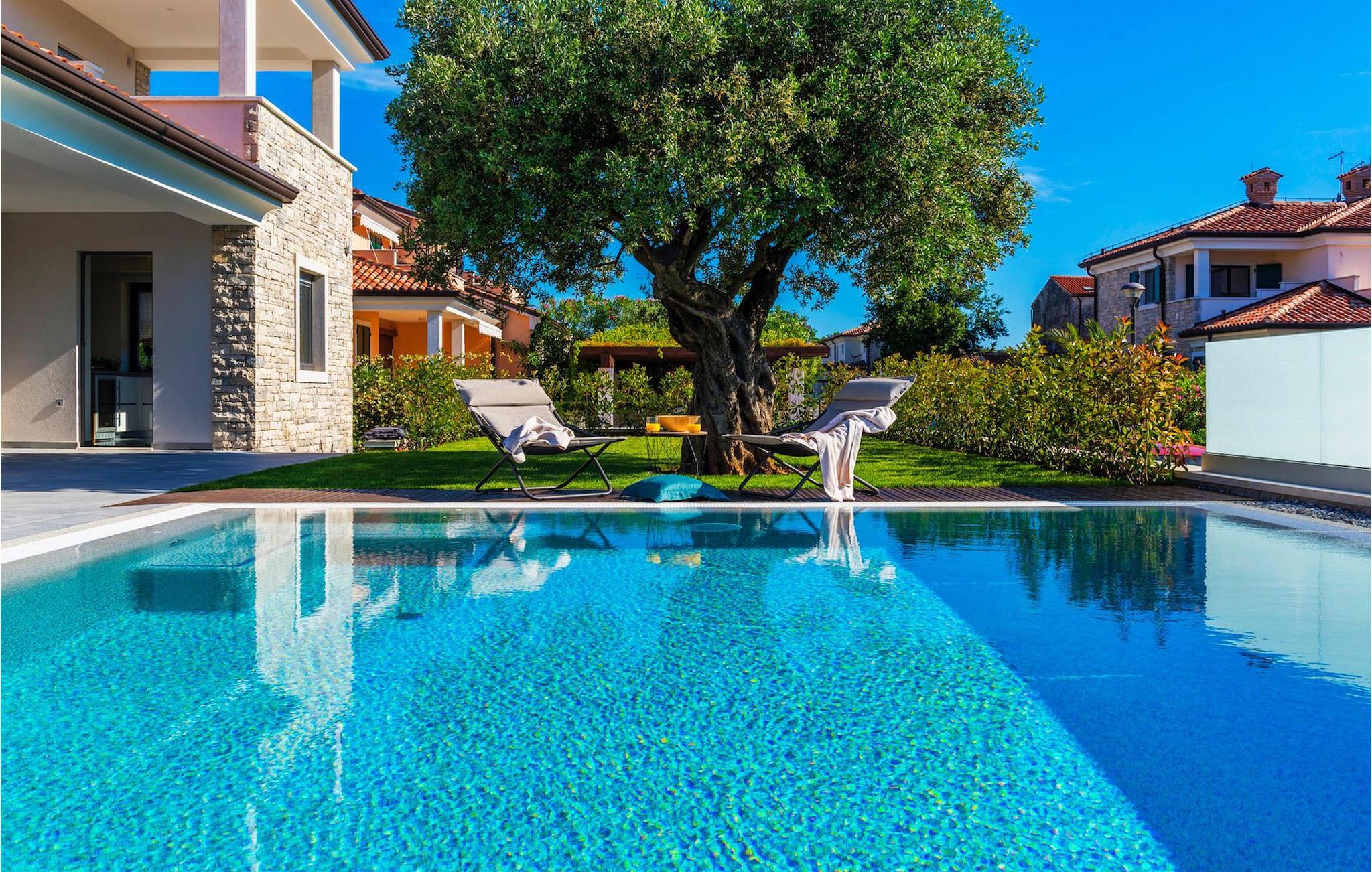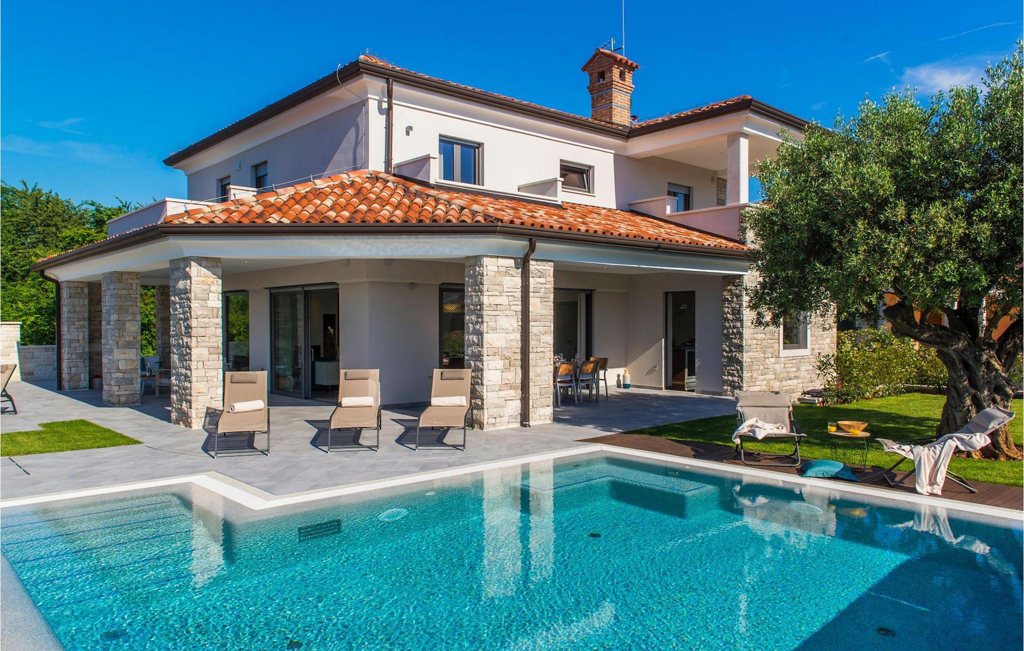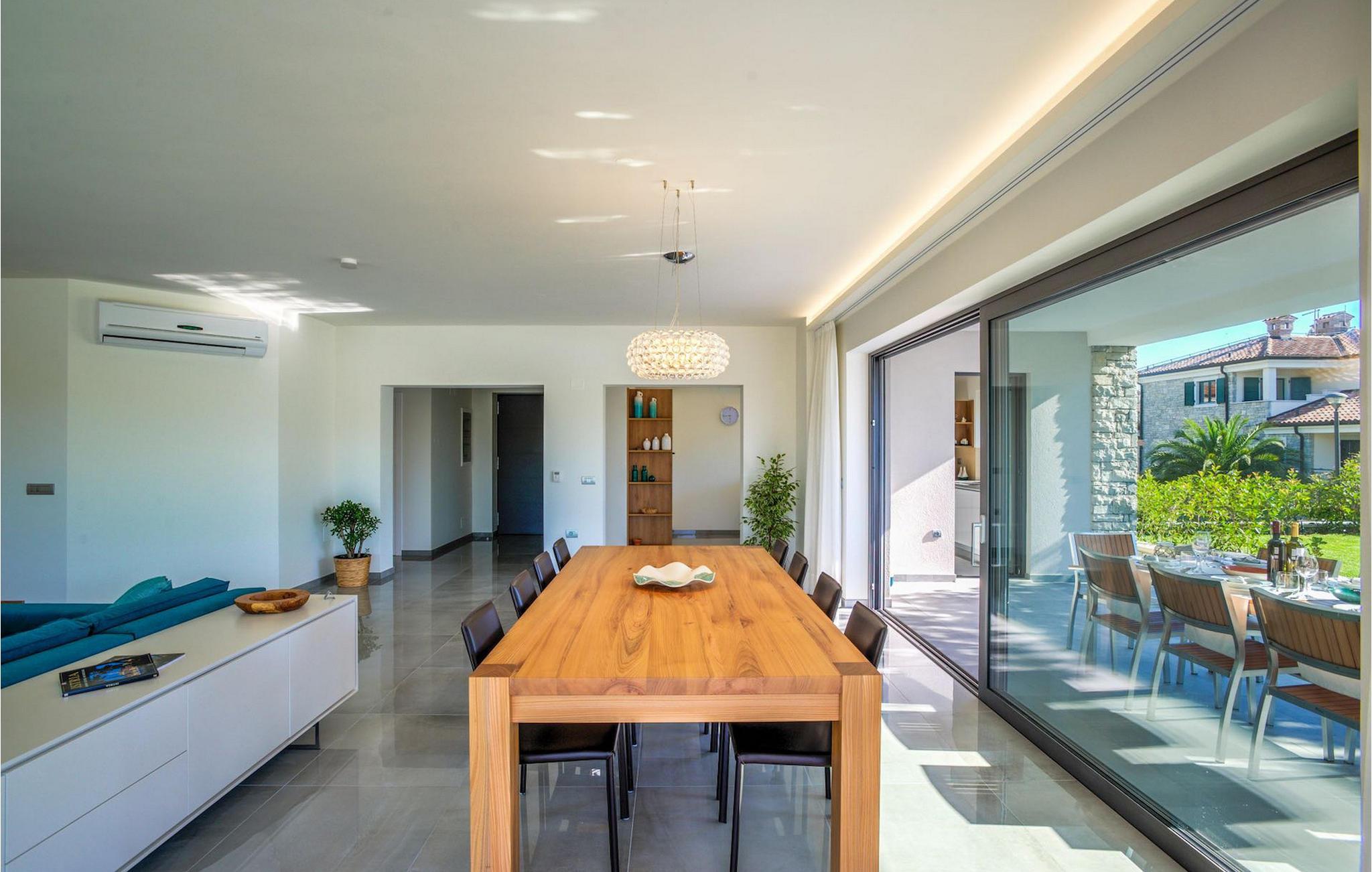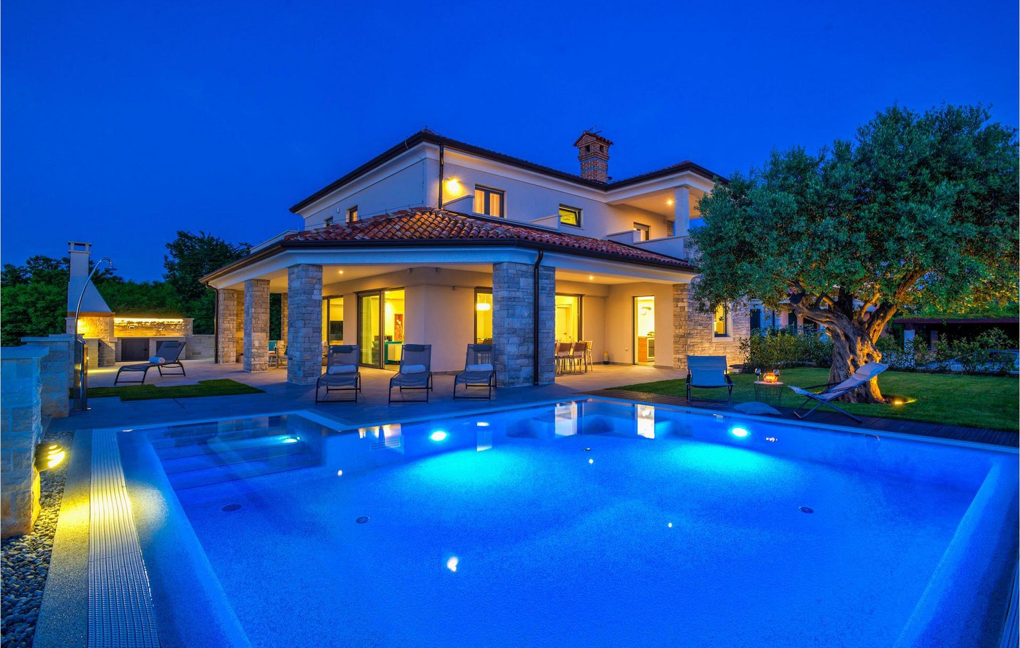 Fantastiske Villa Vista Savudrija er uden tvivl et fremragende valg til en afslappende ferie for familie og venner. Denne rummelige og moderne designet villa kan rumme i alt 8 gæster fordelt på 2 etager og 4 soveværelser. Det udendørs område vil helt sikkert opfylde alle dine ferieforventninger. En 33m2 privat pool med hydromassage vil ikke kun holde børnene beskæftiget i temmelig lang tid, men den vil tilbyde dig en tiltrængt forfriskning på de varme middelhavssommerdage. Slap af ved poolen på liggestolene, læs din yndlingsbog, eller nyd blot en forfriskende drink. Udendørsområdet har også et forbløffende gammelt oliventræ, hvorunder naturlig skygge kan du helt slippe hverdagens stress. Et dejligt overdækket loungeområde er også perfekt til f.eks. at nippe til din morgenkaffe. Herfra kan du komme ind i den rummelige indendørs opholdsstue bestående af stue, spiseplads og fuldt udstyret køkken. Dette rum er fuldt airconditioneret, fyldt med naturligt lys takket være gallerivinduerne og moderne designet med træ og blå detaljer. På denne etage vil gæsterne finde et soveværelse med en dobbeltseng og et badeværelse med bruser. På anden sal er 3 ekstra soveværelser, 2 med 2 enkeltsenge og 1 med en dobbeltseng, og 2 badeværelser hver med bruser. Så hvis du ønsker at udforske Istrien og blive indkvarteret i en pæn og moderne villa, er Vista Savudrija måske den perfekte pasform. Begynd at planlægge dit kroatiske eventyr i dag, og kom for at finde ud af, hvorfor gæsterne elsker det her!Villa Vista Savudrija er beliggende i hjertet af Savudrija, den nordvestlige top af Istriens kyst. Dette område er kendt for windsurfing og golf. Villaen er beliggende tæt på stranden, barer, restauranter. Savudrija, engang fiskerlandsby, ligger kun en kort køretur fra kystbyen Umag. Umag tilbyder et stort udvalg af fritidsaktiviteter, turistfaciliteter samt en lille havn. Fremragende restauranter, barer og caféer kan findes i dens brostensbelagte gader. Hver juli finder ATP Croatian Open sted på Stella Maris tenniscenter, hvor mange af de største navne deltager i mændene. Det magiske istriske landskab, der er berømt for sine fortryllende middelalderbyer på en bakketop samt gastronomiske fornøjelser, nås hurtigt ad fremragende veje.