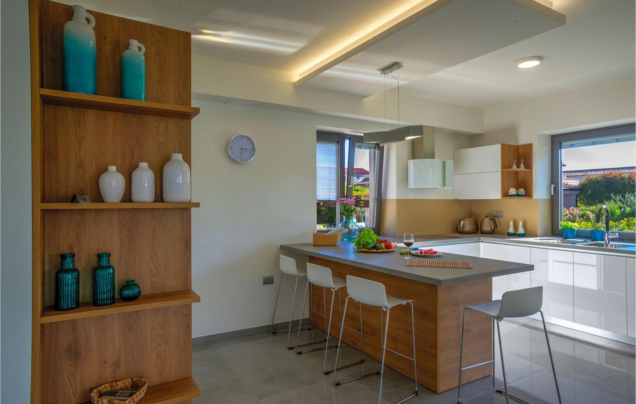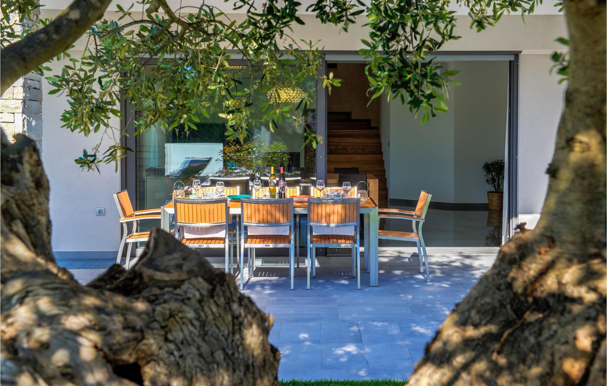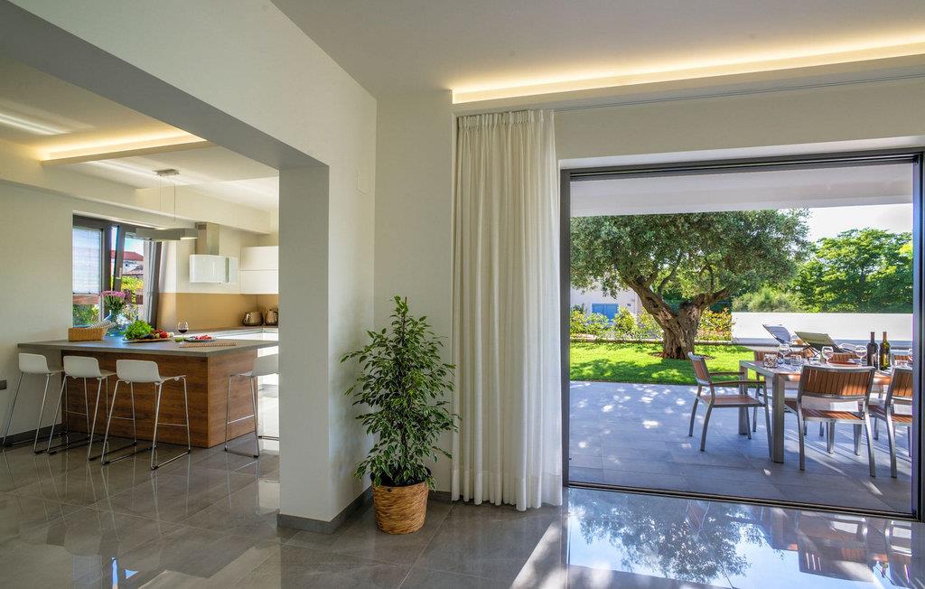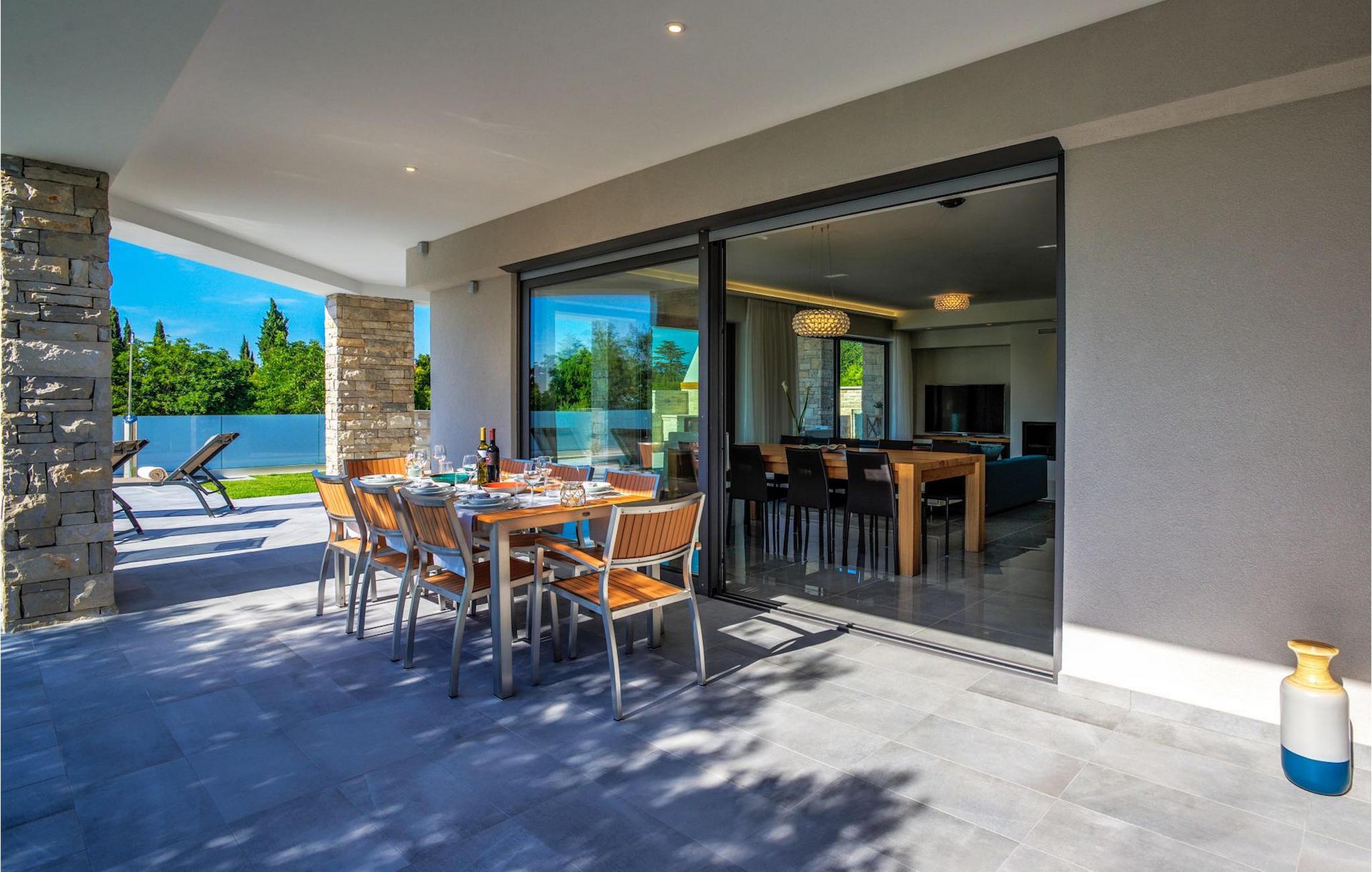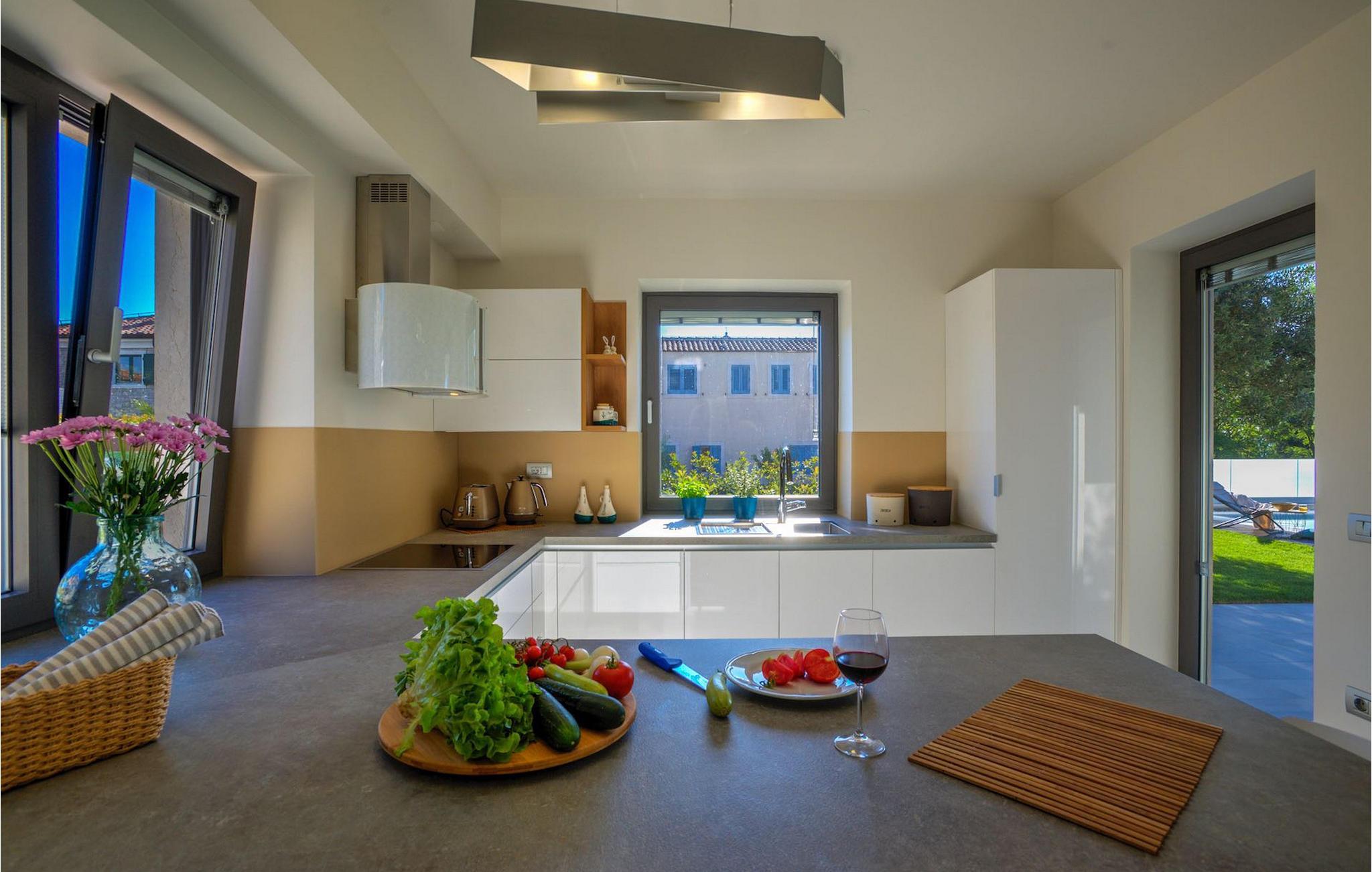 Fantastiske Villa Vista Savudrija er uden tvivl et fremragende valg til en afslappende ferie for familie og venner. Denne rummelige og moderne designet villa kan rumme i alt 8 gæster fordelt på 2 etager og 4 soveværelser. Det udendørs område vil helt sikkert opfylde alle dine ferieforventninger. En 33m2 privat pool med hydromassage vil ikke kun holde børnene beskæftiget i temmelig lang tid, men den vil tilbyde dig en tiltrængt forfriskning på de varme middelhavssommerdage. Slap af ved poolen på liggestolene, læs din yndlingsbog, eller nyd blot en forfriskende drink. Udendørsområdet har også et forbløffende gammelt oliventræ, hvorunder naturlig skygge kan du helt slippe hverdagens stress. Et dejligt overdækket loungeområde er også perfekt til f.eks. at nippe til din morgenkaffe. Herfra kan du komme ind i den rummelige indendørs opholdsstue bestående af stue, spiseplads og fuldt udstyret køkken. Dette rum er fuldt airconditioneret, fyldt med naturligt lys takket være gallerivinduerne og moderne designet med træ og blå detaljer. På denne etage vil gæsterne finde et soveværelse med en dobbeltseng og et badeværelse med bruser. På anden sal er 3 ekstra soveværelser, 2 med 2 enkeltsenge og 1 med en dobbeltseng, og 2 badeværelser hver med bruser. Så hvis du ønsker at udforske Istrien og blive indkvarteret i en pæn og moderne villa, er Vista Savudrija måske den perfekte pasform. Begynd at planlægge dit kroatiske eventyr i dag, og kom for at finde ud af, hvorfor gæsterne elsker det her!Villa Vista Savudrija er beliggende i hjertet af Savudrija, den nordvestlige top af Istriens kyst. Dette område er kendt for windsurfing og golf. Villaen er beliggende tæt på stranden, barer, restauranter. Savudrija, engang fiskerlandsby, ligger kun en kort køretur fra kystbyen Umag. Umag tilbyder et stort udvalg af fritidsaktiviteter, turistfaciliteter samt en lille havn. Fremragende restauranter, barer og caféer kan findes i dens brostensbelagte gader. Hver juli finder ATP Croatian Open sted på Stella Maris tenniscenter, hvor mange af de største navne deltager i mændene. Det magiske istriske landskab, der er berømt for sine fortryllende middelalderbyer på en bakketop samt gastronomiske fornøjelser, nås hurtigt ad fremragende veje.