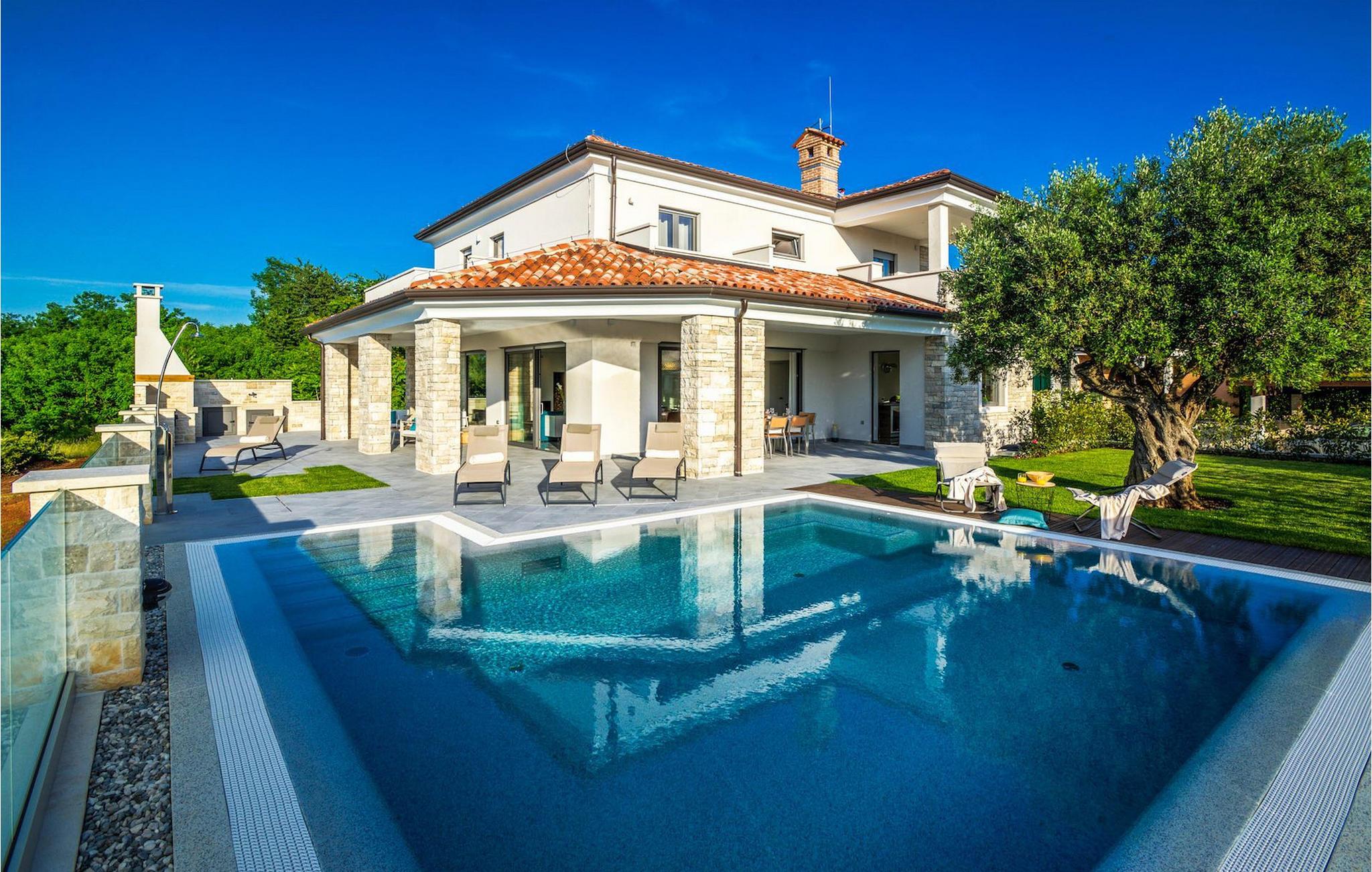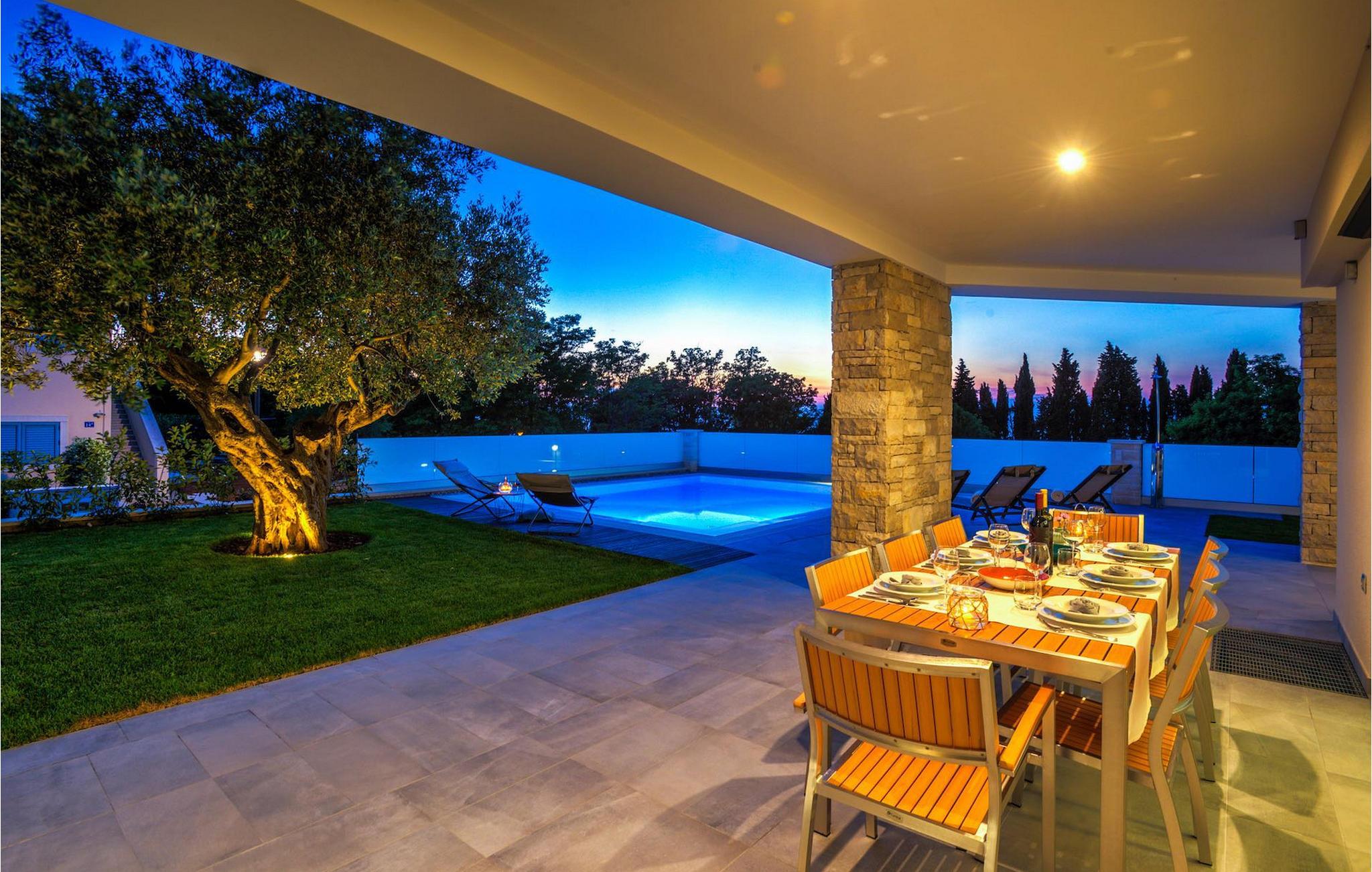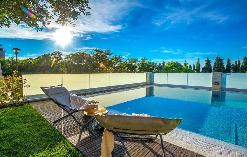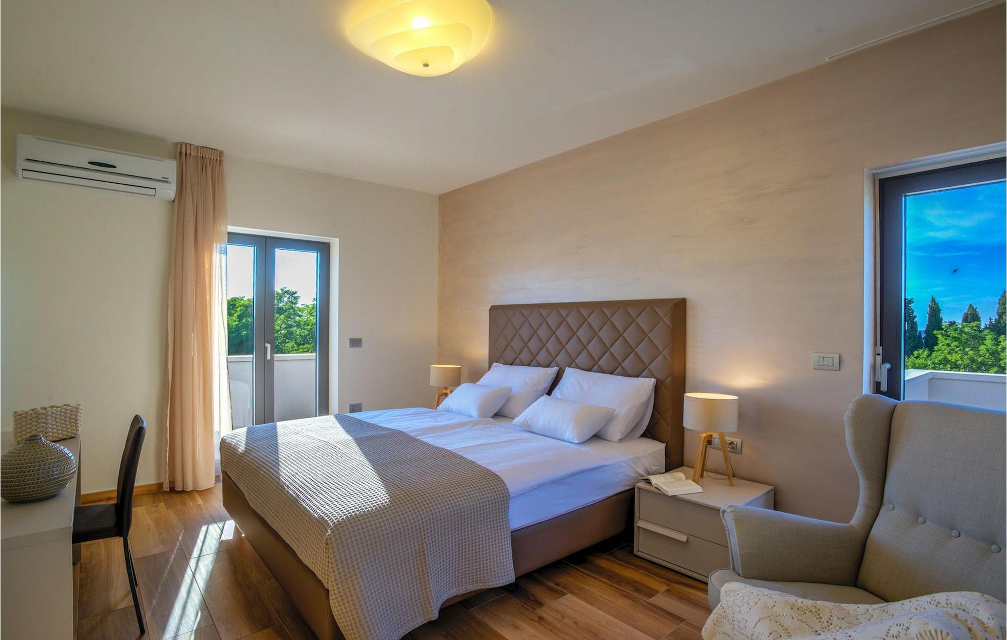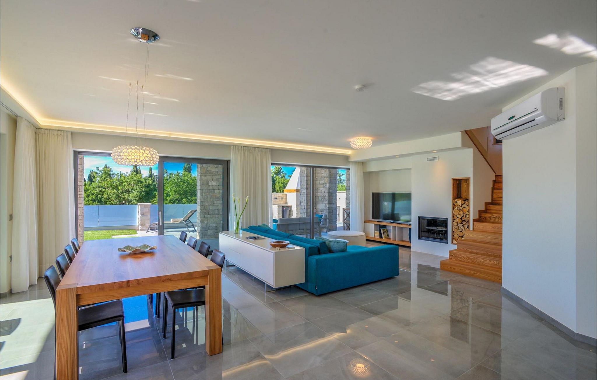 Fantastiske Villa Vista Savudrija er uden tvivl et fremragende valg til en afslappende ferie for familie og venner. Denne rummelige og moderne designet villa kan rumme i alt 8 gæster fordelt på 2 etager og 4 soveværelser. Det udendørs område vil helt sikkert opfylde alle dine ferieforventninger. En 33m2 privat pool med hydromassage vil ikke kun holde børnene beskæftiget i temmelig lang tid, men den vil tilbyde dig en tiltrængt forfriskning på de varme middelhavssommerdage. Slap af ved poolen på liggestolene, læs din yndlingsbog, eller nyd blot en forfriskende drink. Udendørsområdet har også et forbløffende gammelt oliventræ, hvorunder naturlig skygge kan du helt slippe hverdagens stress. Et dejligt overdækket loungeområde er også perfekt til f.eks. at nippe til din morgenkaffe. Herfra kan du komme ind i den rummelige indendørs opholdsstue bestående af stue, spiseplads og fuldt udstyret køkken. Dette rum er fuldt airconditioneret, fyldt med naturligt lys takket være gallerivinduerne og moderne designet med træ og blå detaljer. På denne etage vil gæsterne finde et soveværelse med en dobbeltseng og et badeværelse med bruser. På anden sal er 3 ekstra soveværelser, 2 med 2 enkeltsenge og 1 med en dobbeltseng, og 2 badeværelser hver med bruser. Så hvis du ønsker at udforske Istrien og blive indkvarteret i en pæn og moderne villa, er Vista Savudrija måske den perfekte pasform. Begynd at planlægge dit kroatiske eventyr i dag, og kom for at finde ud af, hvorfor gæsterne elsker det her!Villa Vista Savudrija er beliggende i hjertet af Savudrija, den nordvestlige top af Istriens kyst. Dette område er kendt for windsurfing og golf. Villaen er beliggende tæt på stranden, barer, restauranter. Savudrija, engang fiskerlandsby, ligger kun en kort køretur fra kystbyen Umag. Umag tilbyder et stort udvalg af fritidsaktiviteter, turistfaciliteter samt en lille havn. Fremragende restauranter, barer og caféer kan findes i dens brostensbelagte gader. Hver juli finder ATP Croatian Open sted på Stella Maris tenniscenter, hvor mange af de største navne deltager i mændene. Det magiske istriske landskab, der er berømt for sine fortryllende middelalderbyer på en bakketop samt gastronomiske fornøjelser, nås hurtigt ad fremragende veje.
