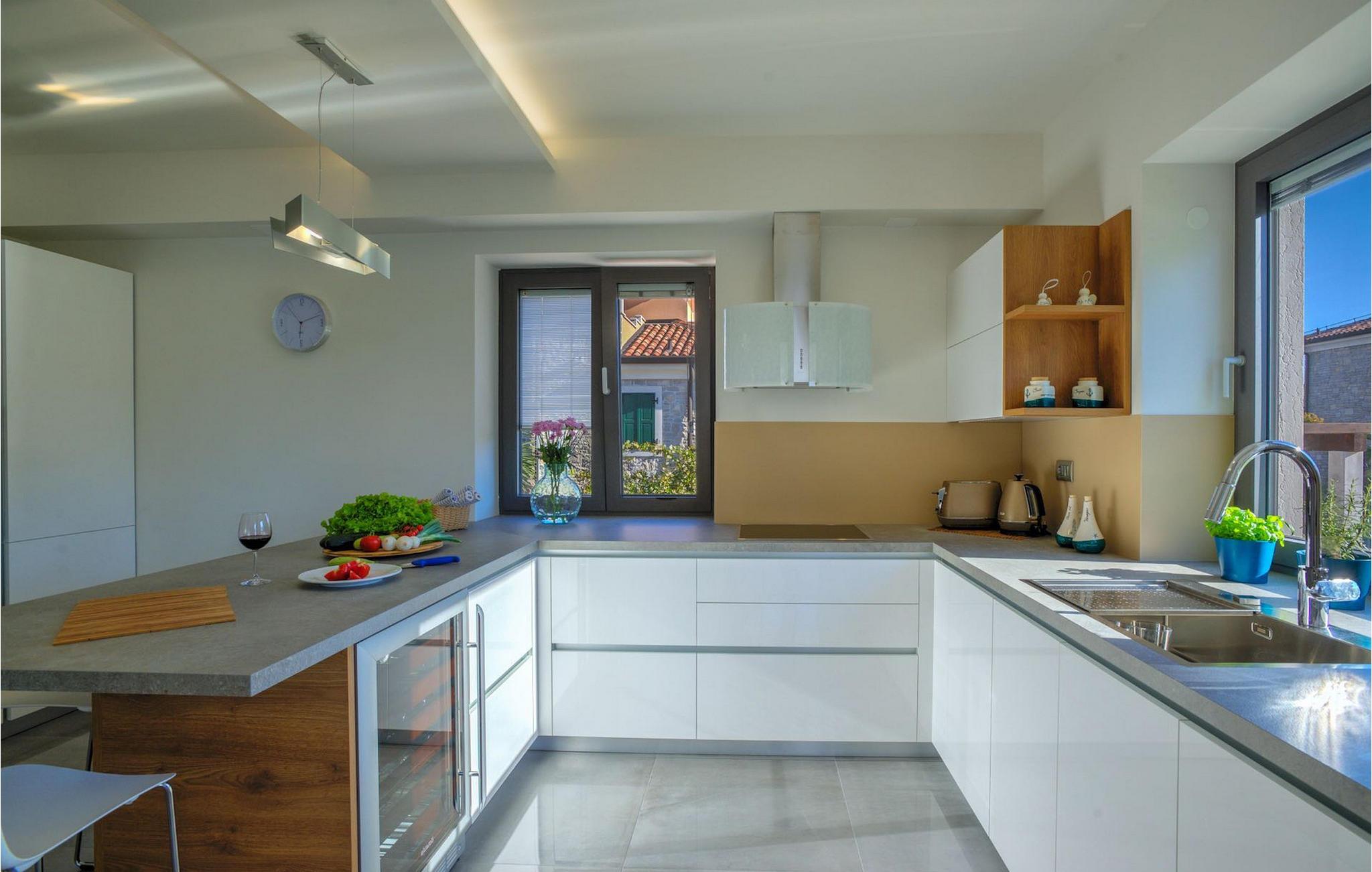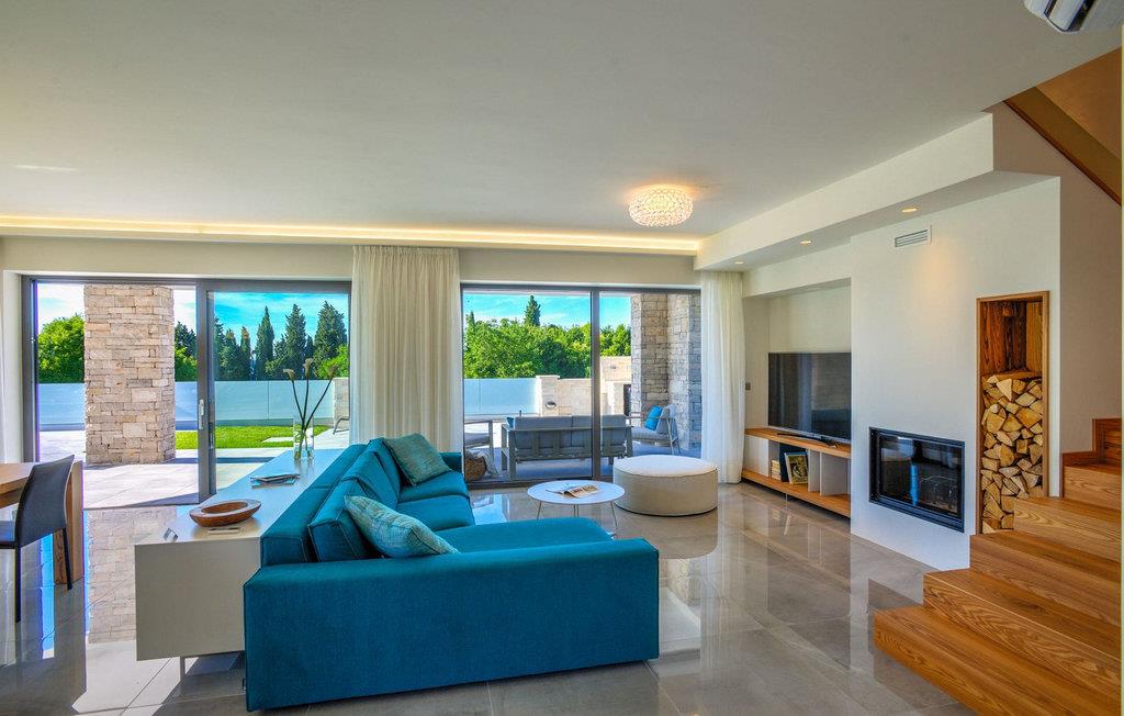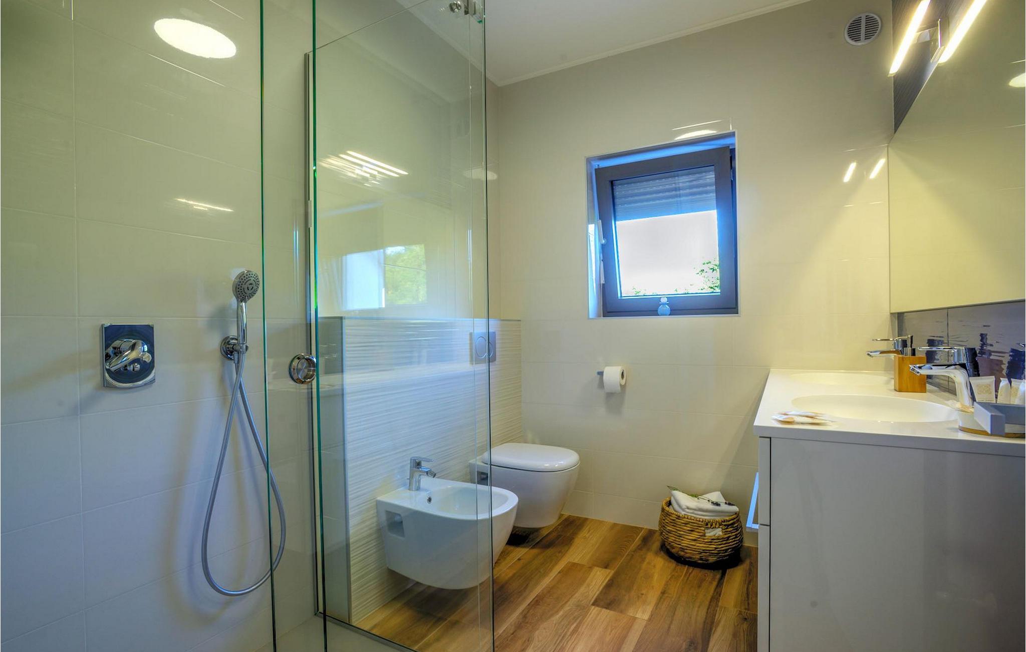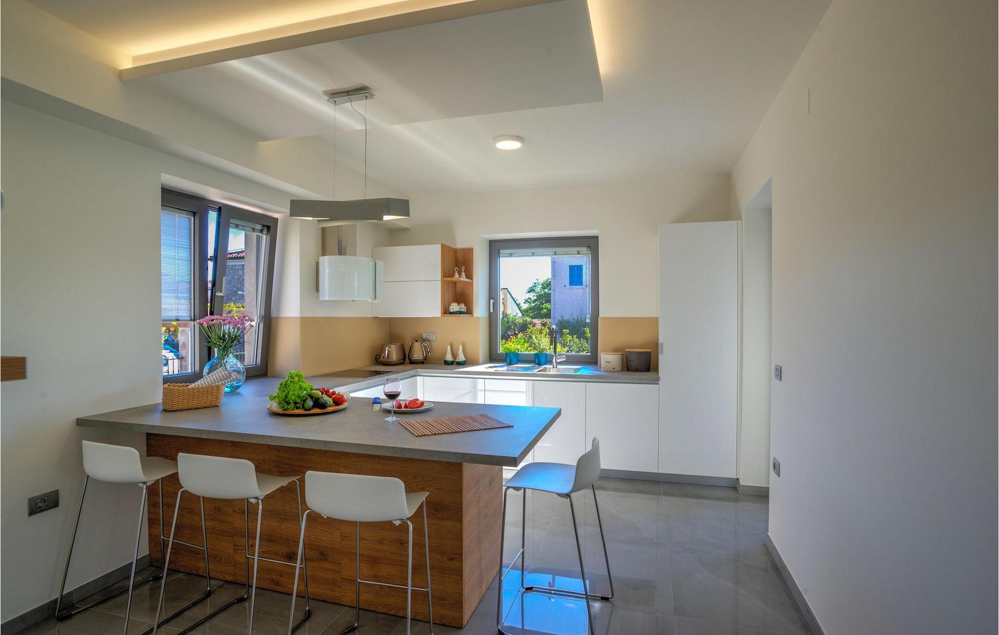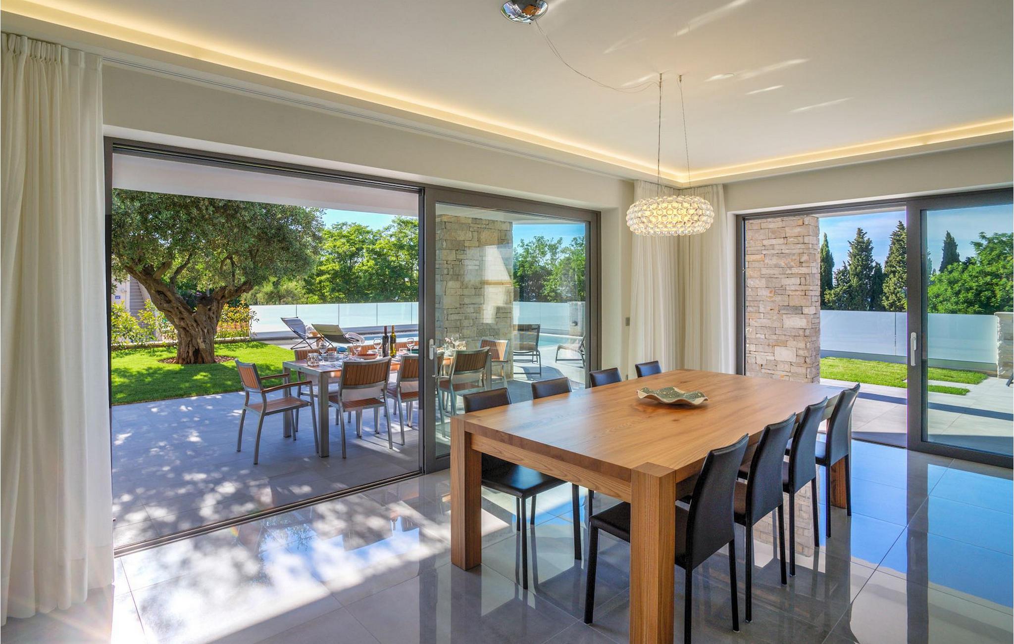 Fantastiske Villa Vista Savudrija er uden tvivl et fremragende valg til en afslappende ferie for familie og venner. Denne rummelige og moderne designet villa kan rumme i alt 8 gæster fordelt på 2 etager og 4 soveværelser. Det udendørs område vil helt sikkert opfylde alle dine ferieforventninger. En 33m2 privat pool med hydromassage vil ikke kun holde børnene beskæftiget i temmelig lang tid, men den vil tilbyde dig en tiltrængt forfriskning på de varme middelhavssommerdage. Slap af ved poolen på liggestolene, læs din yndlingsbog, eller nyd blot en forfriskende drink. Udendørsområdet har også et forbløffende gammelt oliventræ, hvorunder naturlig skygge kan du helt slippe hverdagens stress. Et dejligt overdækket loungeområde er også perfekt til f.eks. at nippe til din morgenkaffe. Herfra kan du komme ind i den rummelige indendørs opholdsstue bestående af stue, spiseplads og fuldt udstyret køkken. Dette rum er fuldt airconditioneret, fyldt med naturligt lys takket være gallerivinduerne og moderne designet med træ og blå detaljer. På denne etage vil gæsterne finde et soveværelse med en dobbeltseng og et badeværelse med bruser. På anden sal er 3 ekstra soveværelser, 2 med 2 enkeltsenge og 1 med en dobbeltseng, og 2 badeværelser hver med bruser. Så hvis du ønsker at udforske Istrien og blive indkvarteret i en pæn og moderne villa, er Vista Savudrija måske den perfekte pasform. Begynd at planlægge dit kroatiske eventyr i dag, og kom for at finde ud af, hvorfor gæsterne elsker det her!Villa Vista Savudrija er beliggende i hjertet af Savudrija, den nordvestlige top af Istriens kyst. Dette område er kendt for windsurfing og golf. Villaen er beliggende tæt på stranden, barer, restauranter. Savudrija, engang fiskerlandsby, ligger kun en kort køretur fra kystbyen Umag. Umag tilbyder et stort udvalg af fritidsaktiviteter, turistfaciliteter samt en lille havn. Fremragende restauranter, barer og caféer kan findes i dens brostensbelagte gader. Hver juli finder ATP Croatian Open sted på Stella Maris tenniscenter, hvor mange af de største navne deltager i mændene. Det magiske istriske landskab, der er berømt for sine fortryllende middelalderbyer på en bakketop samt gastronomiske fornøjelser, nås hurtigt ad fremragende veje.