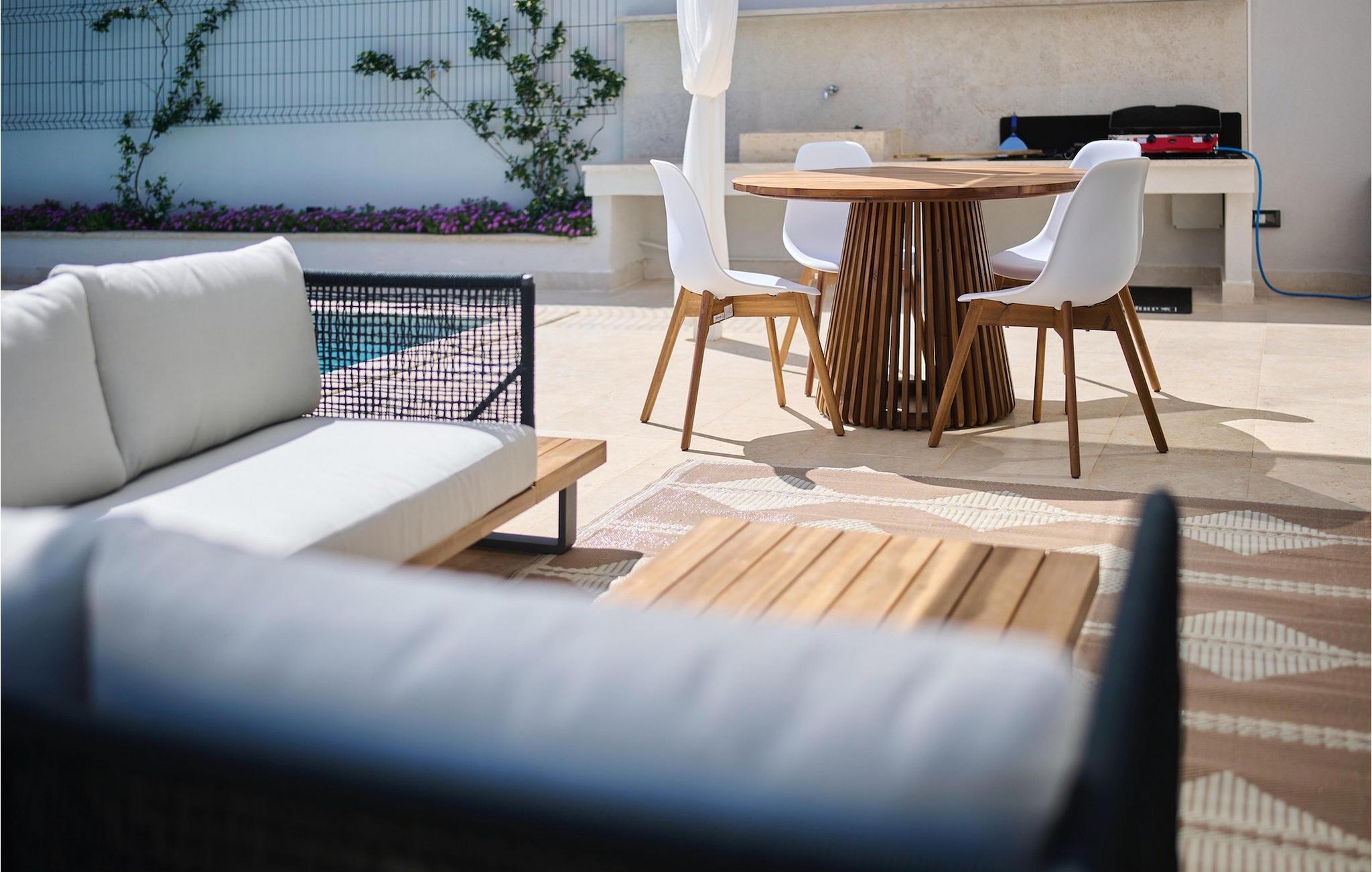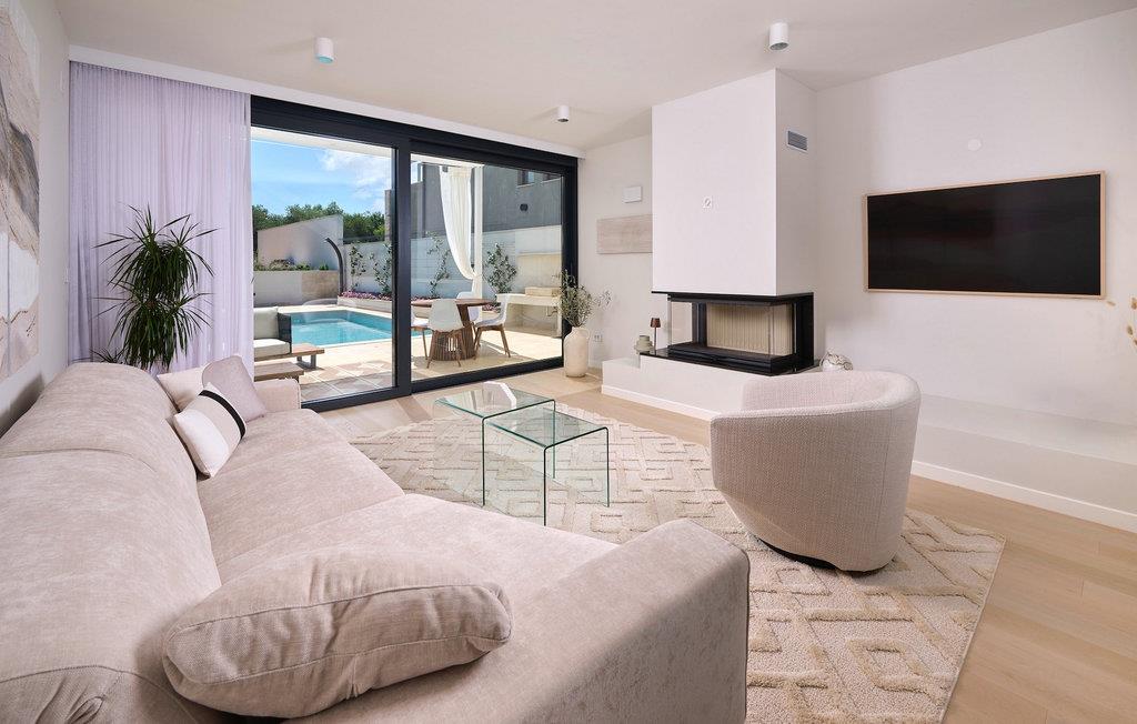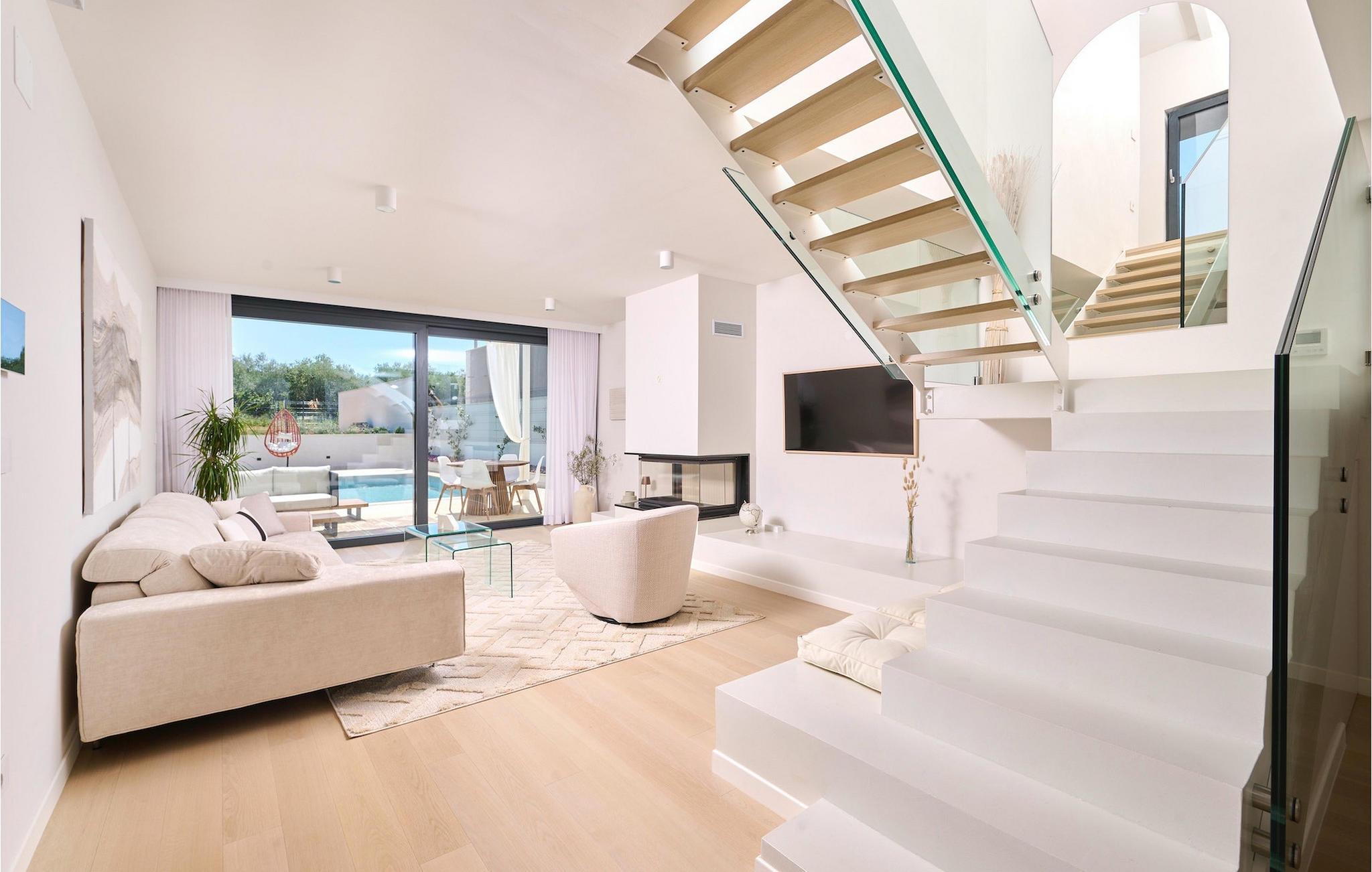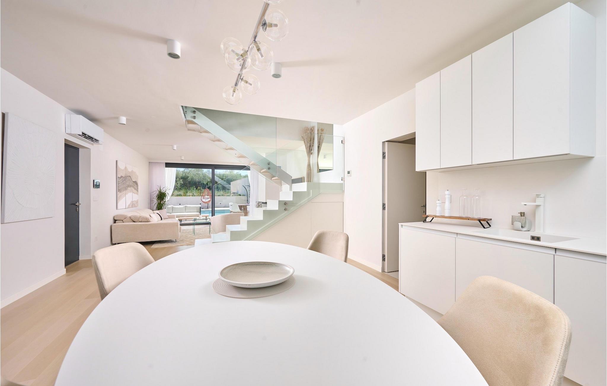 Begge soveværelser er placeret på første sal. Værelserne er moderne og komfortable. Begge værelser har tv og aircondition. Det store soveværelse byder på en dobbeltseng, mens det andet værelse byder på en dobbeltseng, der kan adskilles i to enkeltsenge, hvis det er nødvendigt. Der er også et badeværelse på samme etage. I villaens åbne stueetage finder du en lys, moderne indrettet stue med pejs og tv, samt spisestue og fuldt udstyret køkken. Der er også et badeværelse mere på gulvet. Hele stueetagen har aircondition og er ideel til din ferie. Villaens have byder på flere steder at slappe af. For det første er der en privat pool med liggestole. Til en pause fra solbadning og svømning kan du nyde den skyggefulde del af terrassen med et afslapningshjørne placeret ved siden af huset. I haven finder du også en skyggefuld spiseplads med spisebord, samt en grill, hvor du kan prøve dine kulinariske færdigheder.