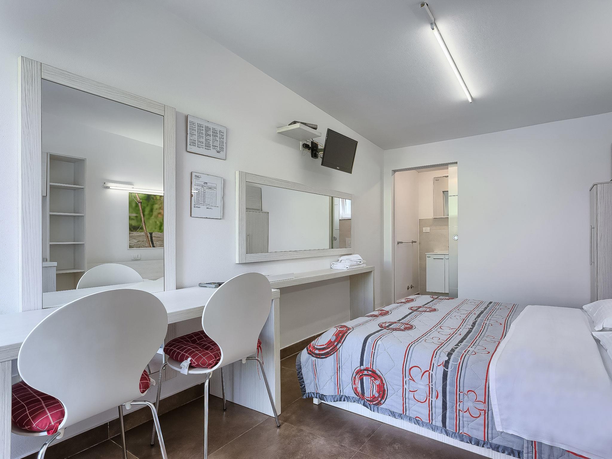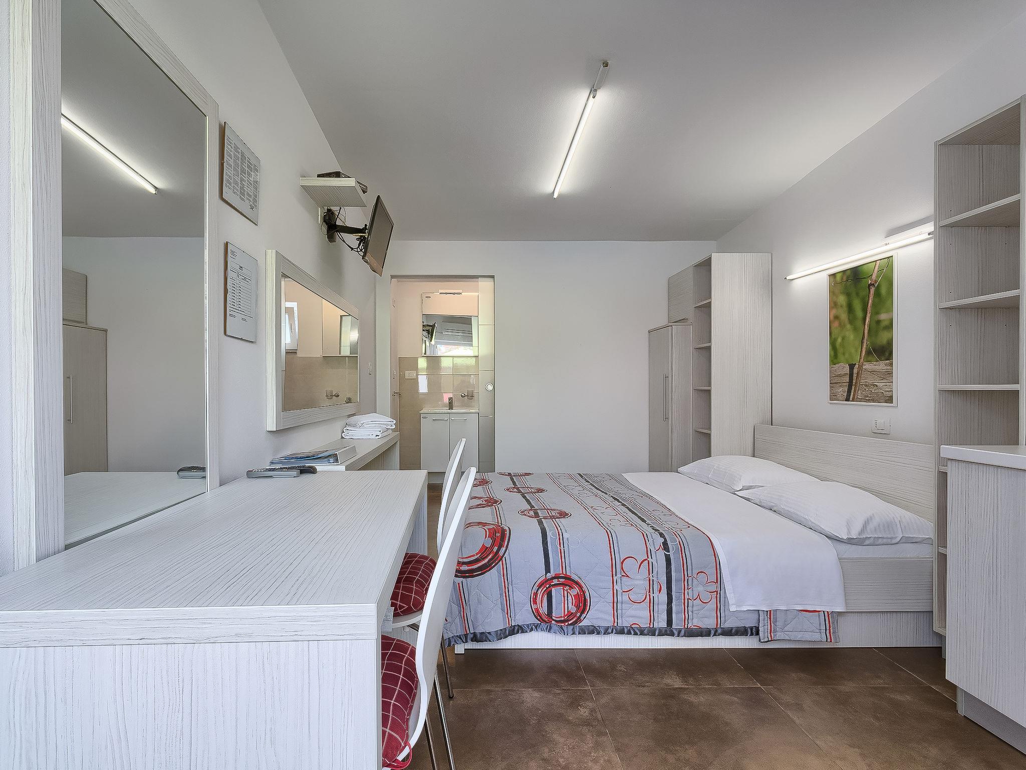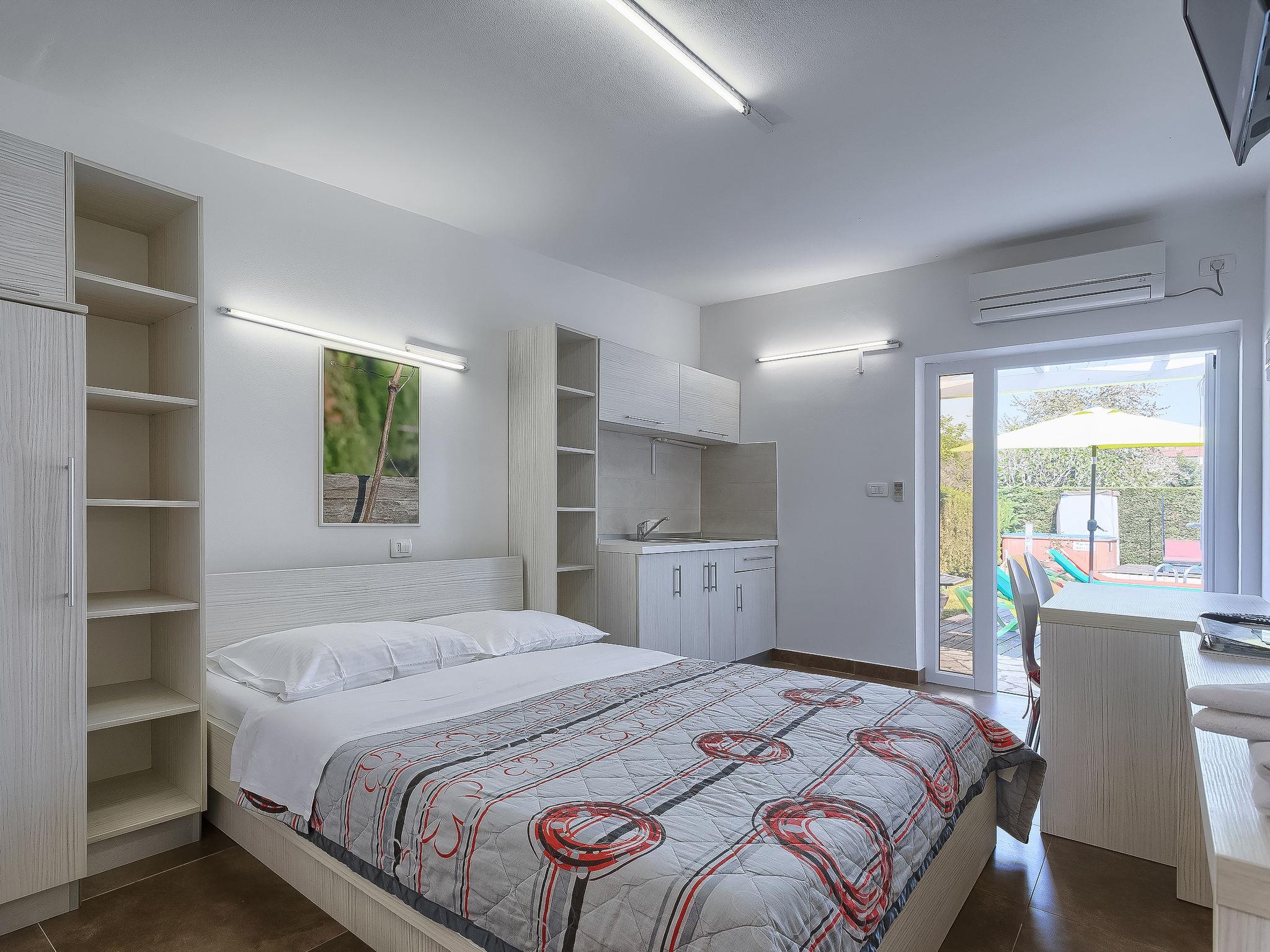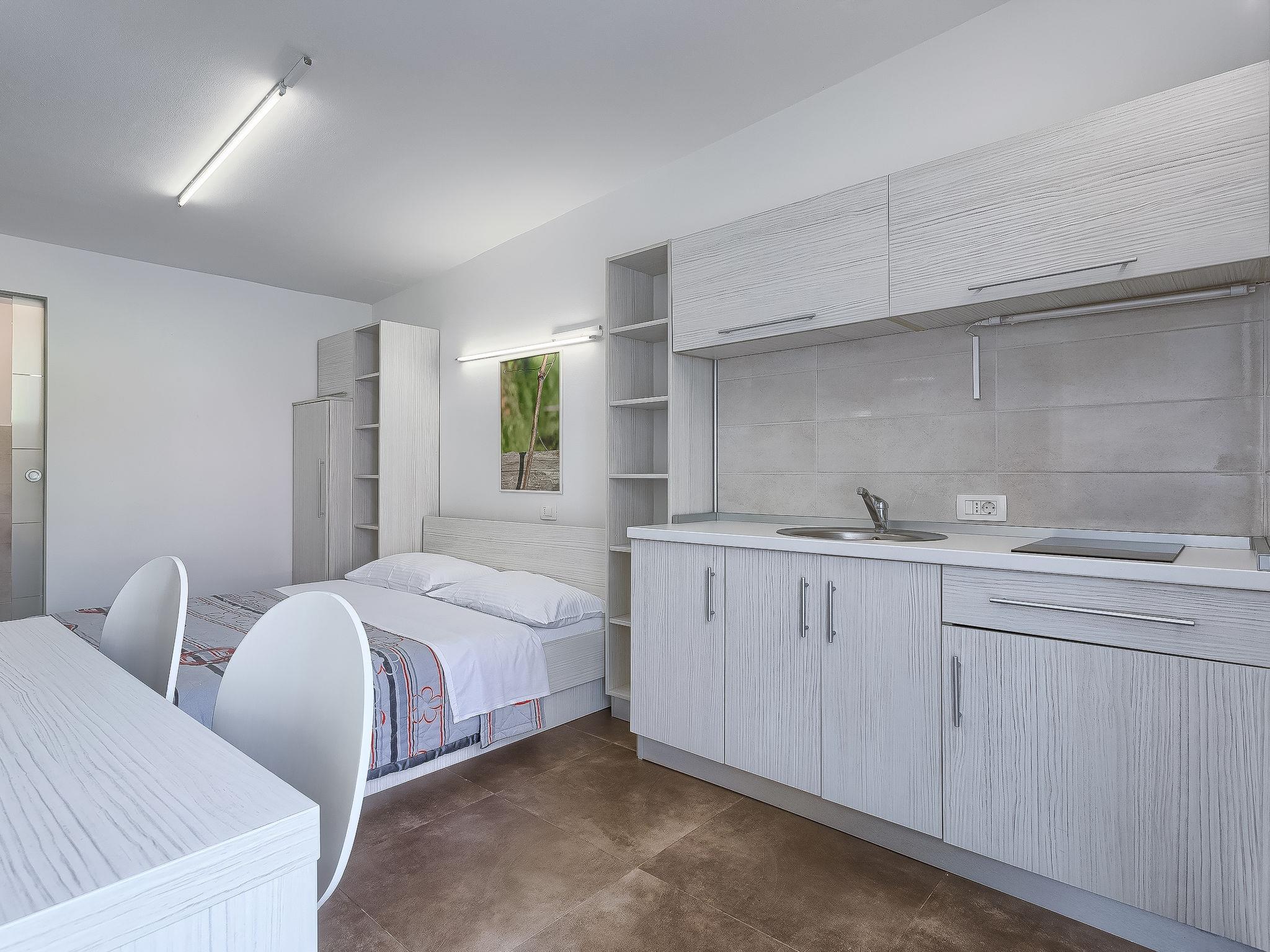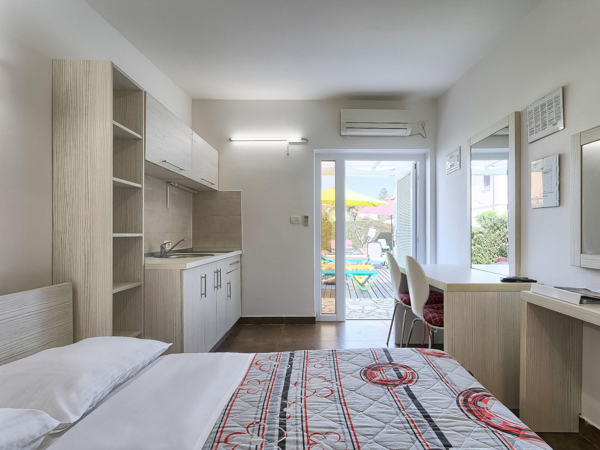 1-room apartment 18 m2, on the ground floor. Studio with 1 french bed (160 cm, length 200 cm), satellite TV (flat screen), air conditioning. Exit to the terrace, to the swimming pool. Open kitchen (2 ceramic glass hob hotplates, microwave) with dining table. Shower/WC. Terrace 6 m2, roofed. Terrace furniture. View of the swimming pool. Facilities: Internet (WiFi, free).
