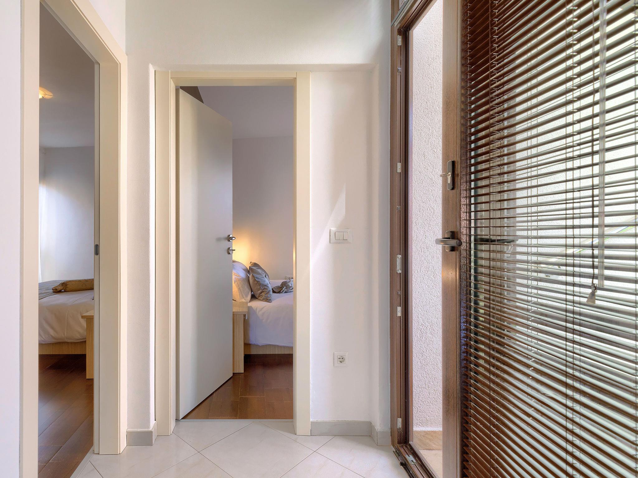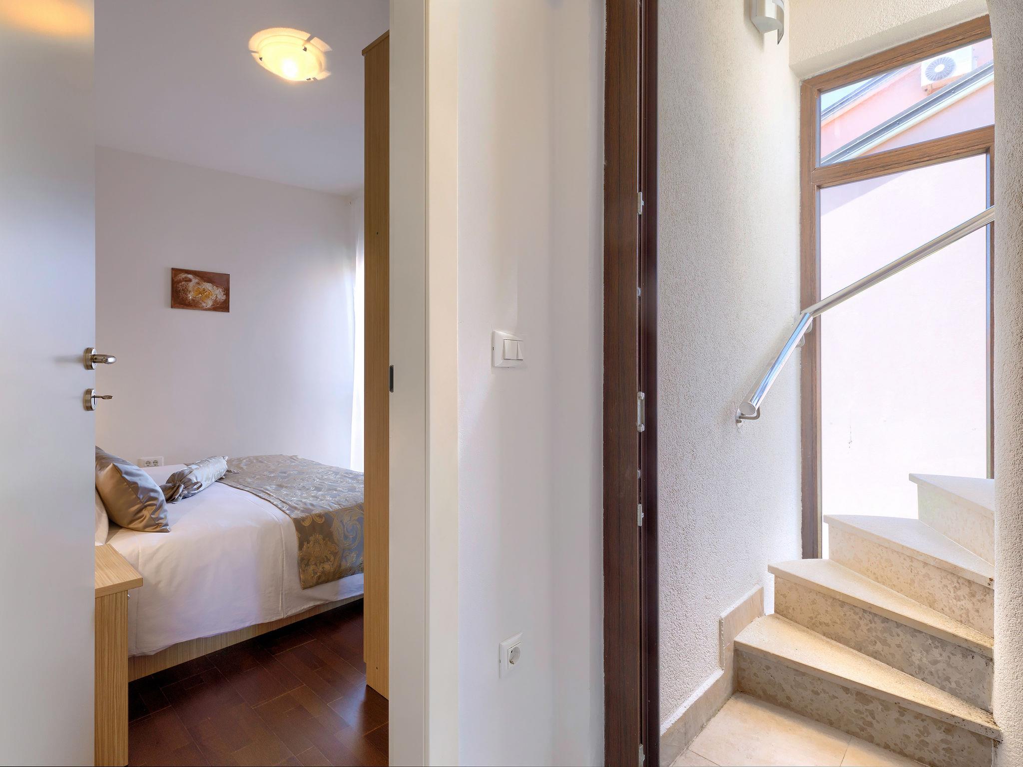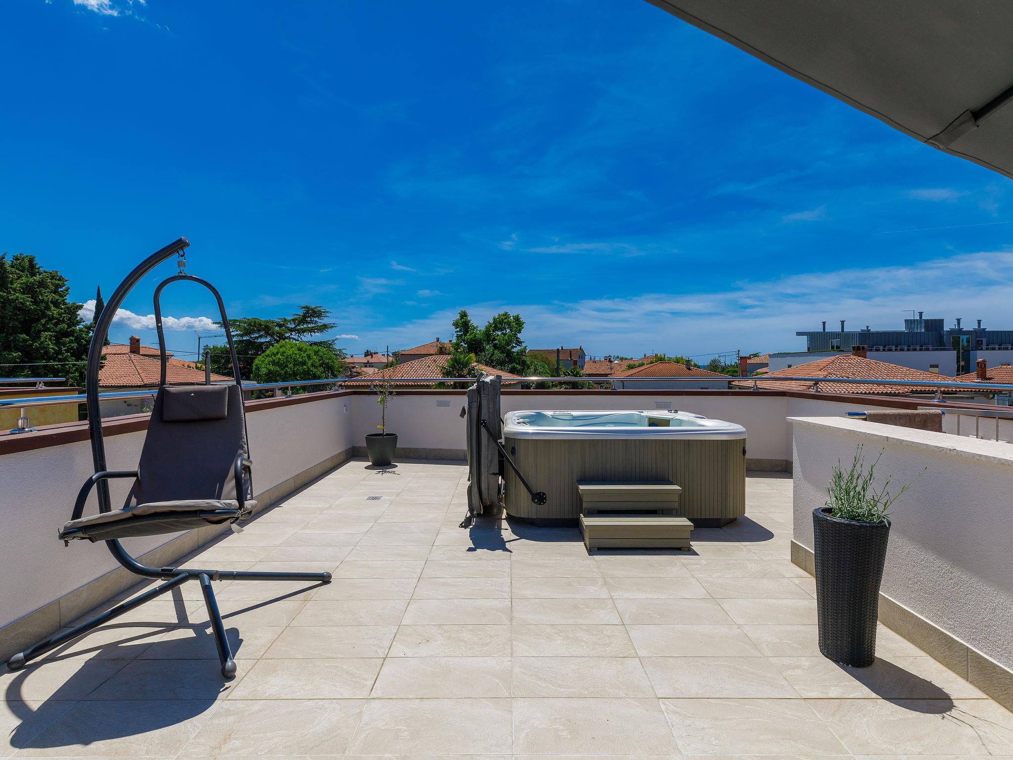 Apartment house "Villa Alpa". In the district of Punta 1 km from the centre of Umag, in a quiet, sunny position, 400 m from the sea, from the beach. For shared use: property 730 m2 (fenced), small garden. Garden furniture. Private: swimming pool (above ground) heated (2 x 2 m, seasonal availability: 29.Mar. - 15.Nov.). Terrace (45 m2). In the house: internet access, trampoline, roof terrace. Available: bicycles (extra). Parking at the house on the premises. Shop, restaurant 300 m, bus stop 1.9 km, pebble beach, rocky beach 400 m. Golf course (18 hole) 8 km, tennis 500 m, riding stable 1.5 km. Swimming pool for private use is a hot tub for 6 persons.