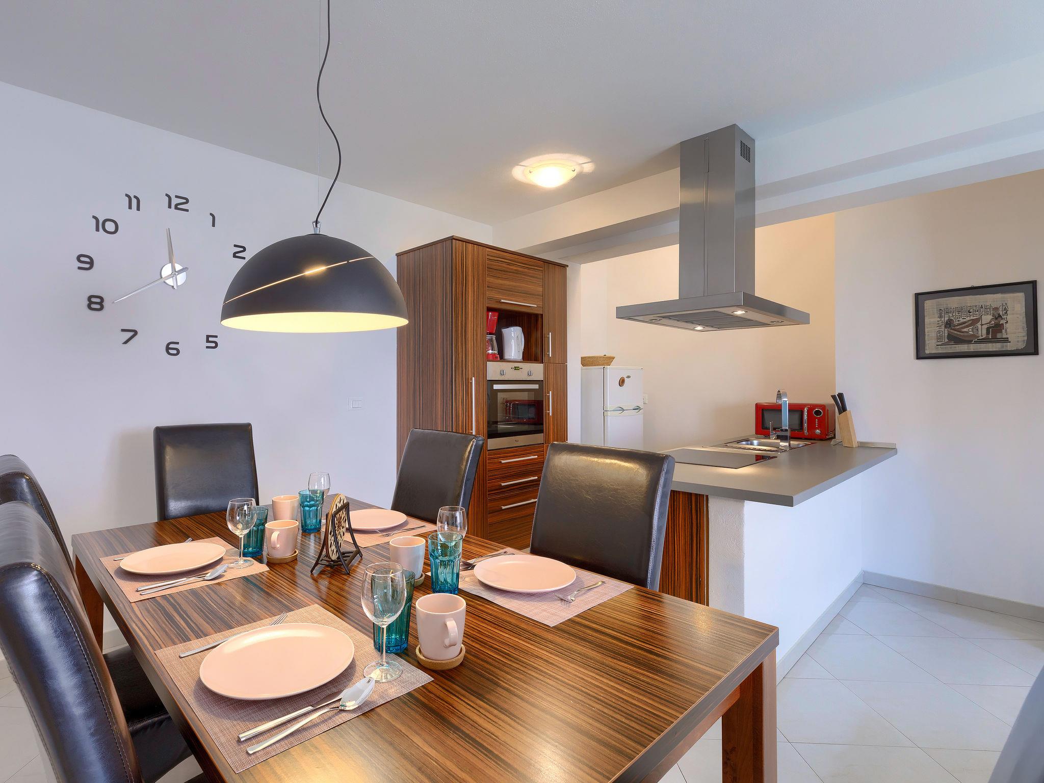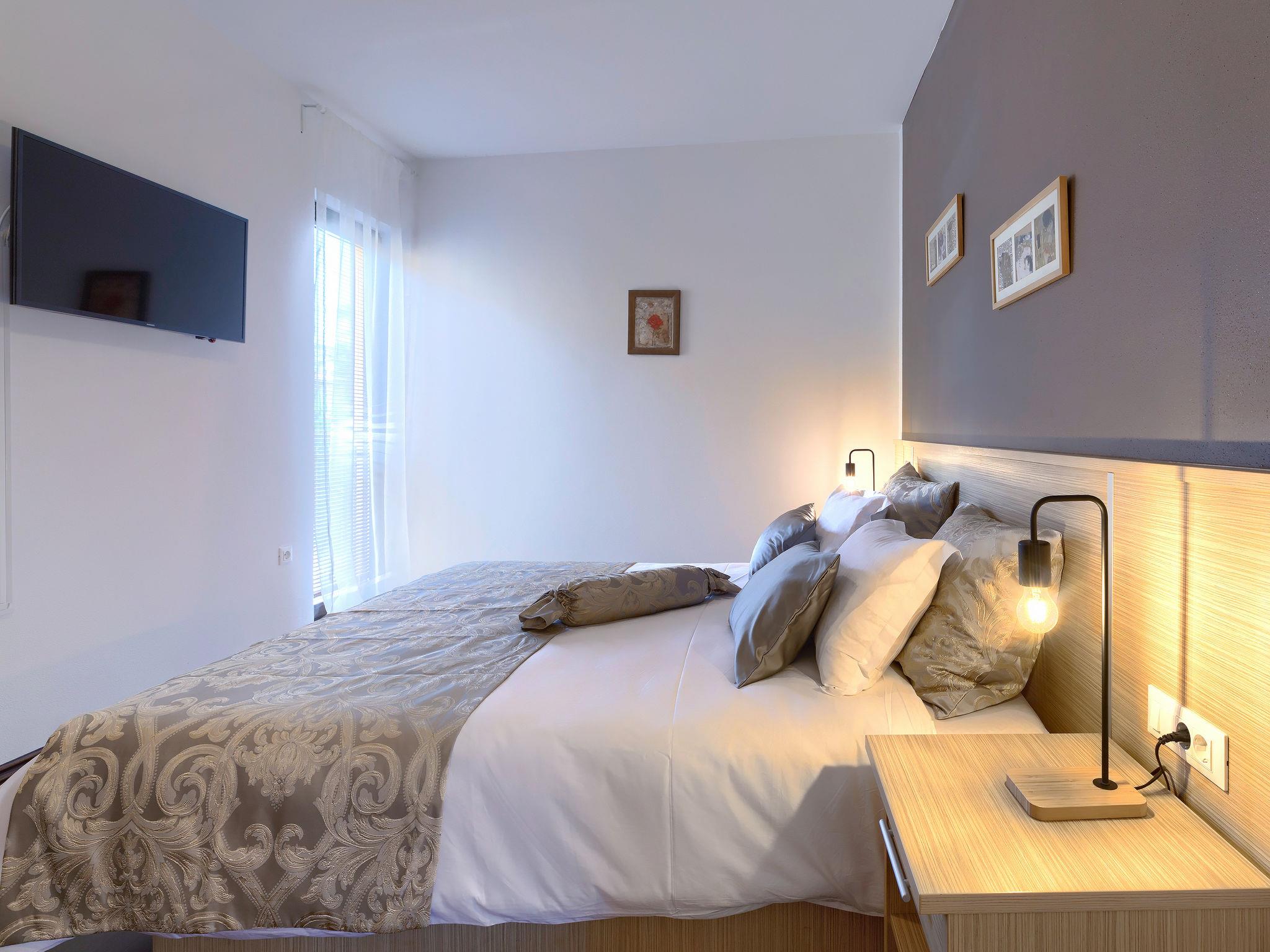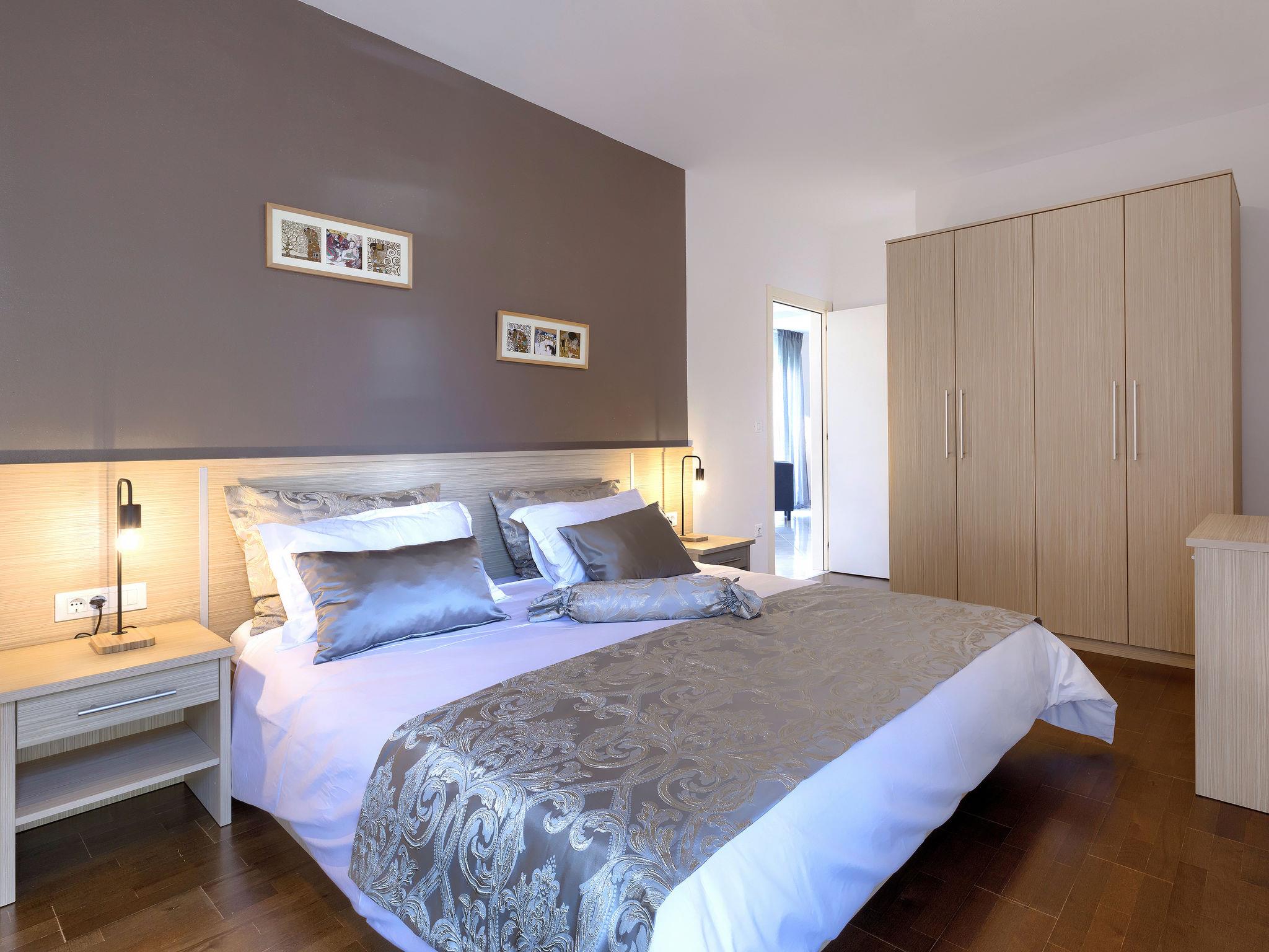 3-room apartment 64 m2 on 1st floor. Living/dining room 27 m2 with 1 double sofabed and satellite TV (flat screen), air conditioning. 1 room 15 m2 with 1 french bed (160 cm, length 200 cm), satellite TV. 1 room 20 m2 with 1 french bed (180 cm, length 200 cm), satellite TV. Open kitchen (oven, dishwasher, 4 ceramic glass hob hotplates, microwave, freezer). Bath/bidet/WC. Deck chairs. Facilities: Internet (WiFi, free).