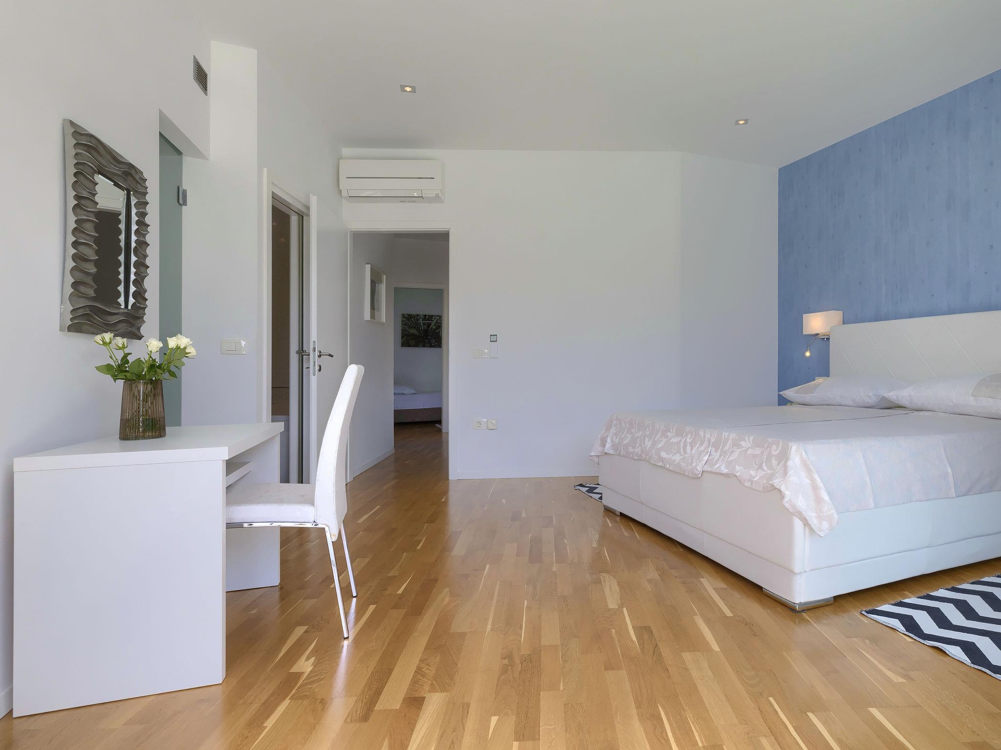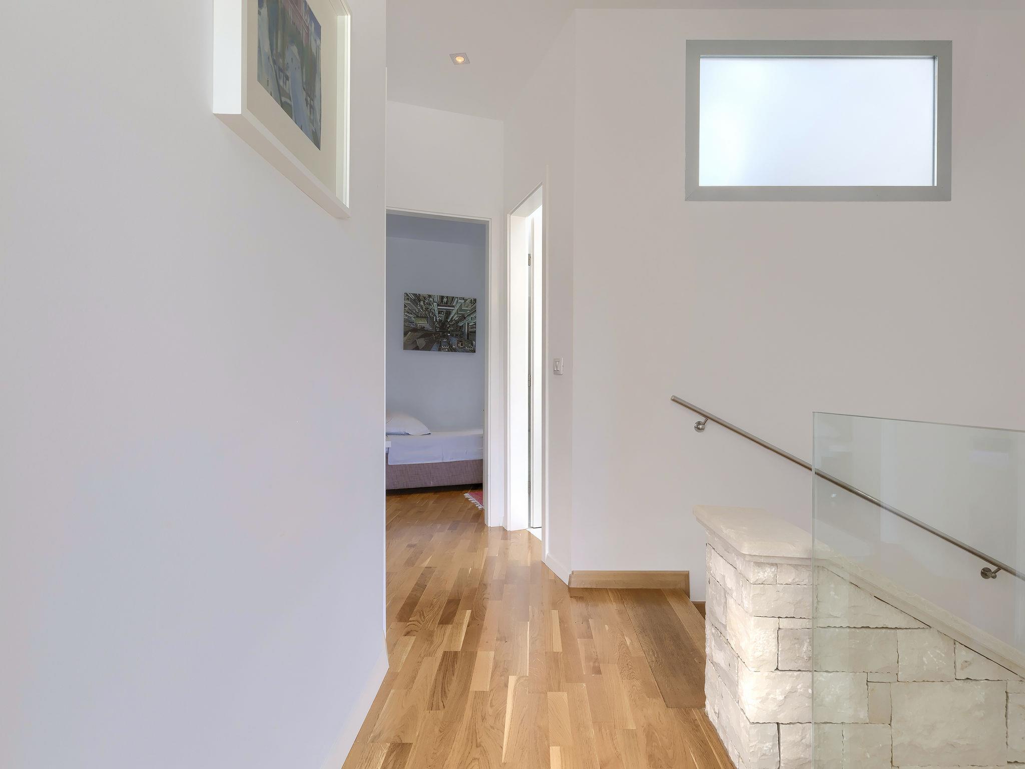 4-room terraced house 160 m2 on 2 levels. Living/dining room with open-hearth fireplace (only for decoration), satellite TV and air conditioning. Exit to the terrace. Open kitchen (4 hot plates, dishwasher, microwave, freezer). Shower/WC. On the lower ground floor: sep. WC. Upper floor: 1 room with 1 french bed (160 cm, length 200 cm), bath/bidet/WC, with corner bath and air conditioning. Exit to the terrace. 1 room with 1 french bed (160 cm, length 200 cm), air conditioning. 1 room with 2 beds (90 cm, length 200 cm), air conditioning. Shower/WC. Heating (extra). Terrace 20 m2, roofed, terrace 8 m2, roofed. Terrace furniture. View of the sea. Facilities: Internet (WiFi, free). Garage (2 cars). Maximum 1 small pet/ dog allowed.