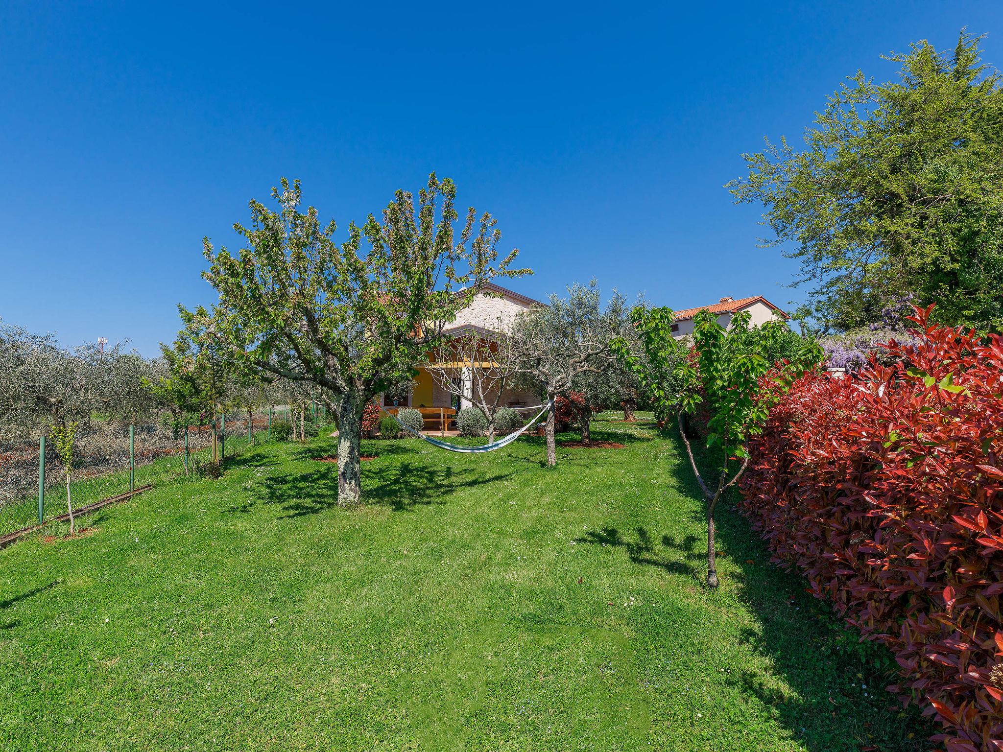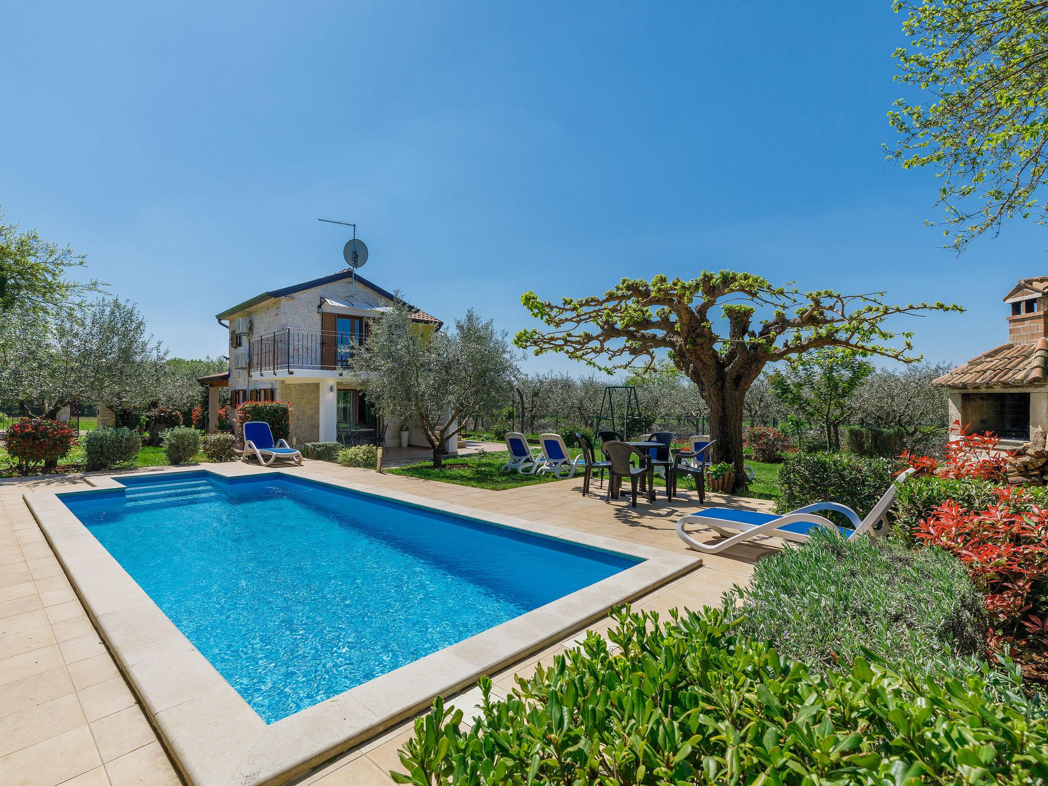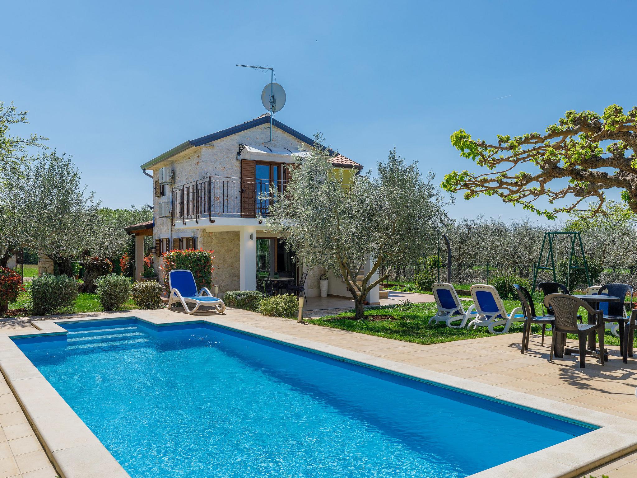 Old, child friendly country house "Marinko", 2 storeys, surrounded by trees. In the hamlet Kušci 6 km from the centre of Umag, outside the resort, in a quiet position, 1.5 km from the sea, 1.5 km from the beach, in the countryside. Private: property 800 m2 (fenced) with lawn, swimming pool angular (7 x 3 m, depth 140 cm, seasonal availability: 15.Apr. - 01.Oct.) with internal staircase. Terrace (30 m2), garden furniture, barbecue (swing). In the house: washing machine. Motor access to the house (250 m via unmade road). Parking at the house on the premises. Shop 1.5 km, restaurant 1.5 km, bus stop 2.2 km, pebble beach 1.5 km, rocky beach 1.5 km.