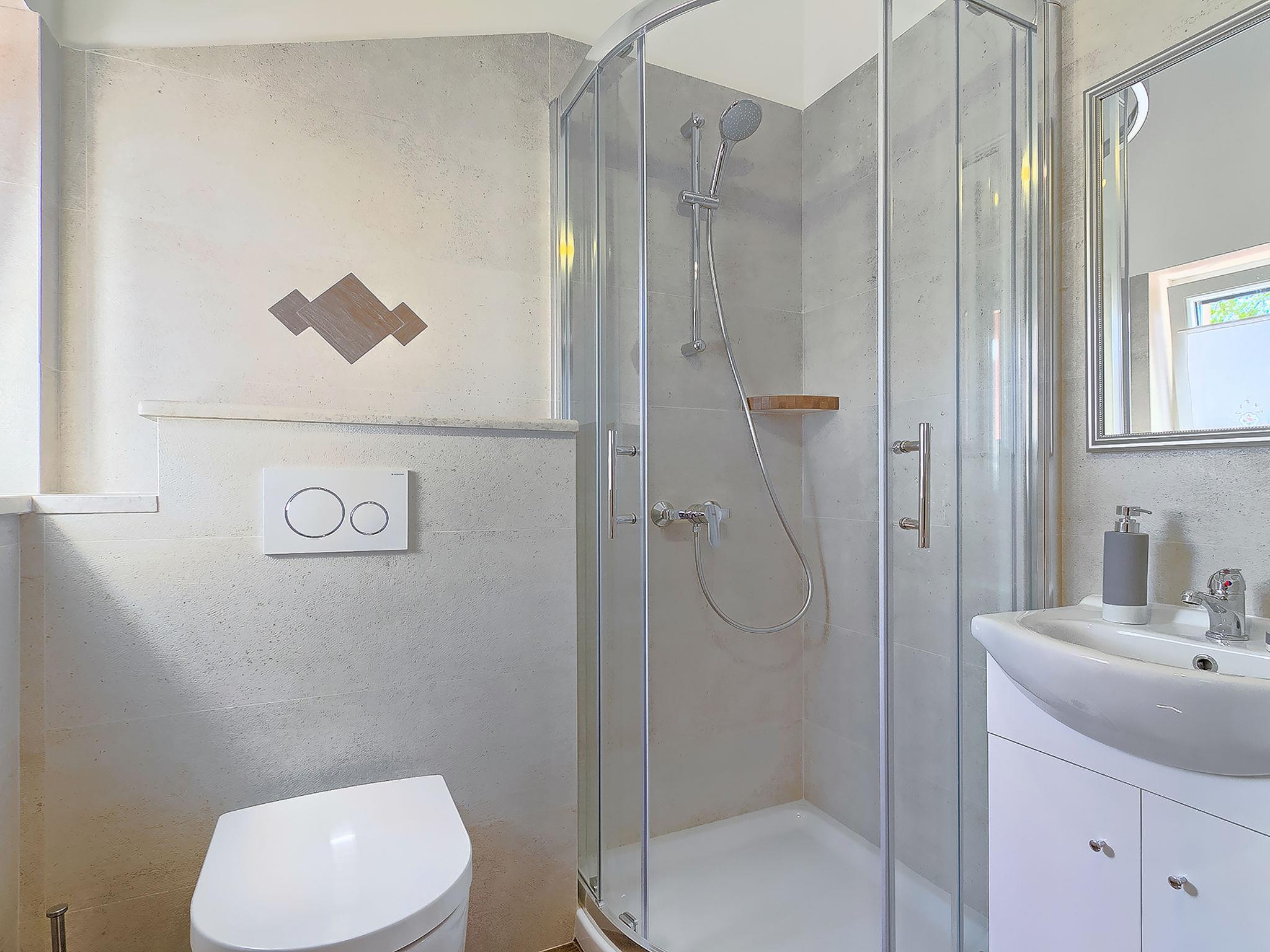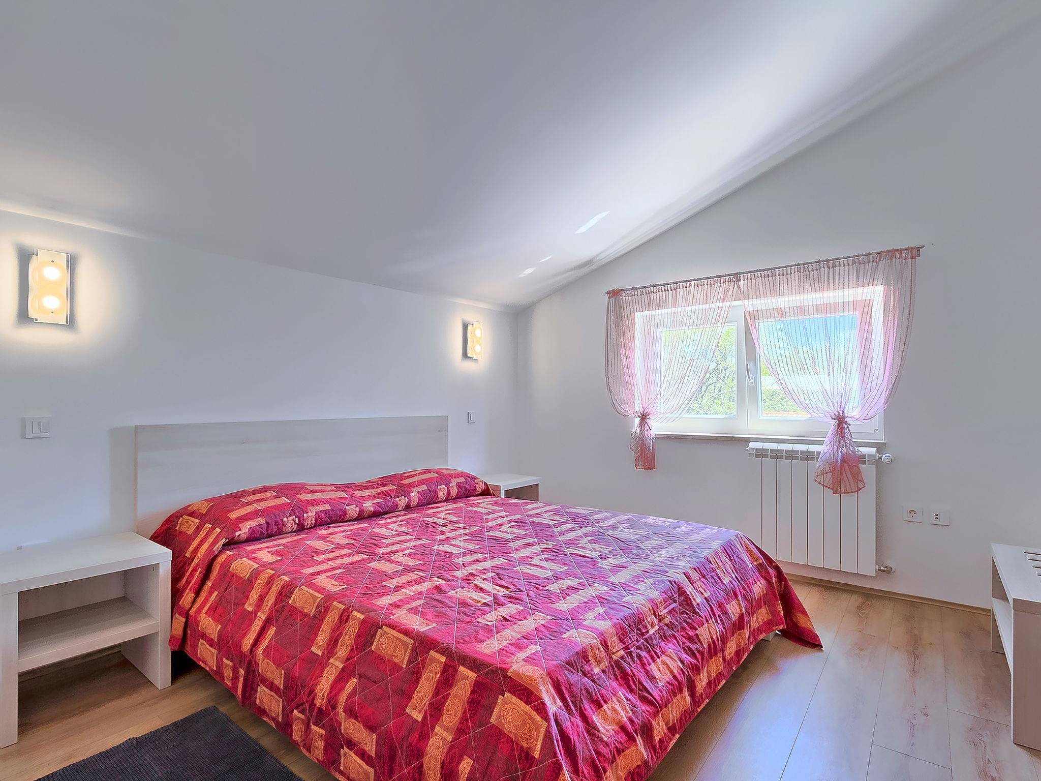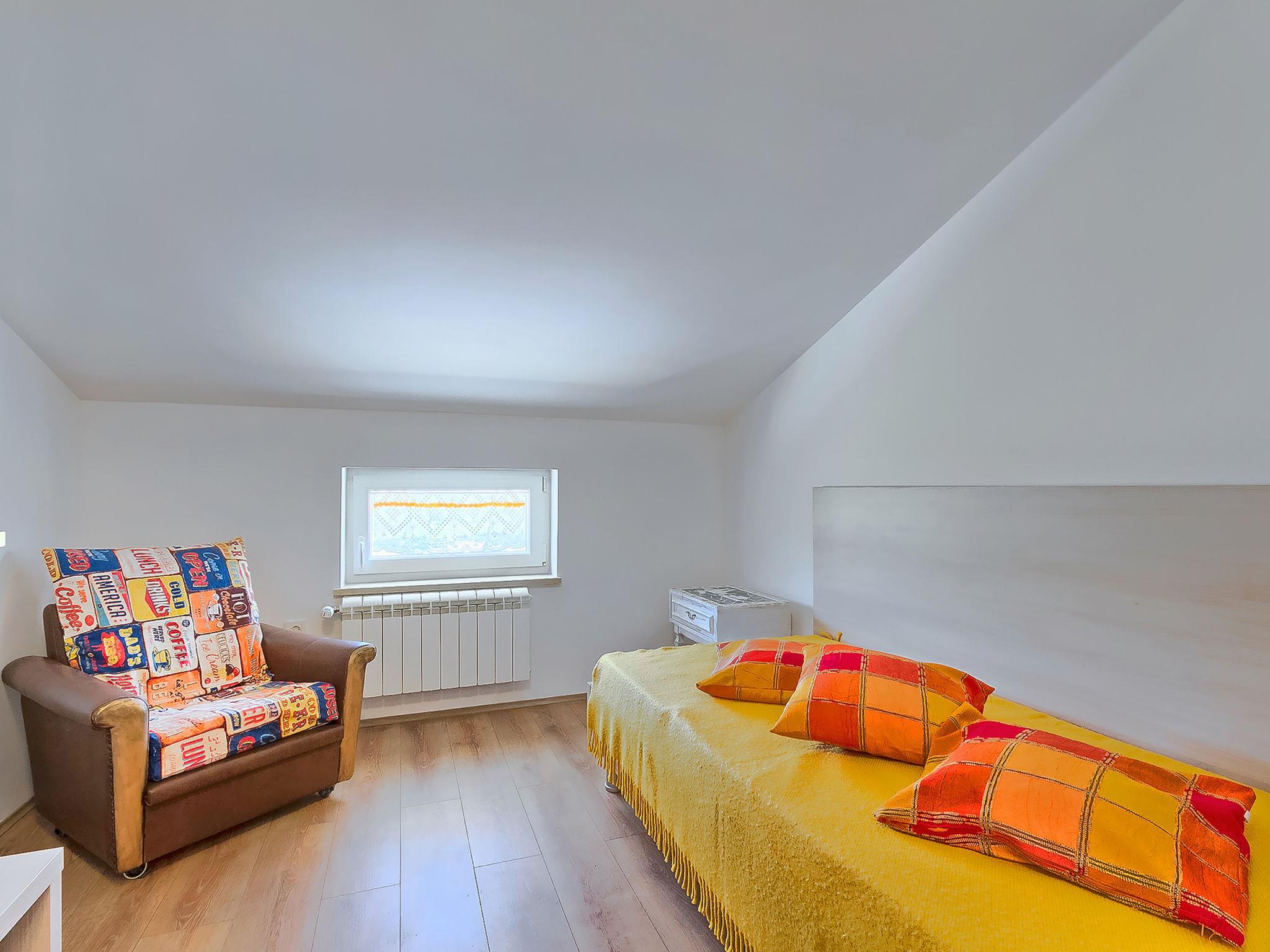 4-room apartment 124 m2, on the top floor. Living/dining room, with sloping ceilings, ceiling height 150 - 300 cm with 1 sofabed (160 cm, length 200 cm), satellite TV (flat screen), air conditioning. Exit to the terrace. 2 rooms with sloping ceilings, ceiling height 150 - 300 cm, each room with 1 french bed (160 cm, length 200 cm). 1 room with sloping ceilings, ceiling height 150 - 300 cm with 1 bed (90 cm, length 200 cm). With sloping ceilings, open kitchen (oven, dishwasher, 4 ceramic glass hob hotplates, microwave, freezer, electric coffee machine), ceiling height 150 - 300 cm. Shower/WC, shower/bidet/WC. Heating (extra). Terrace 20 m2. Terrace furniture, deck chairs. View of the swimming pool. Facilities: washing machine. Internet (WiFi, free). Please note: private entrance.