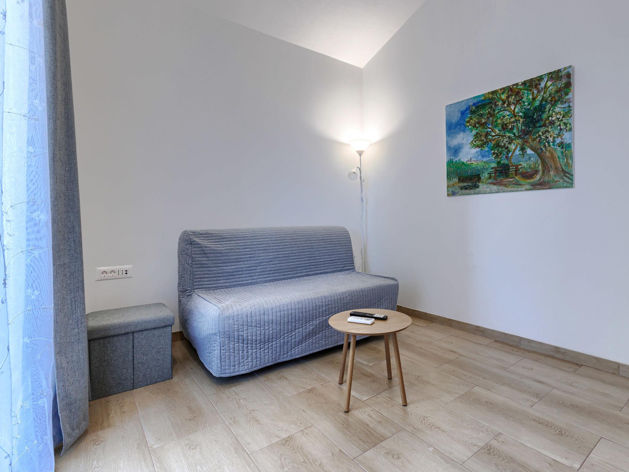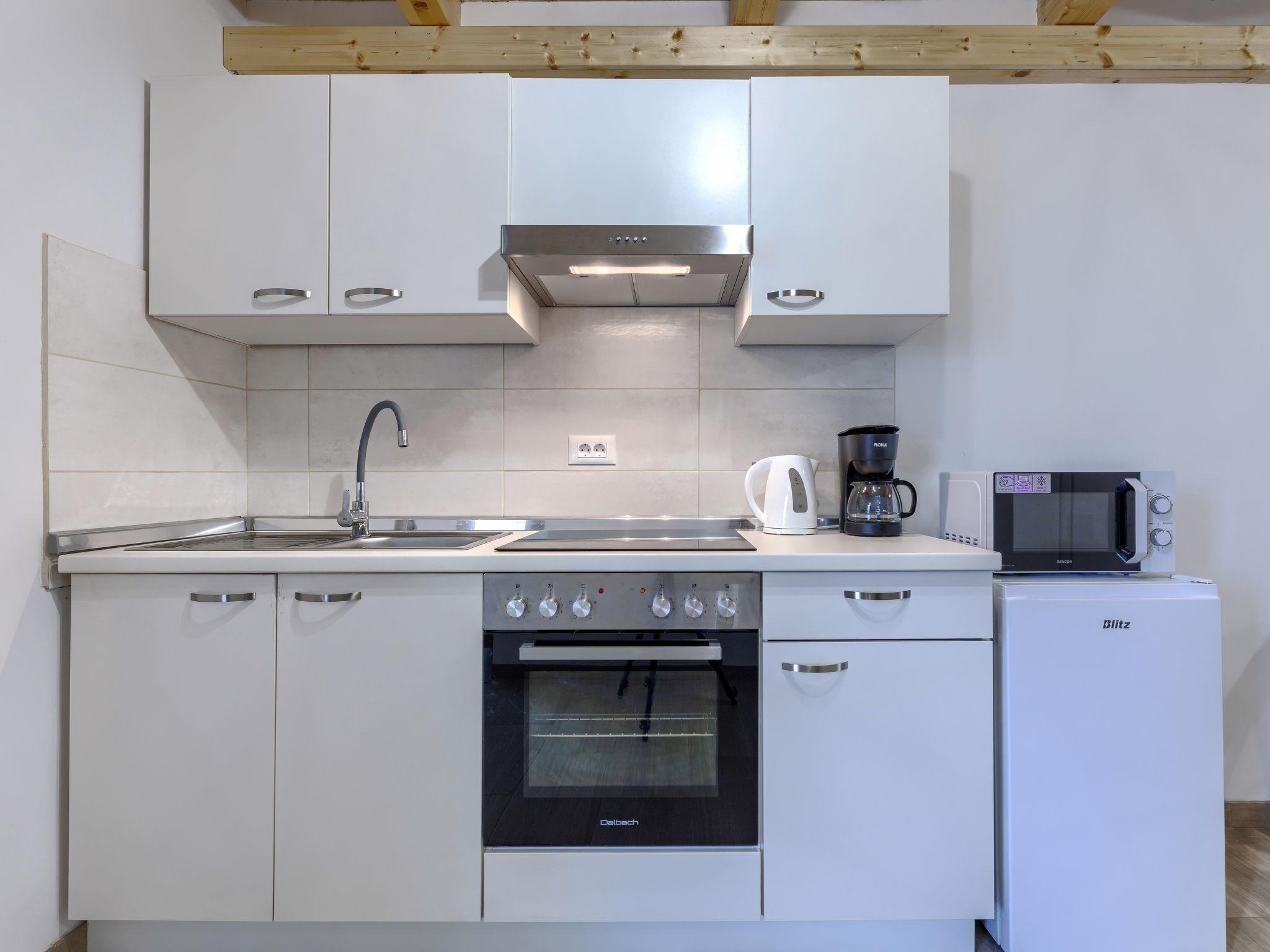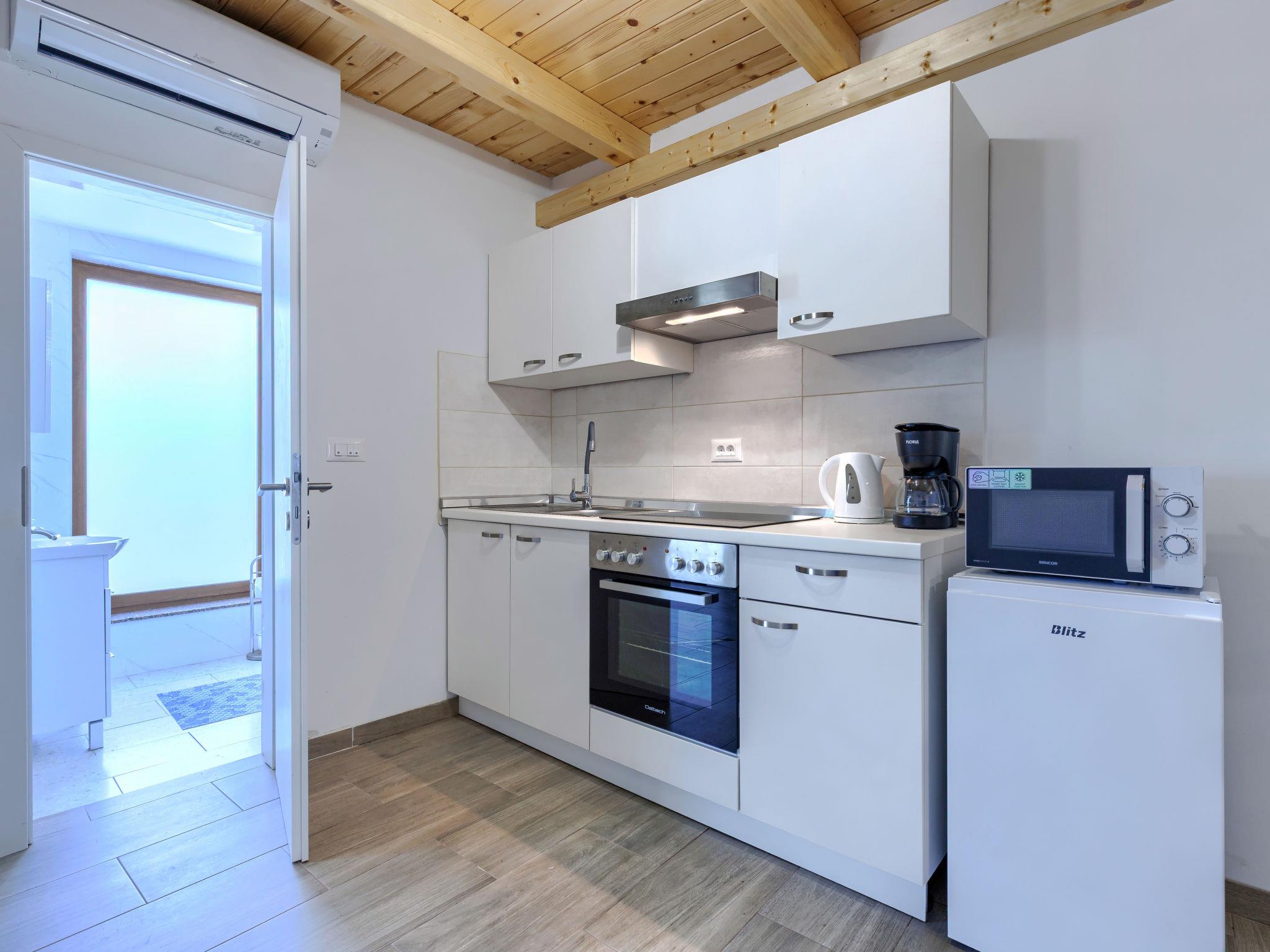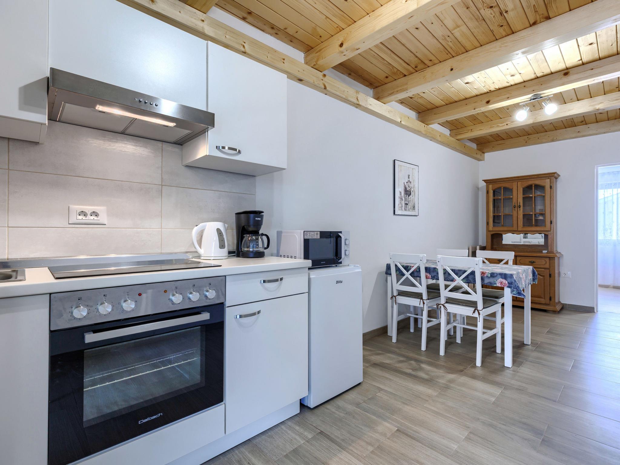 "Marija", 2-room apartment 42 m2 on 2nd floor. Living room with 1 double sofabed (140 cm, length 195 cm), satellite TV and air conditioning. 1 room 13 m2 with 1 french bed (180 cm, length 195 cm), air conditioning. Open kitchen (oven, 4 ceramic glass hob hotplates, toaster, kettle, microwave, electric coffee machine) with dining table, air conditioning. Shower/WC. No heating option. Beautiful view of the sea. Facilities: hair dryer. Internet (WiFi, free). Please note: non-smoking house.