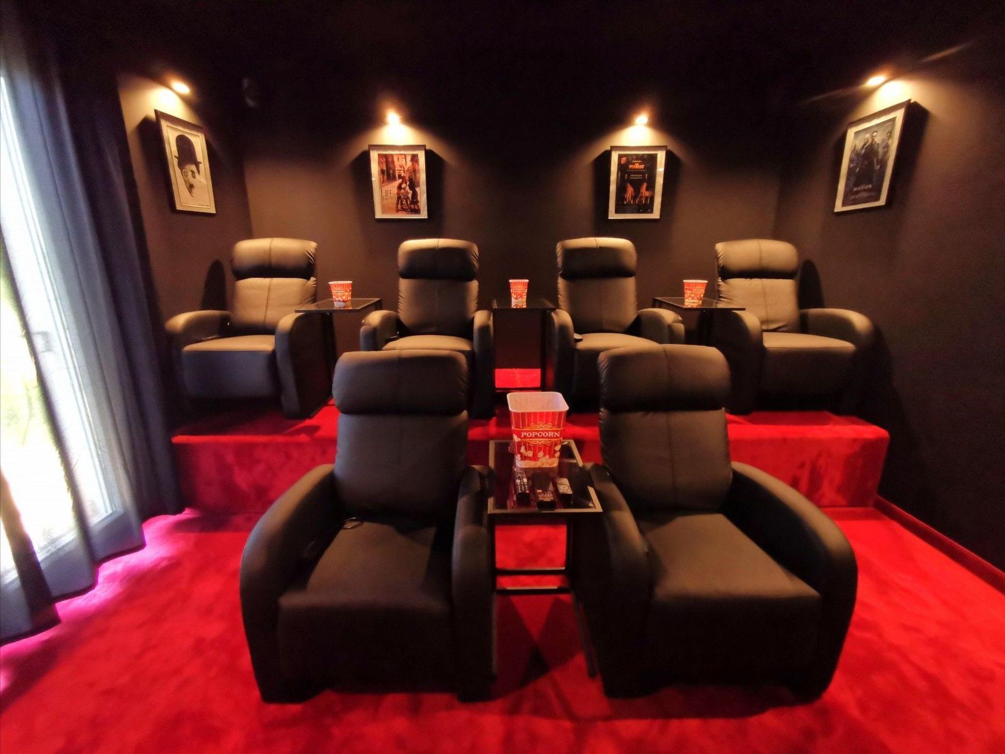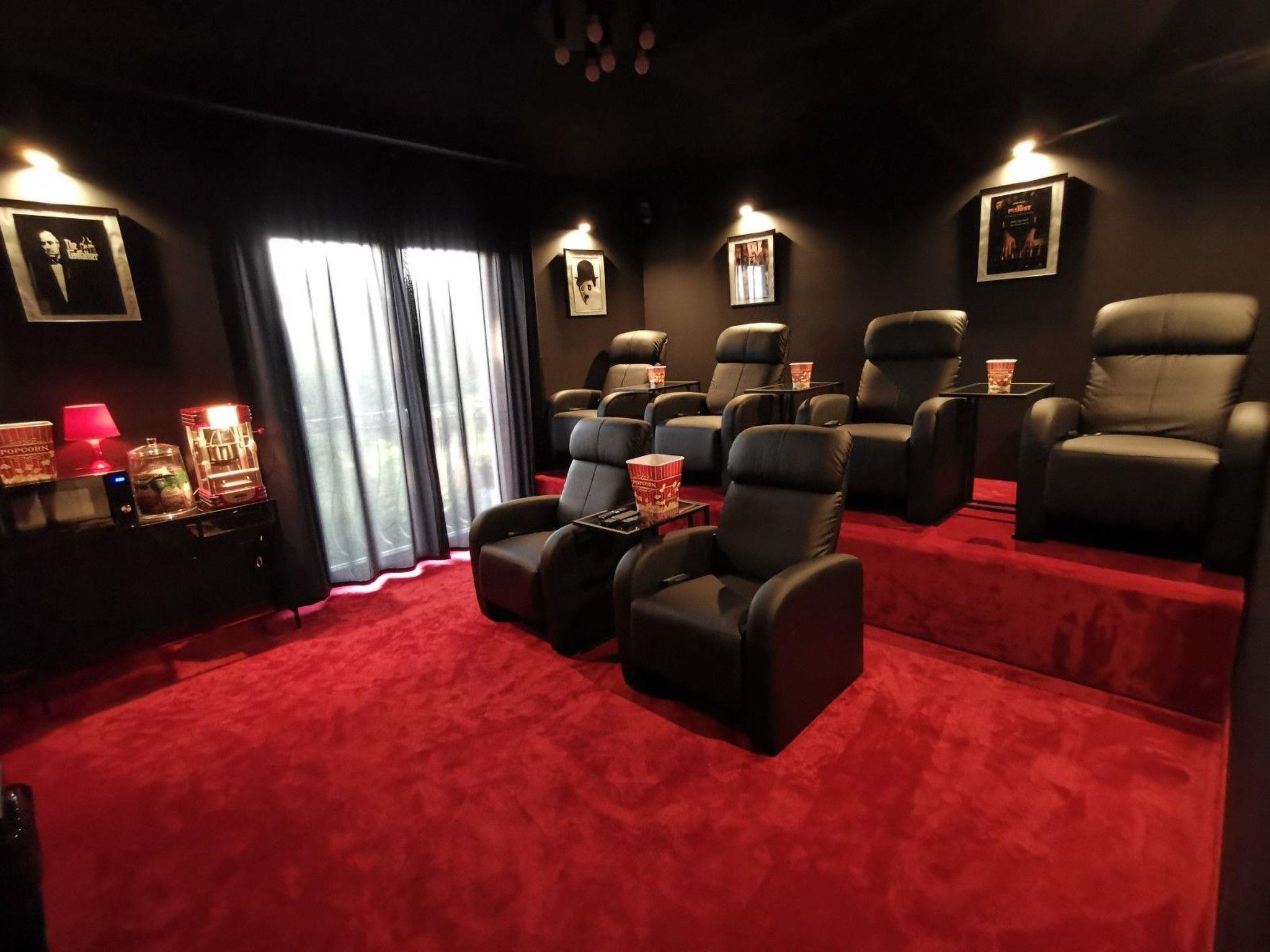 So let's introduce this magnificent villa, where 8 guests can be accommodated in 4 remarkable bedrooms where the dark detailed dreamy interior continues. Besides, there are also 3 stunning bathrooms. Villa Santo's interior is a true secret to discover – filled with a combination of moody colours over high-end contemporary furnishings and some special examples of statement lighting, this home looks like a truly sophisticated property. The living area is entirely open plan and offers everything for an amazing night, with kids playing on the PlayStation 4 or having a fun game night. The kitchen is fully equipped and beautifully designed with dark brown wood, as well as the dinning area. Film nights can be enjoyed in the incredible home cinema of this villa (there's of course a popcorn maker, for the wholesome experience) and the fun continues on the outside of villa Santo