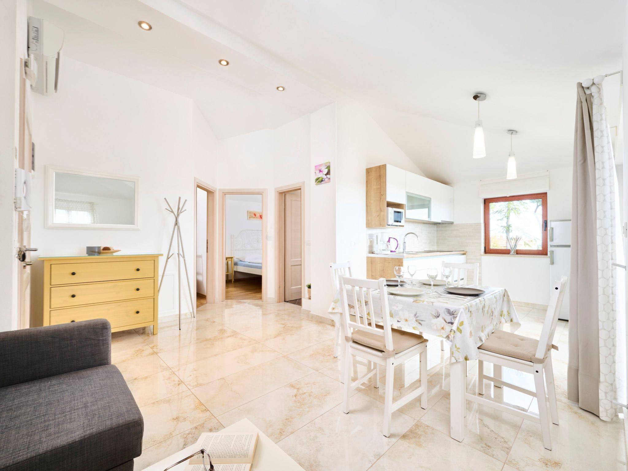 The interior of the flat is equipped with all the necessary amenities for a carefree stay. Located on the 2nd floor, it has two cosy bedrooms and a bathroom with a shower, ideal for cooling off after a day of adventures. Air conditioning in all rooms ensures a cool and comfortable environment even on the hottest summer days.