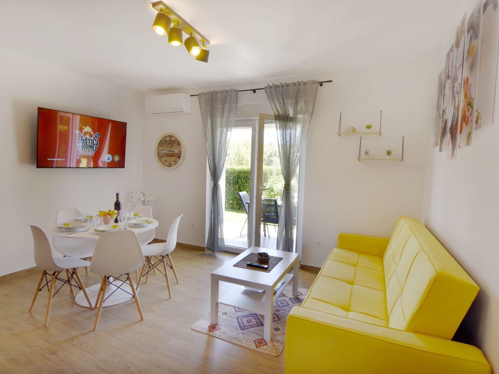 This spacious 75 m² flat is located on the ground floor of a house with two flats and offers a cosy and modern atmosphere. Upon entering, you will be greeted by a large, bright living room with a comfortable sofa bed, perfect for relaxing after a day of exploring. Enjoy your favourite shows on the flat-screen satellite TV or relax with the summer breeze thanks to the air conditioning. From the living area, you have access to the furnished balcony overlooking the pool and surrounding forest - the ideal spot for breakfast in the sun or a romantic dinner at sunset.