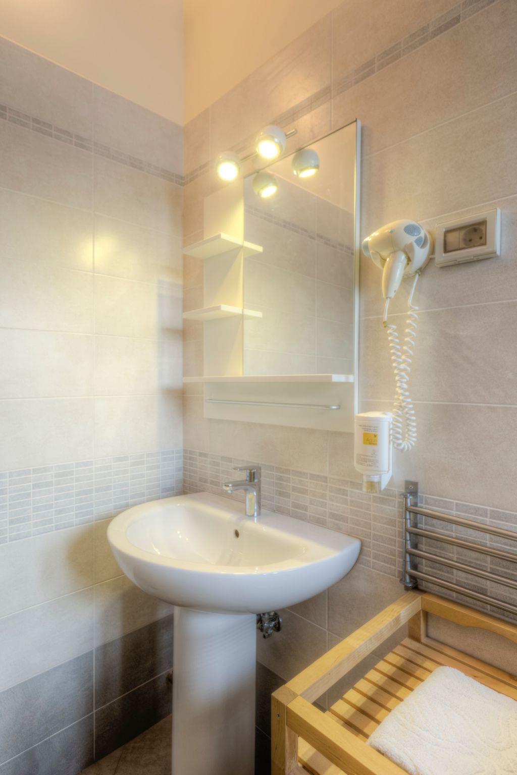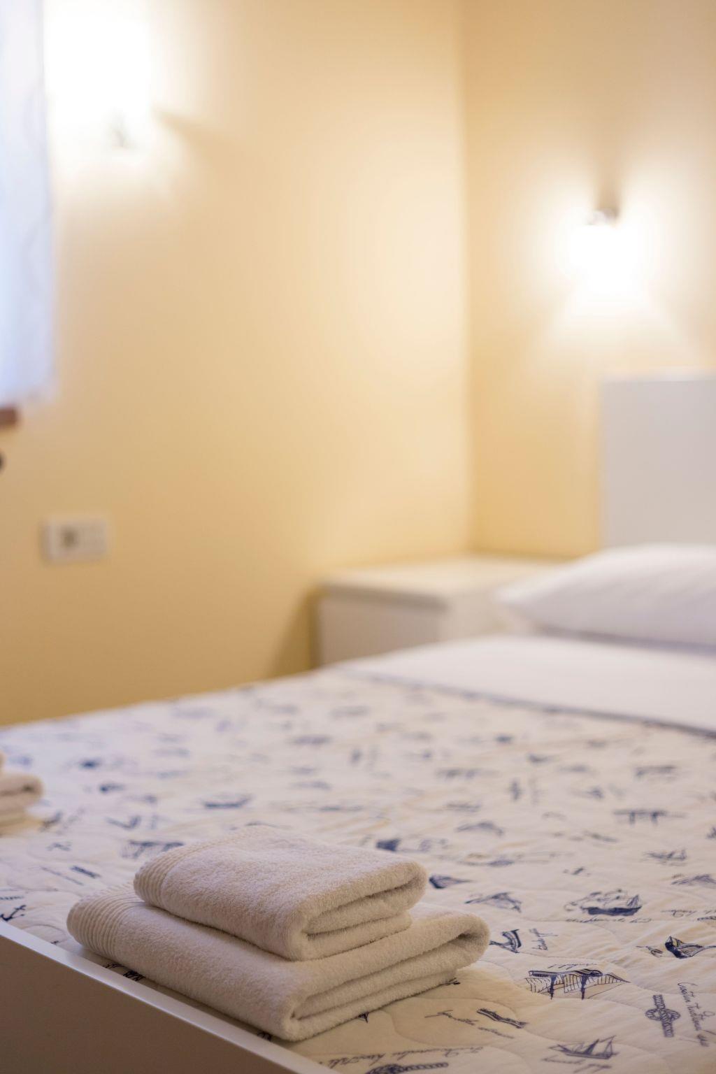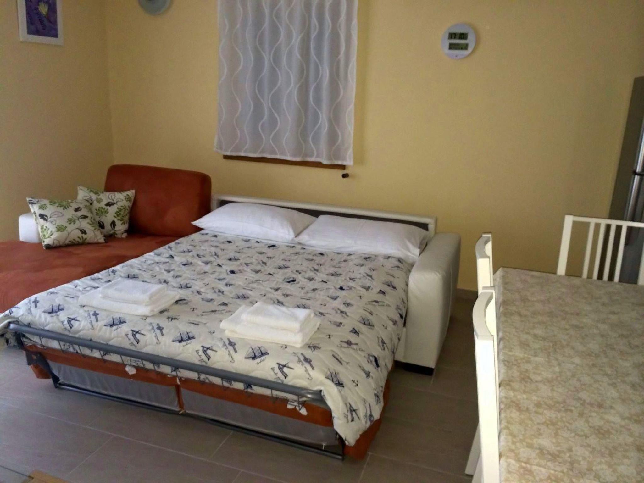 This apartment is modern and fully furnished. It is on the first floor and receives ample daylight. It has three rooms. Two bedrooms are with a double bed and one with a single bed of 120x200cm. There is also a sofa bed for children or teenagers in the living room. There is a fully-equipped, open kitchen with a living and dining area, with a dining table and chairs. Here there is also a TV with satellite reception and wireless Internet access is available. The two bathrooms have a shower and WC and there is also an outdoor shower. A hairdryer and an iron are provided.