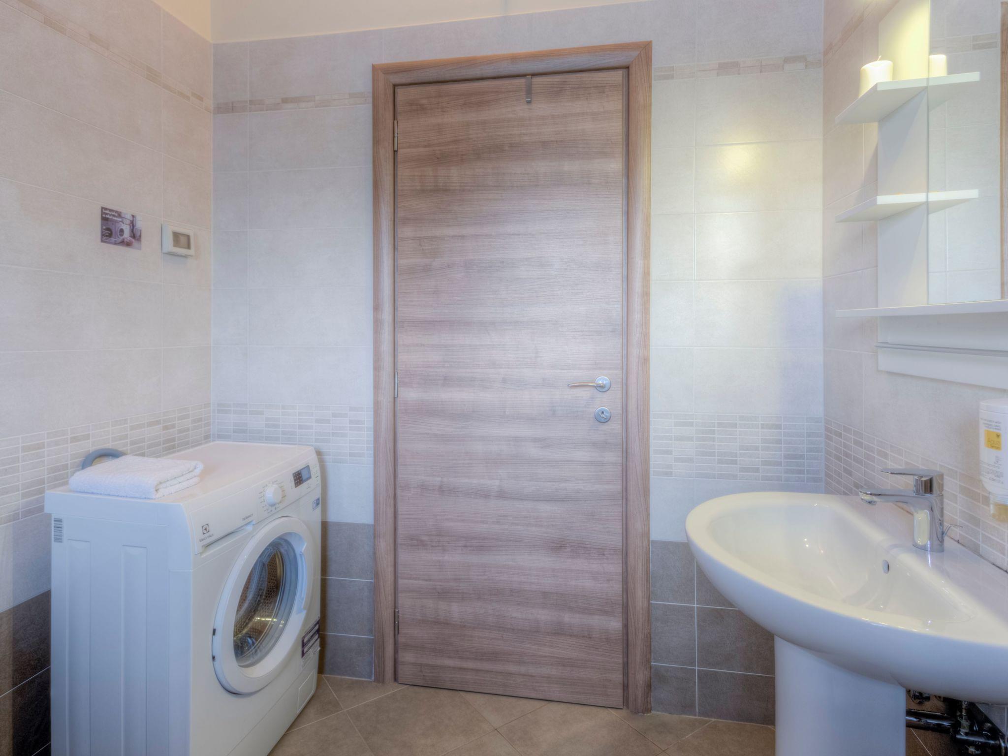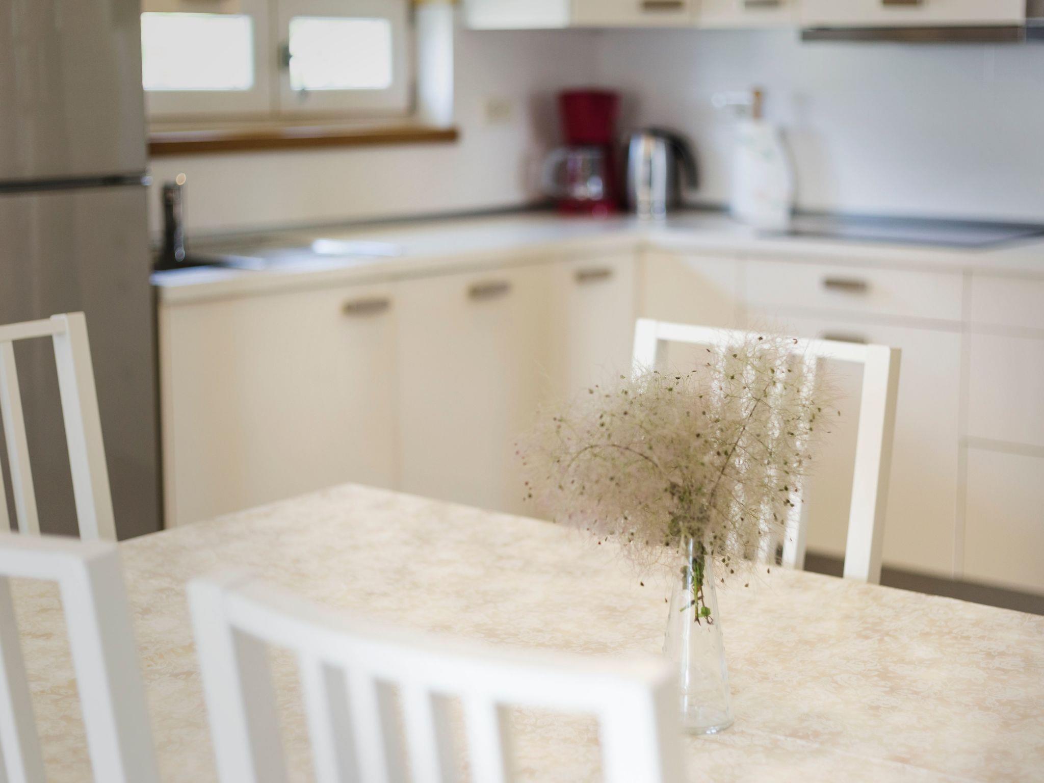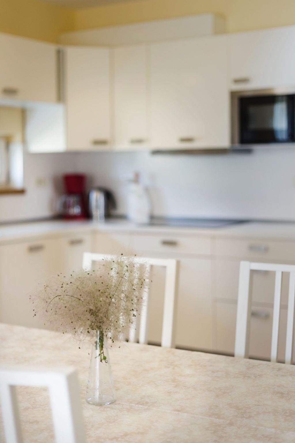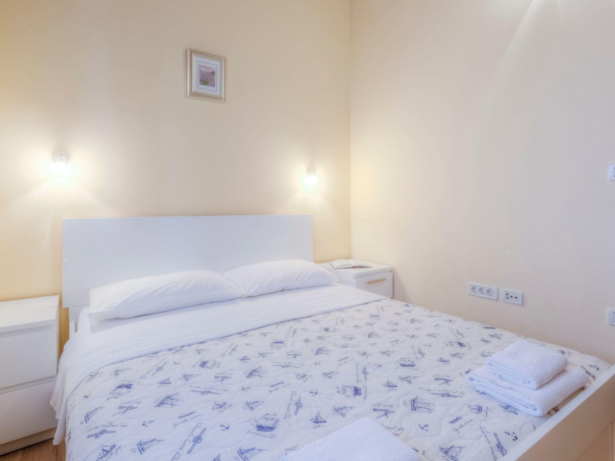This apartment is modern and fully furnished. It is on the first floor and receives ample daylight. It has three rooms. Two bedrooms are with a double bed and one with a single bed of 120x200cm. There is also a sofa bed for children or teenagers in the living room. There is a fully-equipped, open kitchen with a living and dining area, with a dining table and chairs. Here there is also a TV with satellite reception and wireless Internet access is available. The two bathrooms have a shower and WC and there is also an outdoor shower. A hairdryer and an iron are provided.