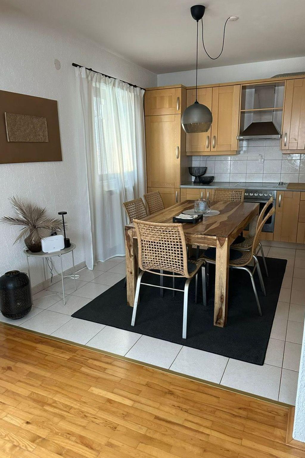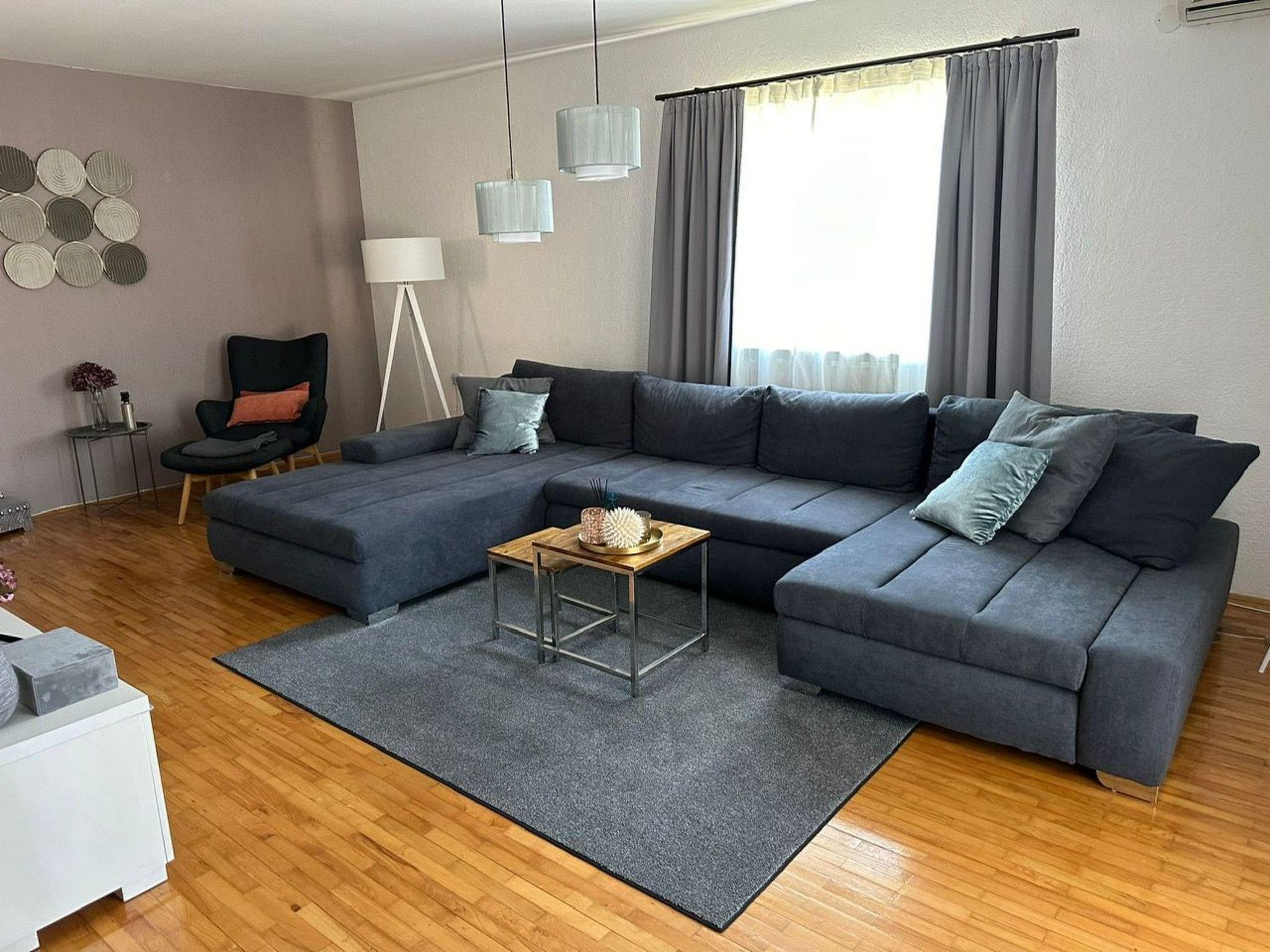 The entire house is on 2 floors with a basement and has a living area of approx. 300 m². The entire furnishing is very modern and corresponds to the European, somewhat higher standard. The ground floor offers a fully furnished bedroom with double bed and wardrobe, a living room with a very large couch and a relaxation corner for reading and relaxing, a flat screen TV (incl. satellite TV) and 2 air conditioning units. The adjoining fully equipped kitchen with ceramic hob, oven, dishwasher, microwave, coffee machine, dining area with dining table and 6 chairs, as well as an adjoining bathroom with shower and a separate guest toilet. The upper floor also offers just over 100 m² of living space. This includes 2 bedrooms (one of which has a TV (incl. satellite TV)) with double beds and a living room with a fully equipped kitchen with ceramic hob, oven and a small dining table with 4 chairs. In the adjoining open-plan living area, there is a very large double bed with sideboard and a shelf, and so that it does not get too hot, there are also 2 further air conditioning units available here. The basement consists of an entrance hall. A bathroom with shower and washing machine and a bedroom with a double bed and a separate single bed (suitable for a couple with a child).