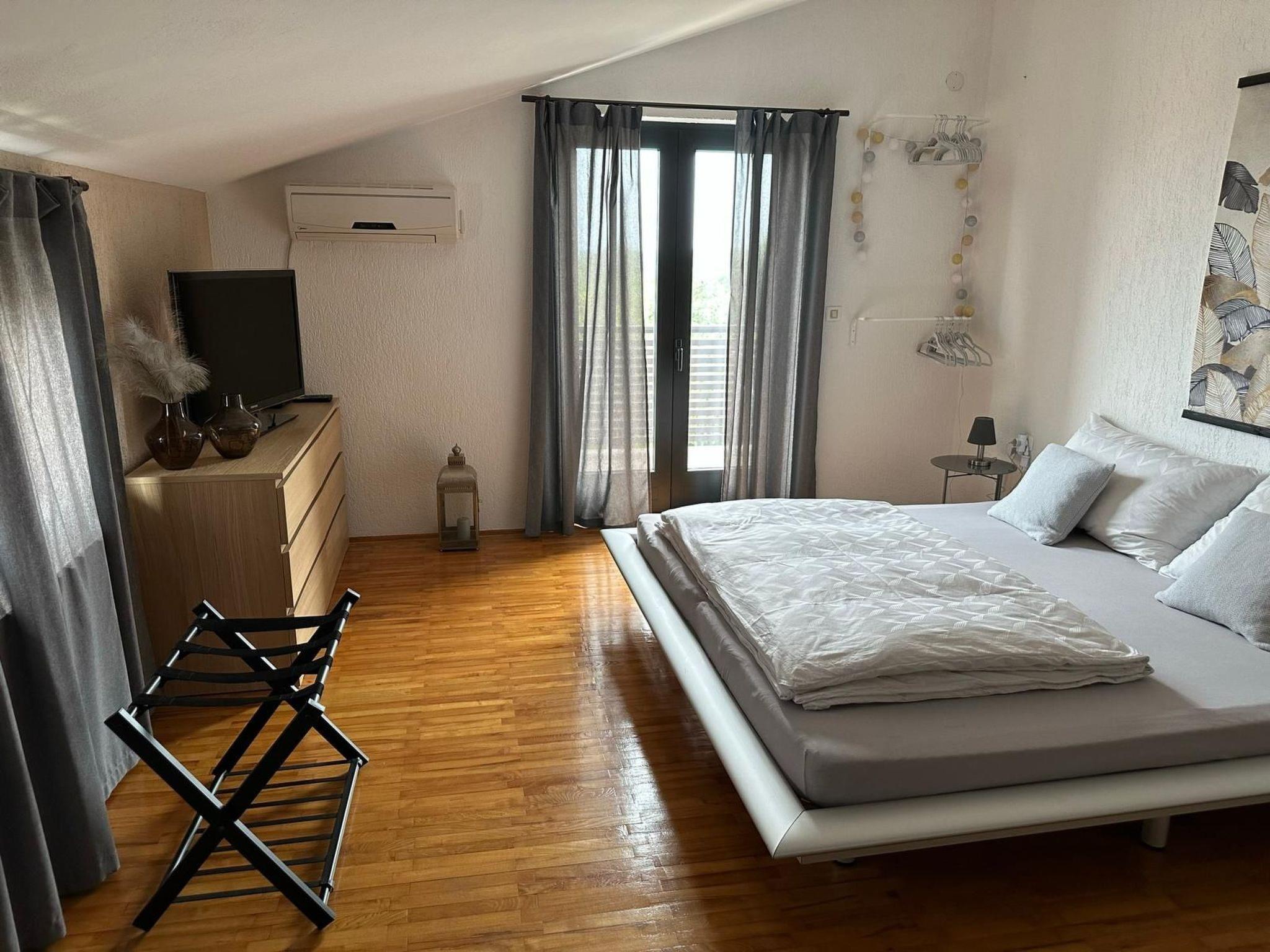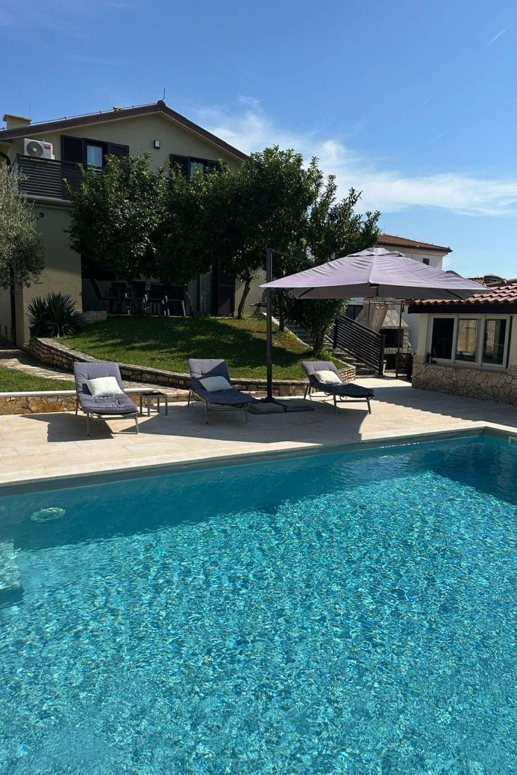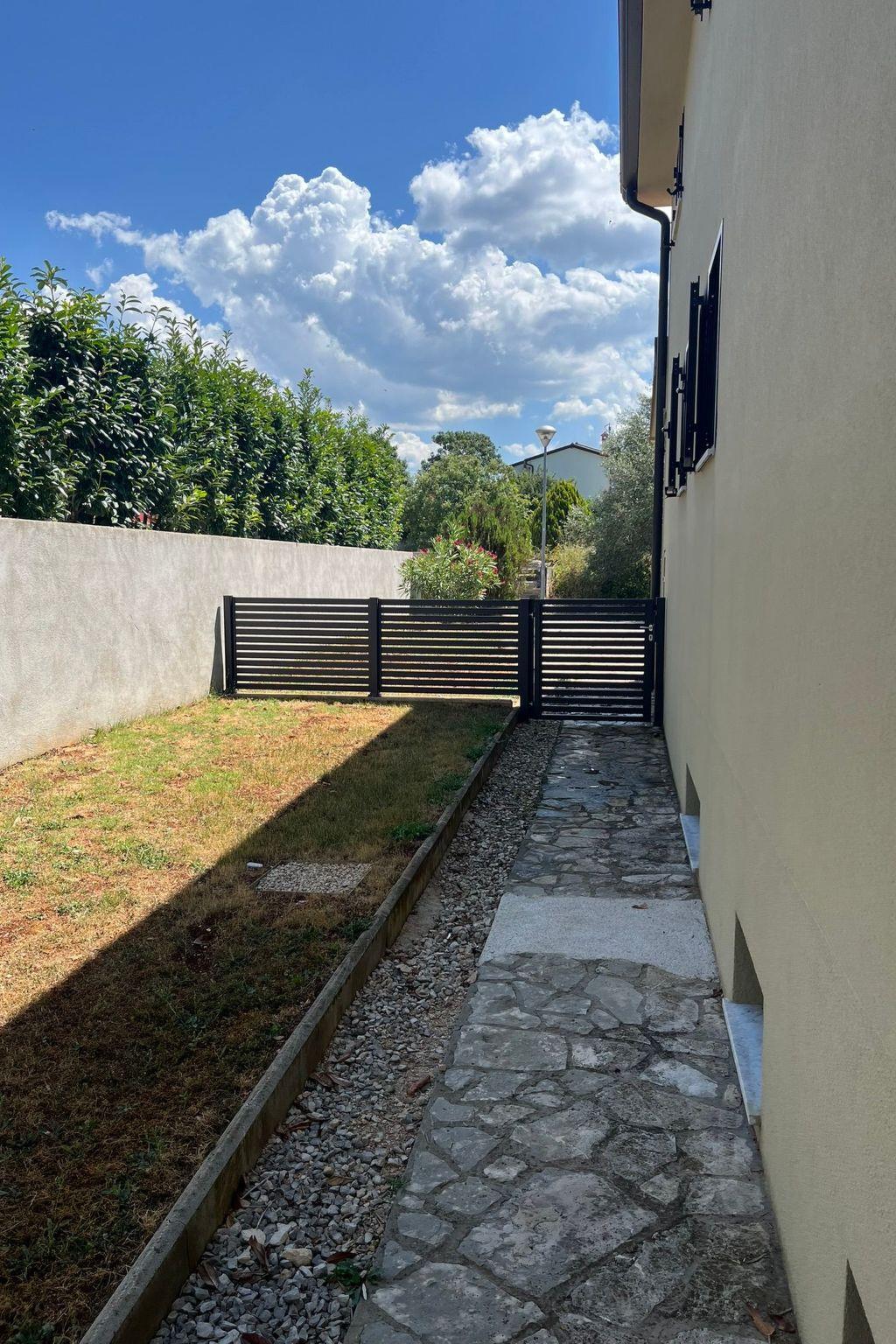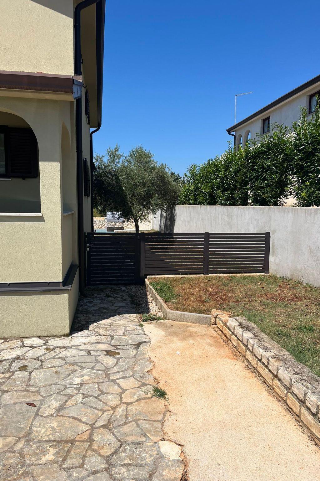 On the large terrace (which is accessible from the ground floor) you can sunbathe and sip a drink on the two garden loungers and two small tables. The upper floor also has a slightly smaller terrace with a wooden table and two chairs. This terrace is accessible from the living area and a bedroom. For cosy hours there is a barbecue with garden furniture in the garden, the associated fully equipped summer kitchen which is equipped with electric cooker, oven and dishwasher can be used. If it rains, you don't have to do without the barbecue, because you can sit together in the summer kitchen, which is furnished with beautiful rattan furniture. The property is completely fenced, from the street you can drive to the 3 parking spaces which are right in front of the main entrance. There is also a closed garage. As there is very little traffic on the road, the house is also ideal for children and dogs. The property is not suitable for wheelchair users as there are steps on one side of the house and from the terrace to the garden seating area. If required, a travel cot, cot, high chair or paddling pool can be set up for younger guests. The distance to the beach of the Stella Maris holiday complex is approx. 5 km and to the sandy beach of Zambratija 7 km. The latter is easily accessible by car. The car can be parked approx. 200 m from the beach. Various paved or stony paths lead there. For smaller errands you will find a small corner shop in Petrovija, which is 2 km away from Vilanija. There are various supermarkets and restaurants in the centre of Umag and in the surrounding area. Vilanija is a small suburb about 4 kilometres from Umag.