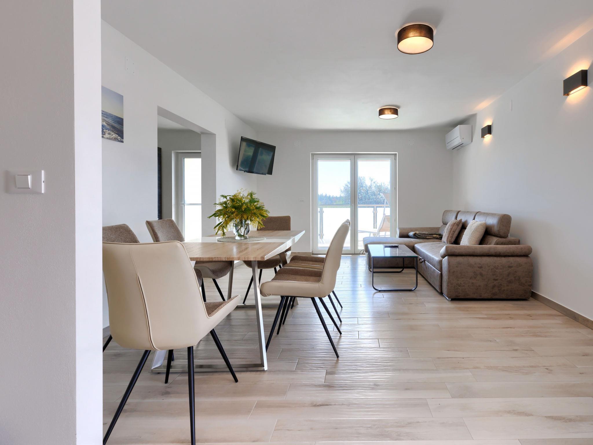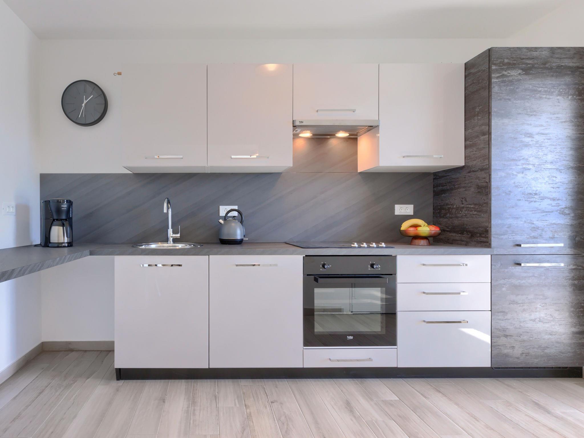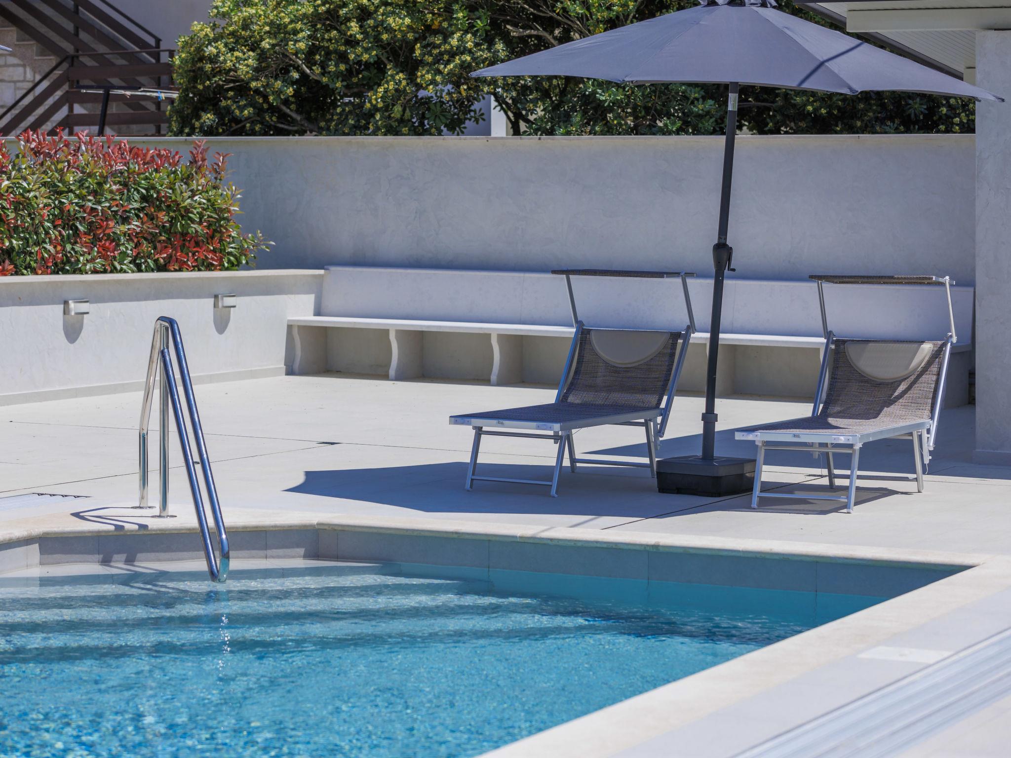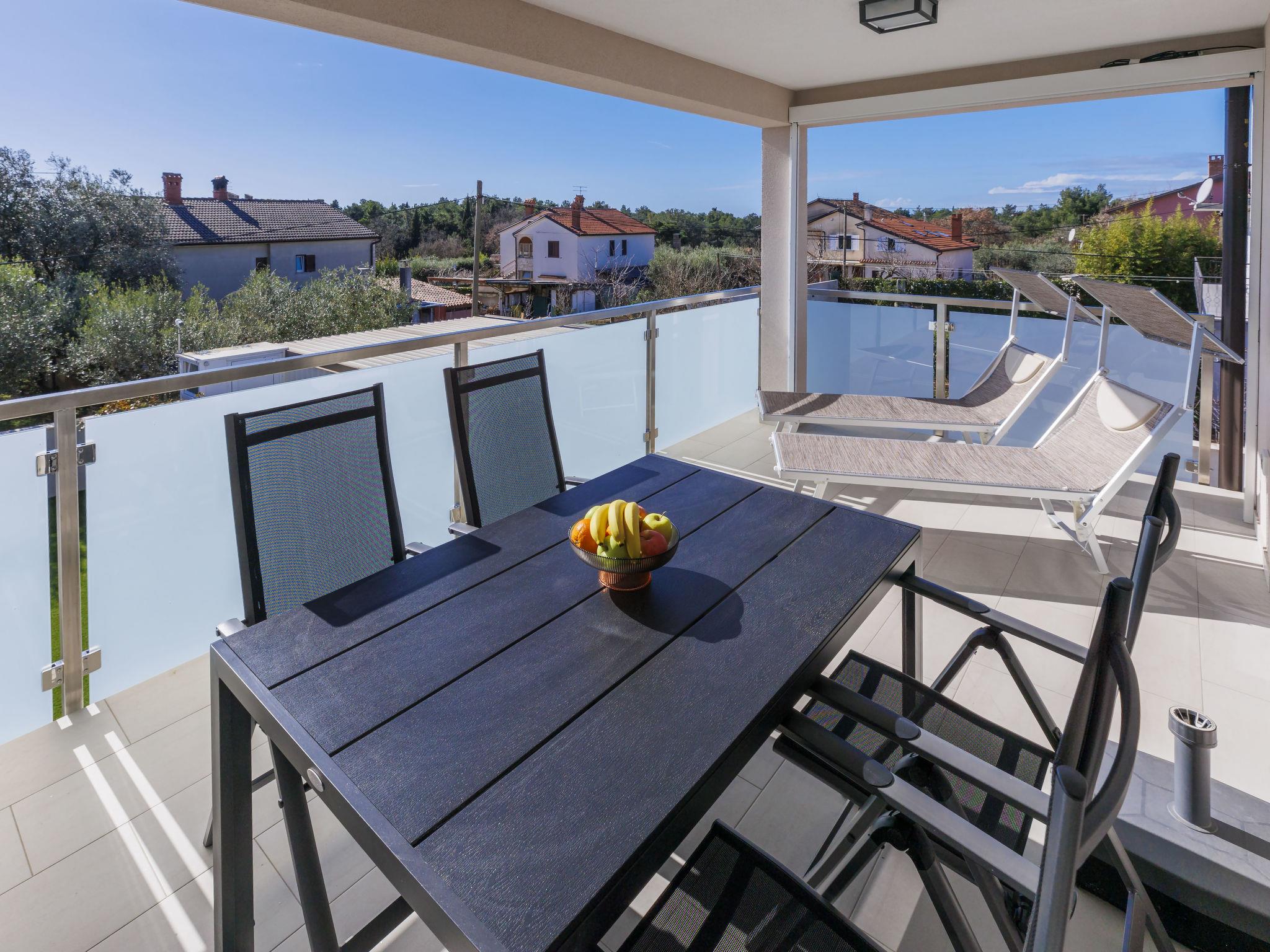 Murine 3 km from Umag: Apartment house "Villa Galici", built in 2022. In the hamlet Galici 1 km from the centre of Murine, in a sunny position, 2.5 km from the sea, 2.5 km from the beach. For shared use: property 1'000 m2 with lawn, swimming pool angular heated (10 x 5 m, depth 150 cm, seasonal availability: 01.Jan. - 31.Dec.) with internal staircase and shutter cover. Outdoor shower. In the house: internet access, table football. Parking at the house on the premises. Shop 1.5 km, restaurant 800 m, bus stop 4.1 km, pebble beach 2.5 km, rocky beach 2.5 km. Walking paths from the house 100 m, cycle lane 150 m. The owner does not accept any youth groups.