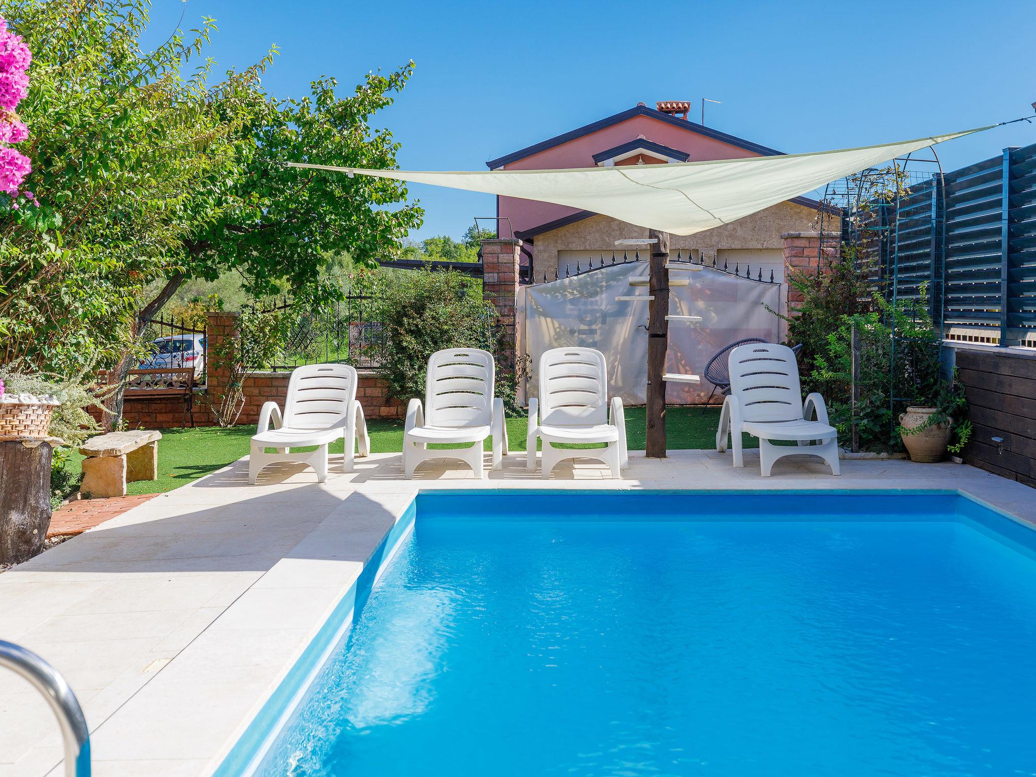 Murine: Beautiful 3-family house "Fontana". In the hamlet Fratrici 1 km from the centre of Murine, 3 km from the centre of Umag, in a quiet position, traffic calmed area, 2.5 km from the sea, 2.5 km from the beach. For shared use: property 500 m2 (fenced) with lawn, swimming pool angular (24 m2, depth 140 cm, seasonal availability: 23.May. - 28.Sep.). Outdoor shower, terrace (10 m2), barbecue (swing). In the house: internet access. Parking at the house on the premises. Shop 2 km, supermarket 3 km, restaurant 1 km, bus stop 5 km, railway station 33 km, sandy beach 2.5 km. Golf course (18 hole) 5.5 km, tennis 2.5 km, sports centre 2.5 km.