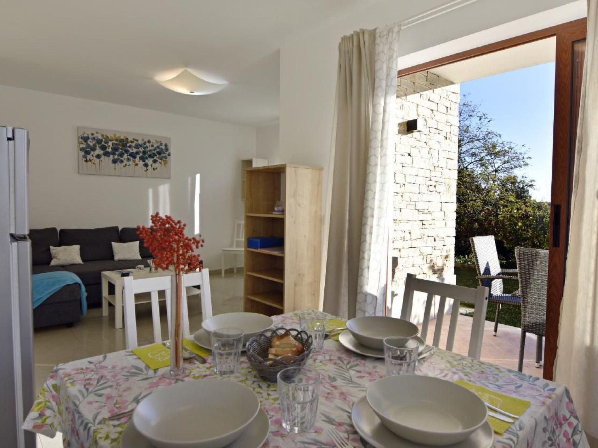 The flat is located on the ground floor of the house and has a bedroom with double bed (160 x 200), wardrobe, safe, a bedroom with bunk bed (2 x 80 x 200), wardrobe, in the living room the sofa bed (150 x 200), bed linen is provided (weekly change), flat screen satellite TV, coffee table, bathroom with shower, sink, washing machine, hairdryer, two towels per person for the bathroom are provided (weekly change), eat-in kitchen with dishwasher, microwave, 4 electric ceramic hobs, fridge with freezer compartment, kettle, coffee machine, dining table and chairs, free Wi-Fi, air conditioning, the kitchen leads onto the terrace (7 m 2) which is furnished with table and chairs A small private garden with views of the countryside. Ideal for enjoying coffee in the morning and admiring the surrounding nature or playing with the children.