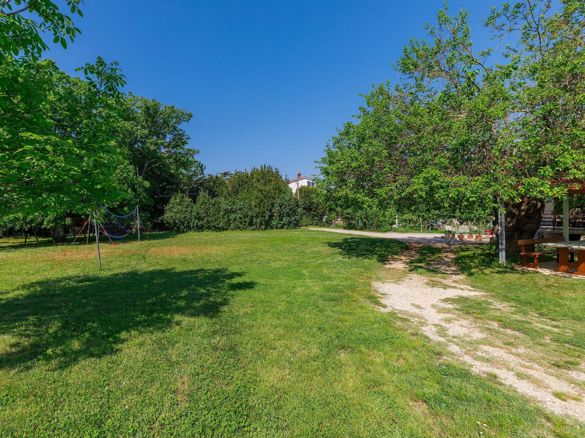 Apartment house "Vesela", surrounded by meadows. In a quiet, sunny position, 800 m from the sea, from the beach, in the countryside. For shared use: property 1'300 m2, garden with trees, meadow. Badminton, barbecue, children's playground (swing). In the house: internet access, trampoline. Parking at the house on the premises. Shop 1.2 km, restaurant 1.2 km, bus stop 8.2 km, shingle beach 1 km, rocky beach 800 m. Golf course (18 hole) 5 km, tennis 2 km, walking paths from the house 500 m. On the children's playground badminton net.