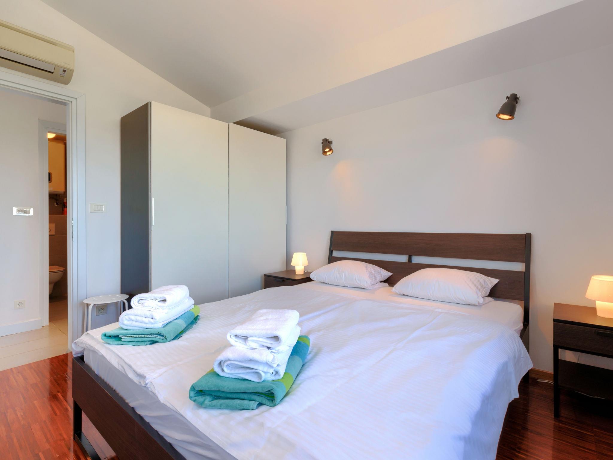 "Rak", 3-room apartment 68 m2 on 3rd floor. Cosy furnishings: living/dining room with satellite TV (flat screen), air conditioning. 1 room with 1 french bed (160 cm, length 200 cm), air conditioning. 1 room with 1 bed (80 cm, length 200 cm), 1 pull-out bed (length 200 cm), air conditioning. Open kitchen (oven, dishwasher, 4 ceramic glass hob hotplates, kettle, freezer, electric coffee machine). Shower/WC, sep. WC. Distant view of the sea. Facilities: washing machine, hair dryer. Internet (WiFi, free). Parking (1 car).