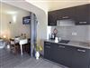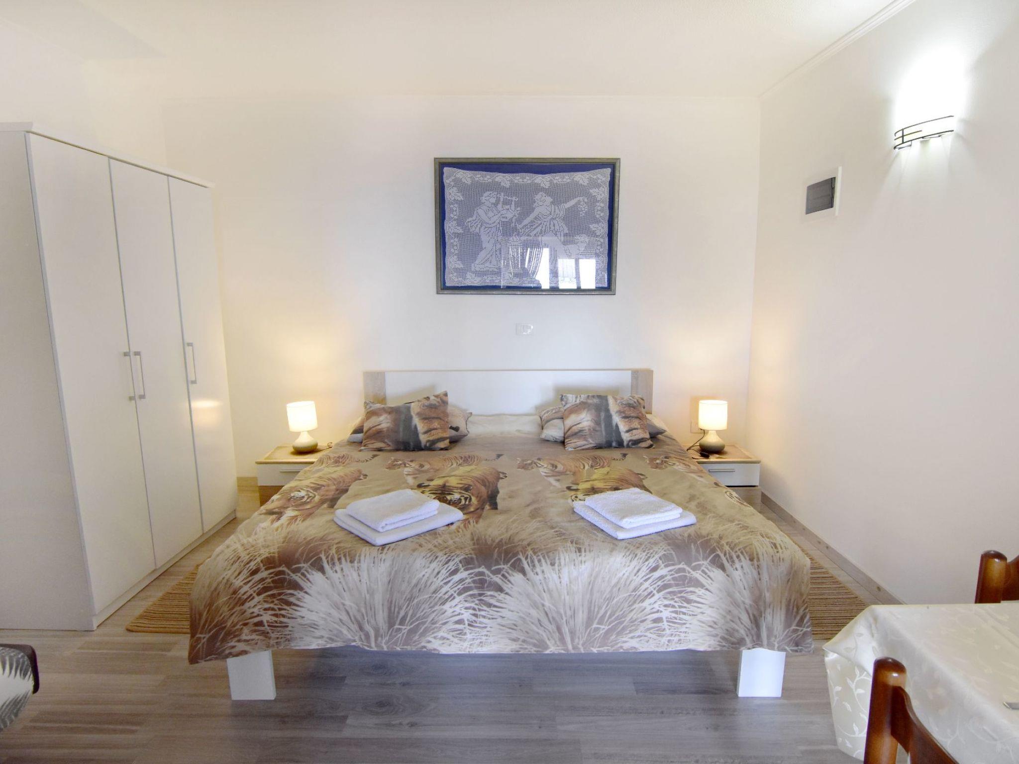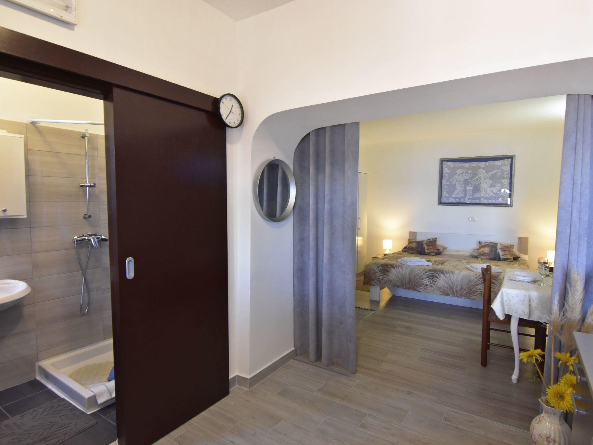 The studio apartment has a private terrace with table and benches at the entrance, a kitchen equipped with two electric cooking points, a kettle, a fridge, a dining table and chairs. The sleeping area has a double bed and a sofa bed for one person, bed linen is provided, wardrobe, air conditioner, flat screen satellite TV. The bathroom with shower, sink with mirror, toilet, towels for the bathroom are provided.
