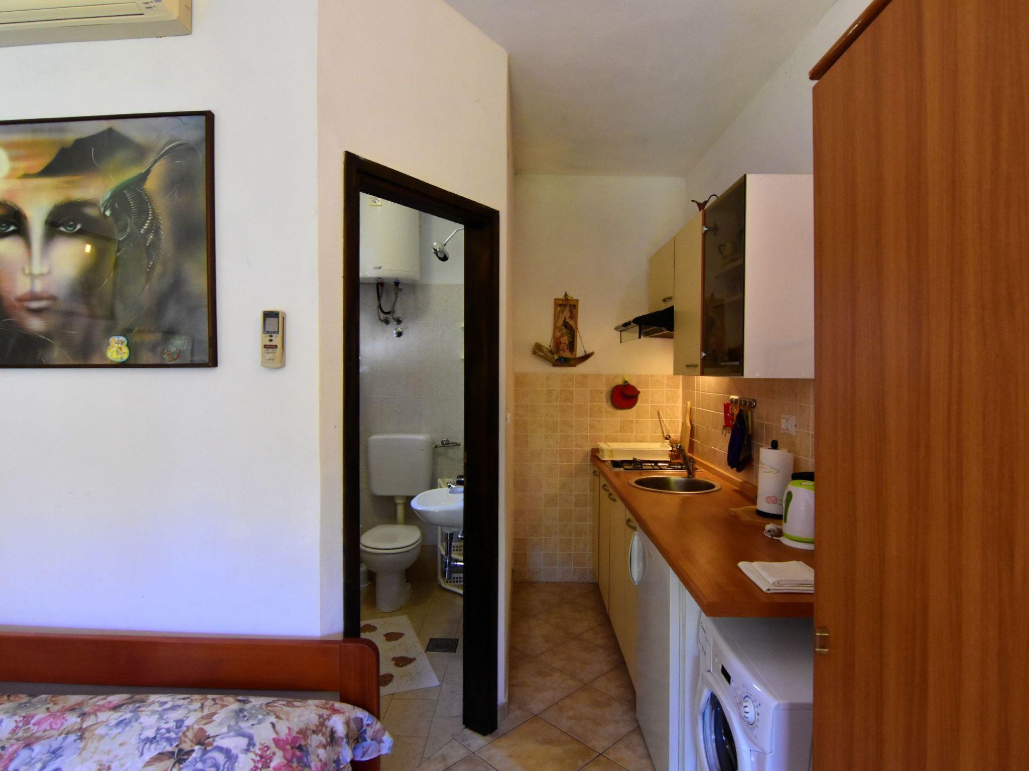 The simple, air-conditioned studio flat of 18 m2 is located on the ground floor of a detached house, surrounded by greenery, with a terrace overlooking the garden. The area is quiet, ideal for those who want to spend a relaxing holiday. The famous sandy beach of Zambratija is only 300 metres away and can be easily reached on foot, the grocery shop is 200 metres away. Ideal accommodation for couples looking for a relaxing break.