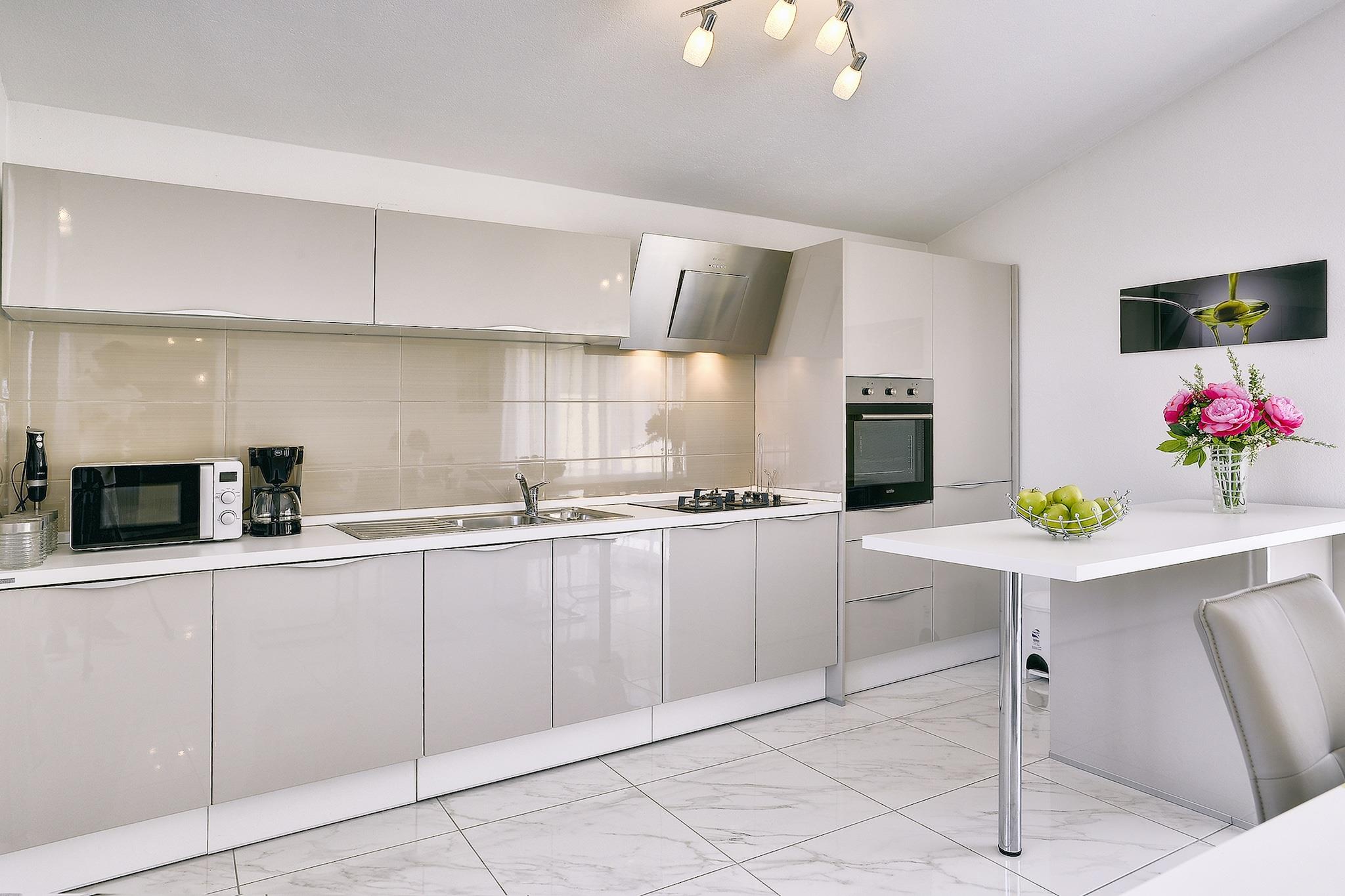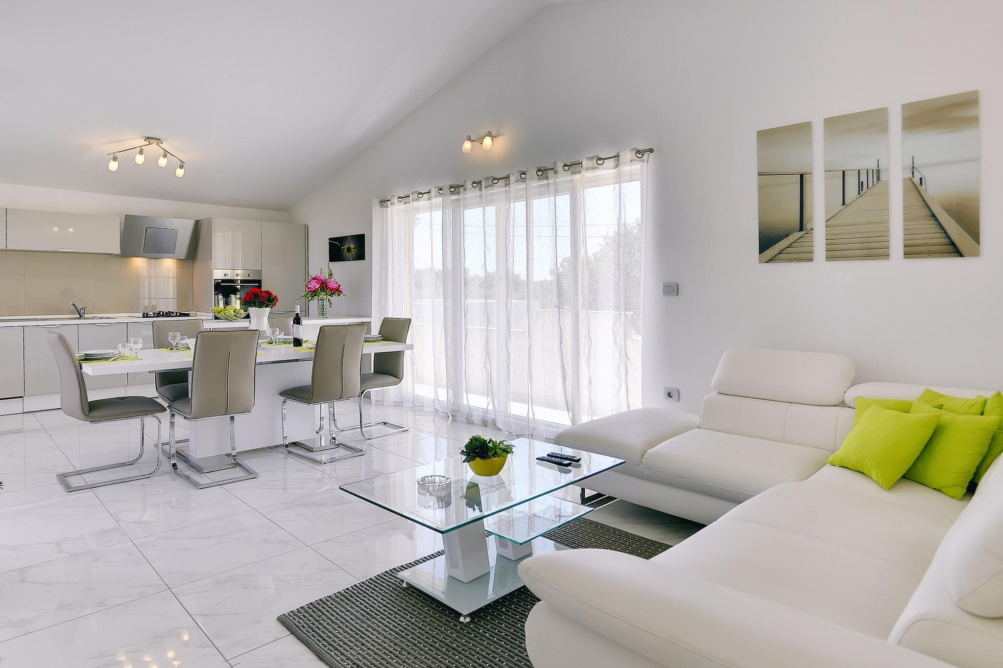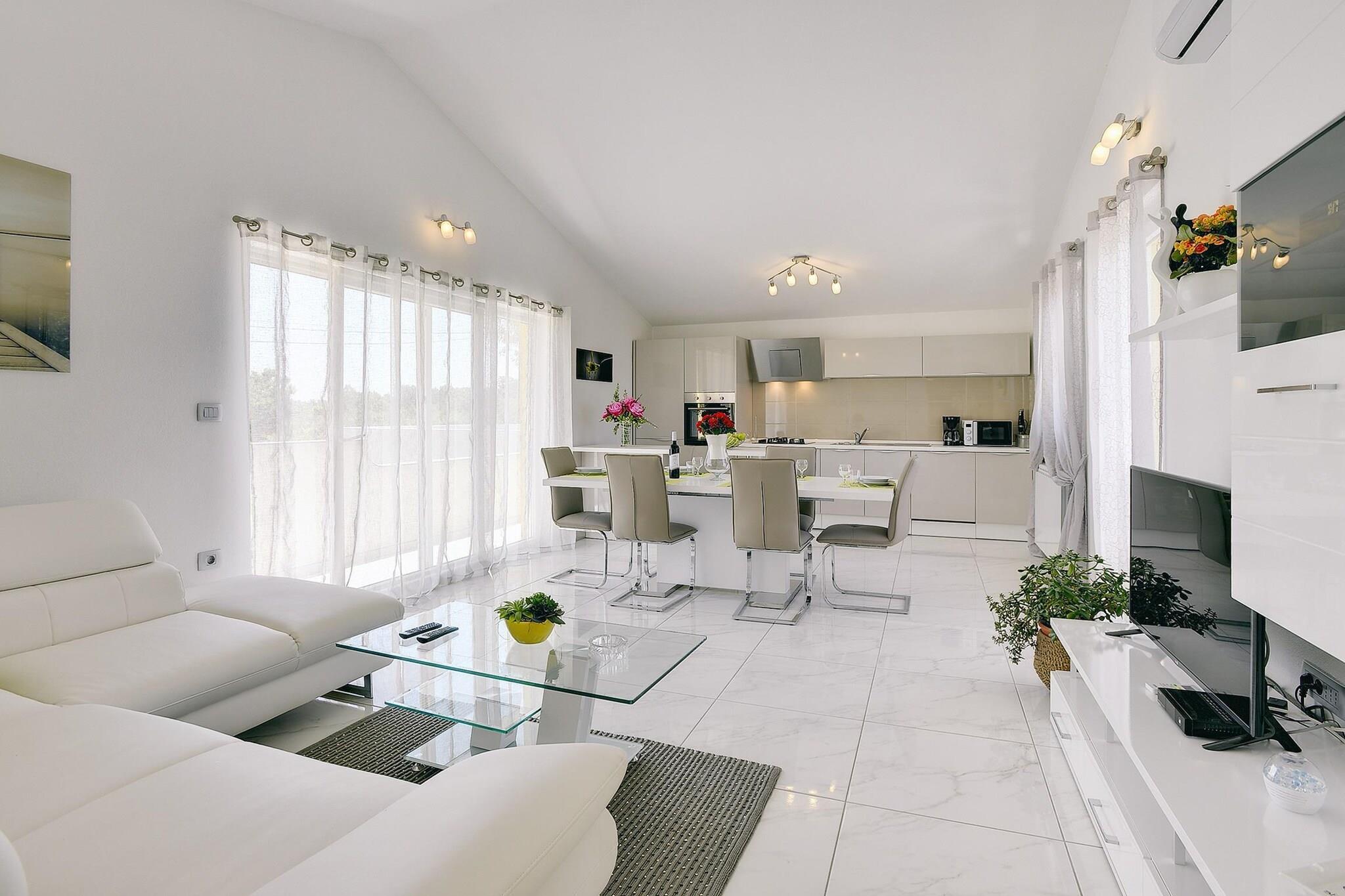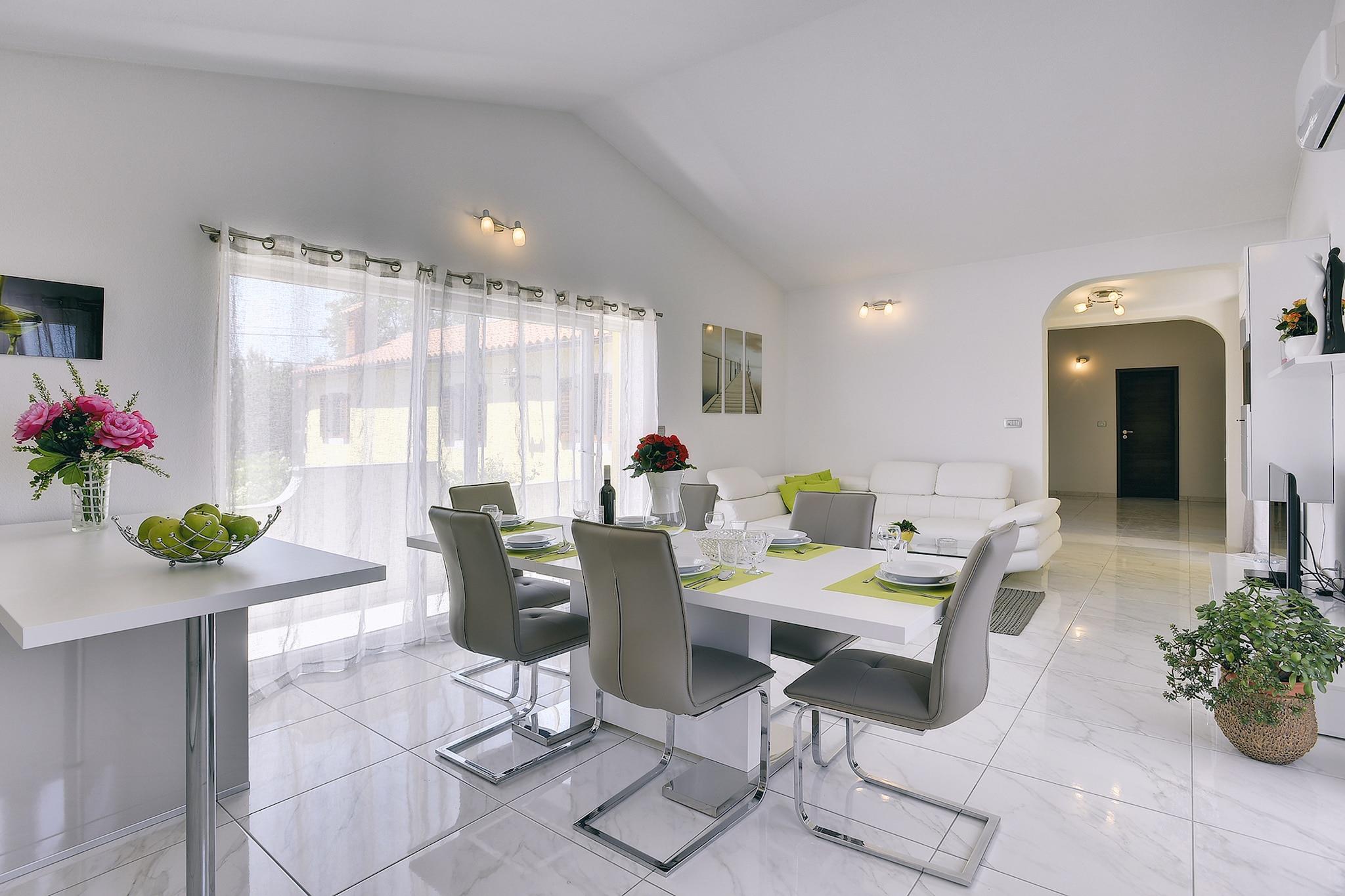 Denne hyggelige ferielejlighed, omgivet af blomster og oliventræer, ligger i den rolige by Valtura. Stranden ligger kun 3 km væk, og den kulturelle by Pula, med dets historiske centrum, ligger 10 km væk. Der er flere monumenter i denne hyggelige by, herunder et amfiteater fra romertiden, dejlige restauranter og butikker. Martina Lejligheden har et moderne, lyst interiør med neutrale farver. På første sal er der en stue med to soveværelser og et badeværelse. Denne etage har også en balkon med storslået udsigt over omgivelserne. For de yngste gæster er der en legeplads i haven og en overdækket terrasse.